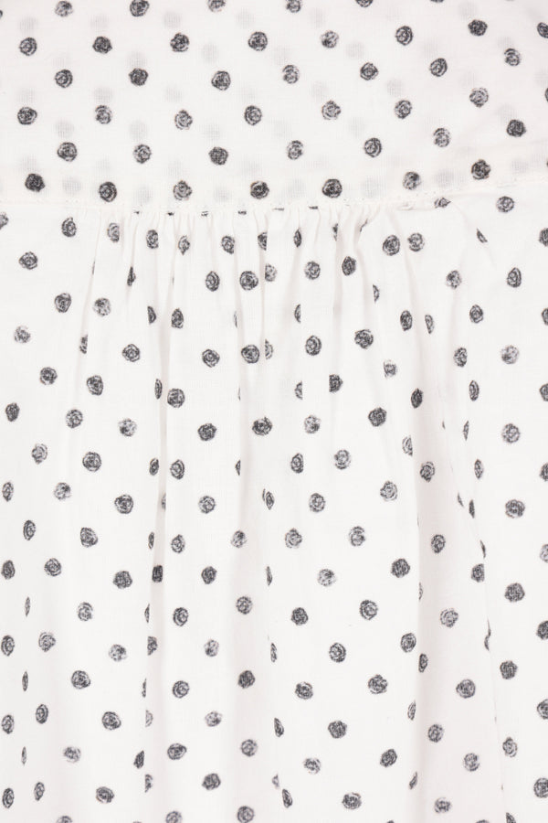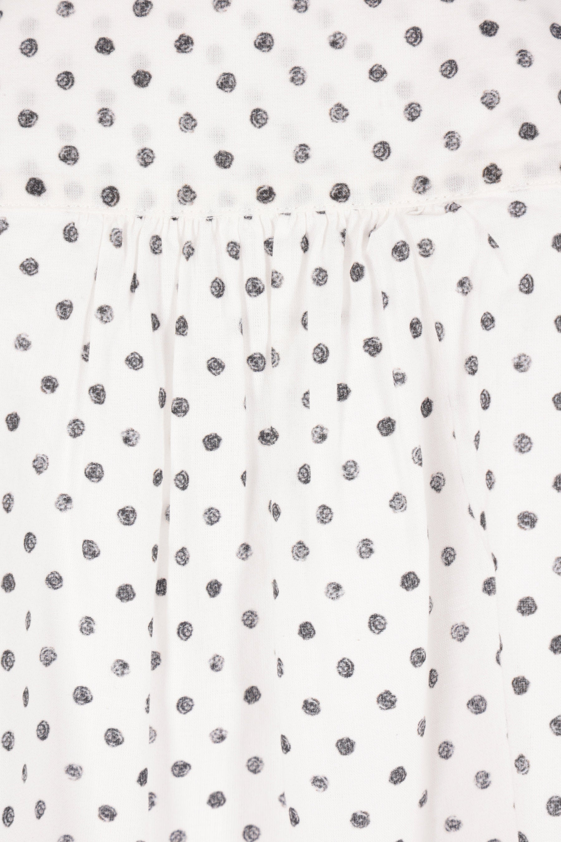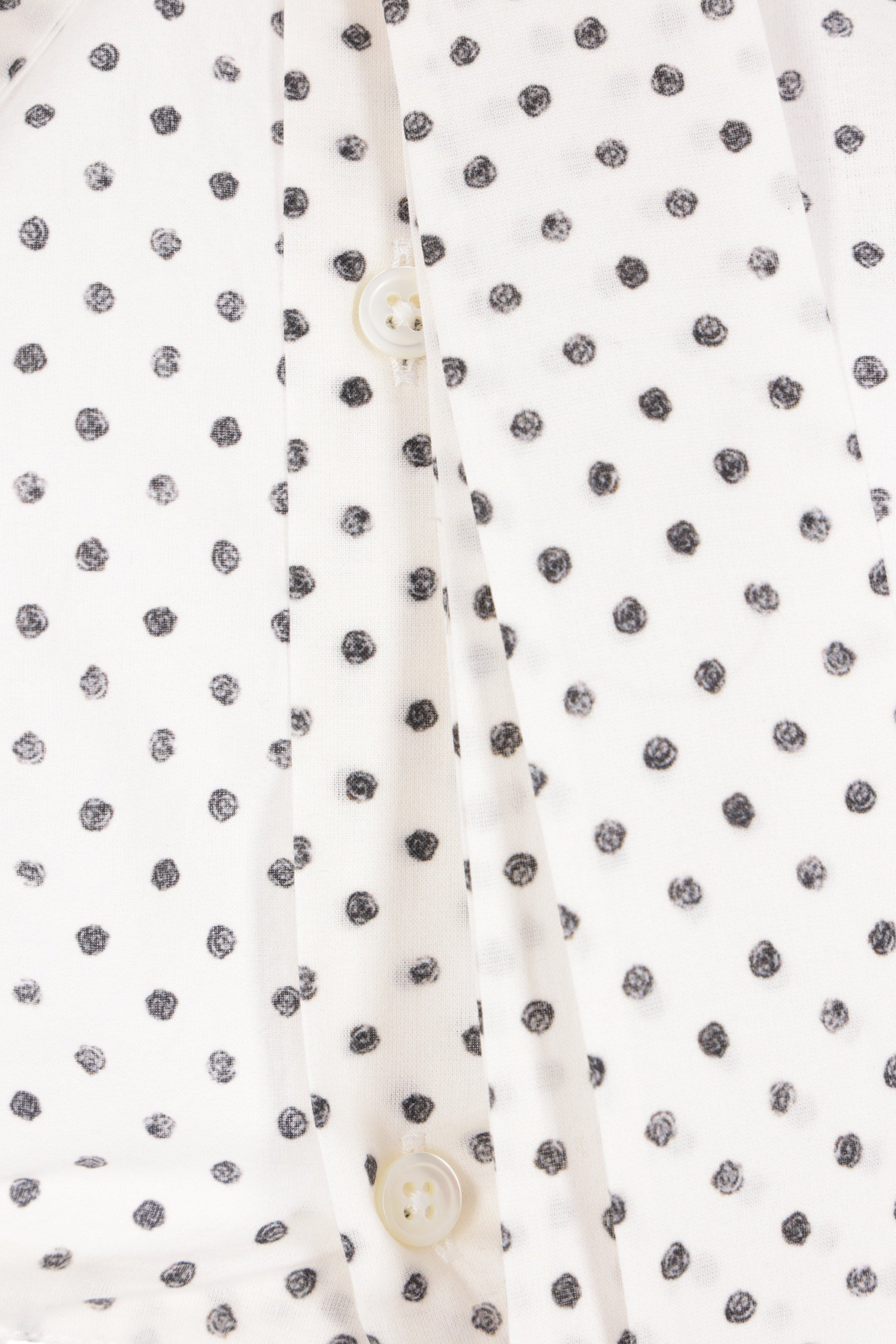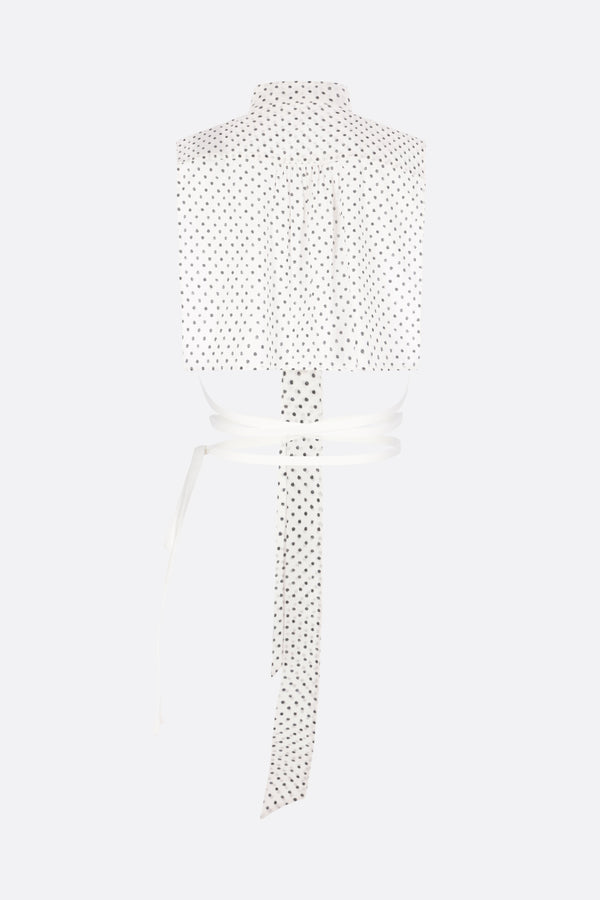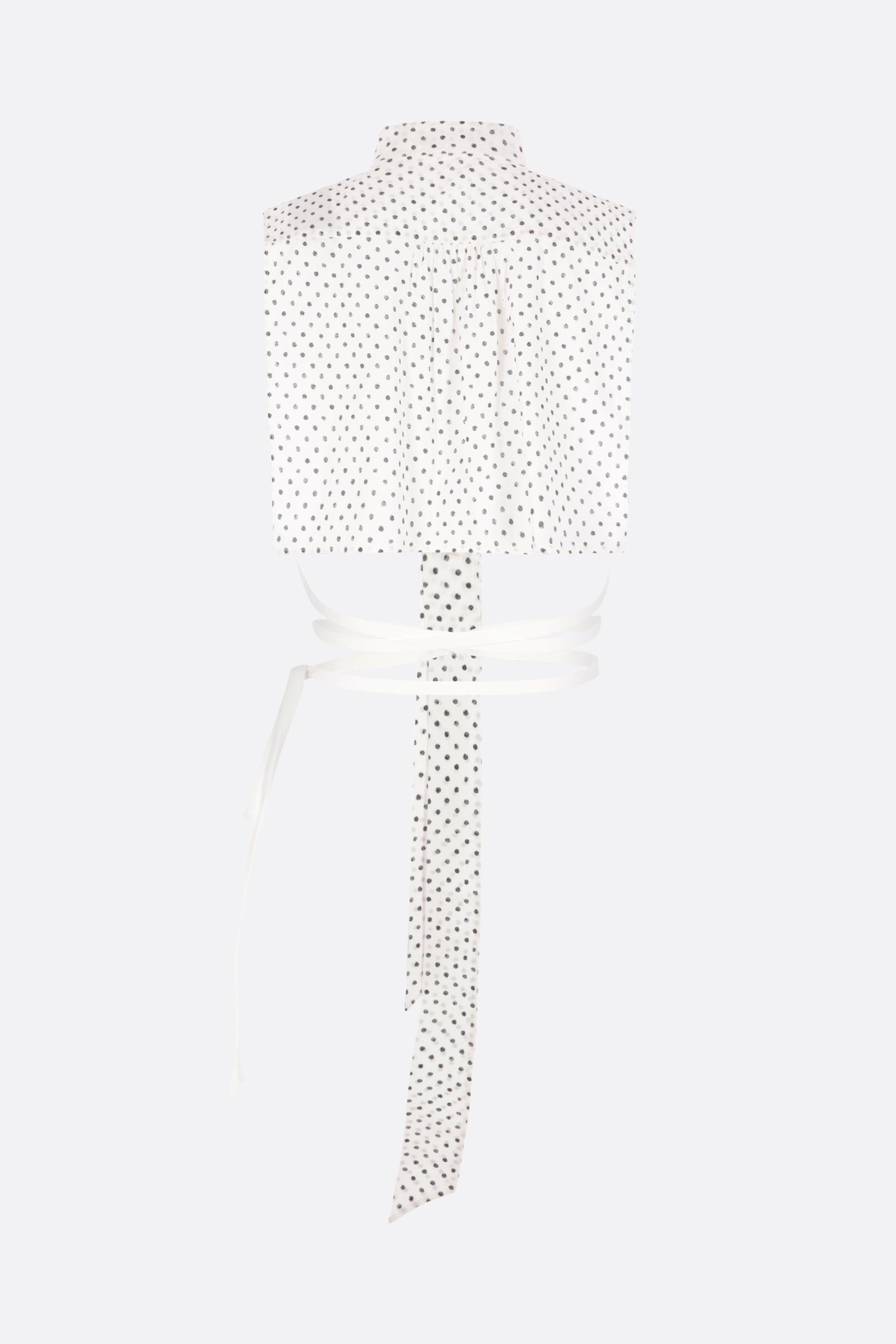 Ann Demeulemeester cropped sleeveless top made of white cotton with a polka dot print. Features a band collar with a removable matching scarf, button-front closure, tie waist, and straight hem.