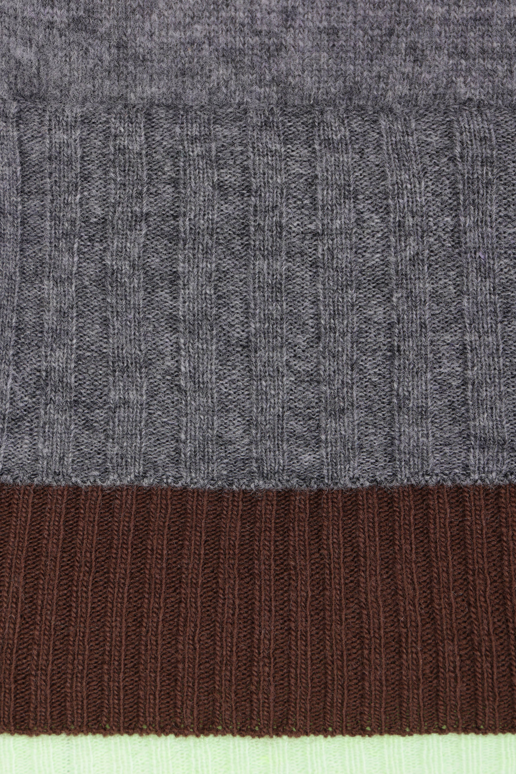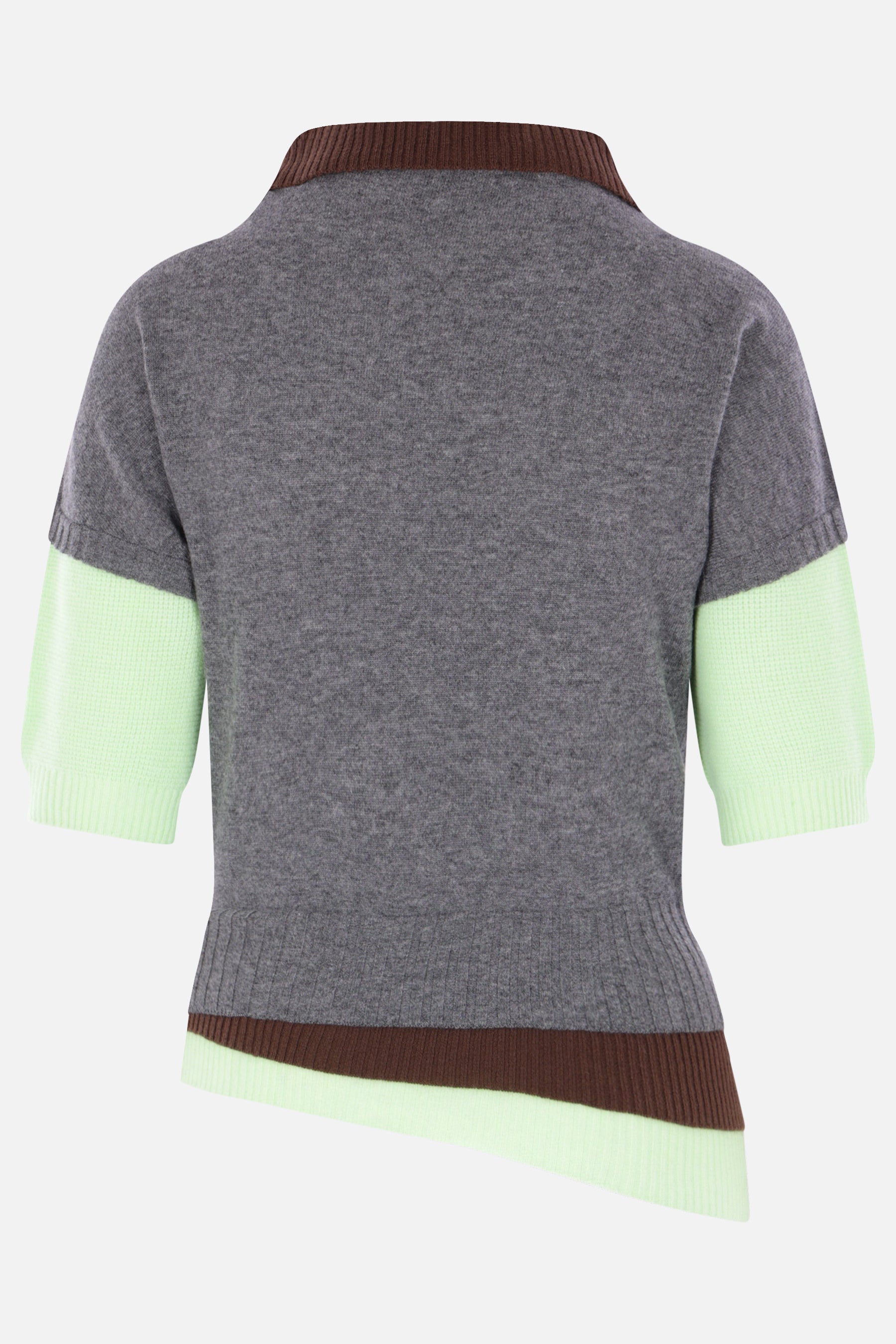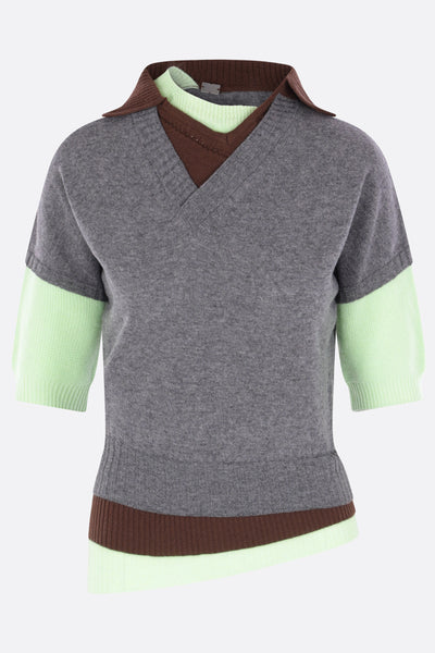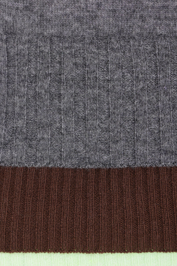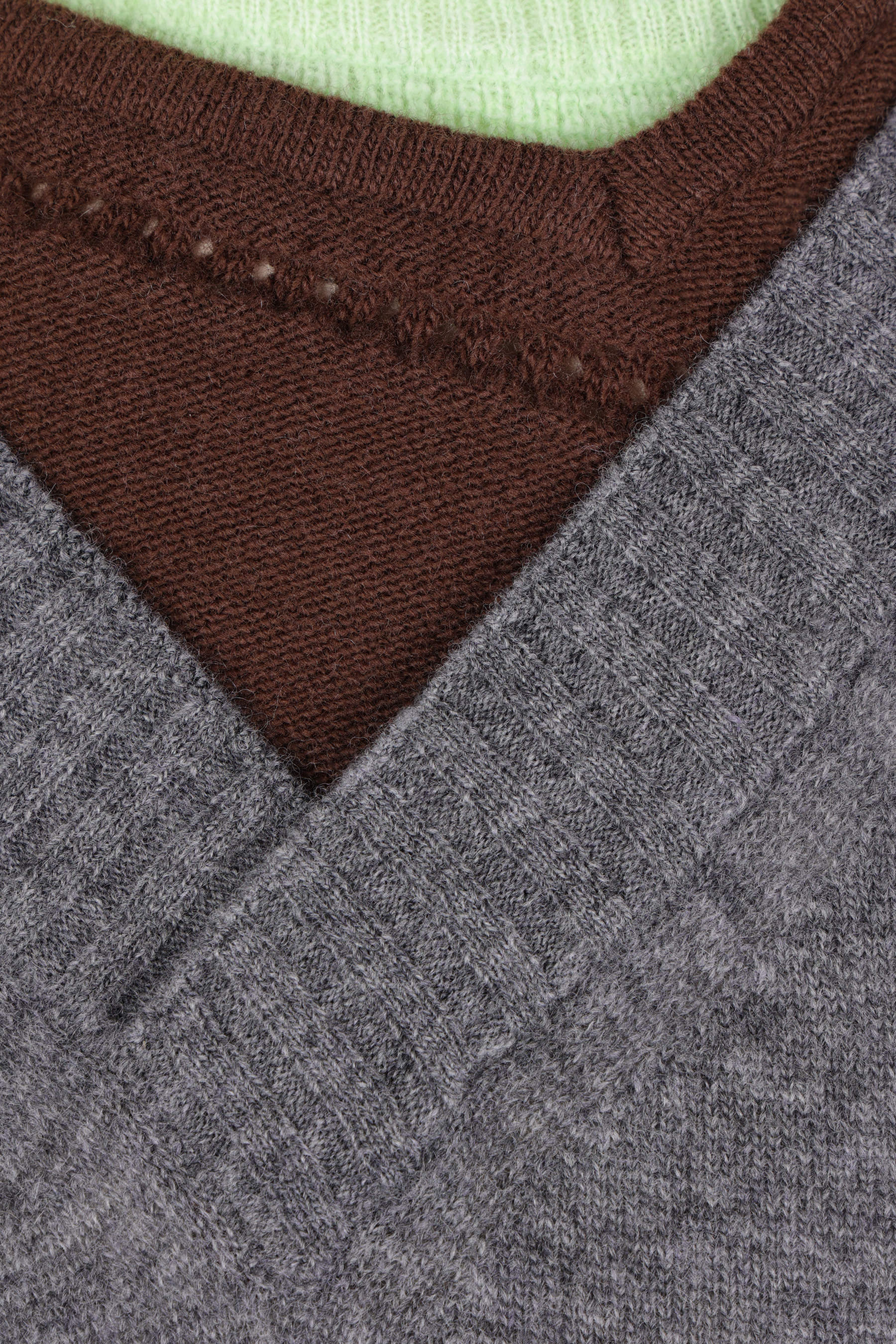 August Barron multi-layer sweater crafted from grey, brown, and light green wool and cashmere knit. This design gives the impression of wearing three deconstructed layered sweaters.