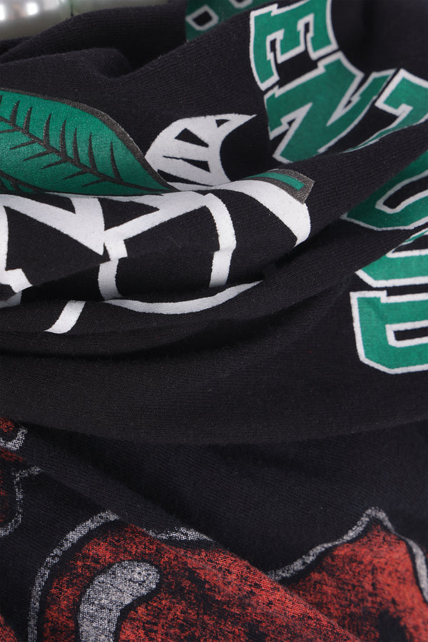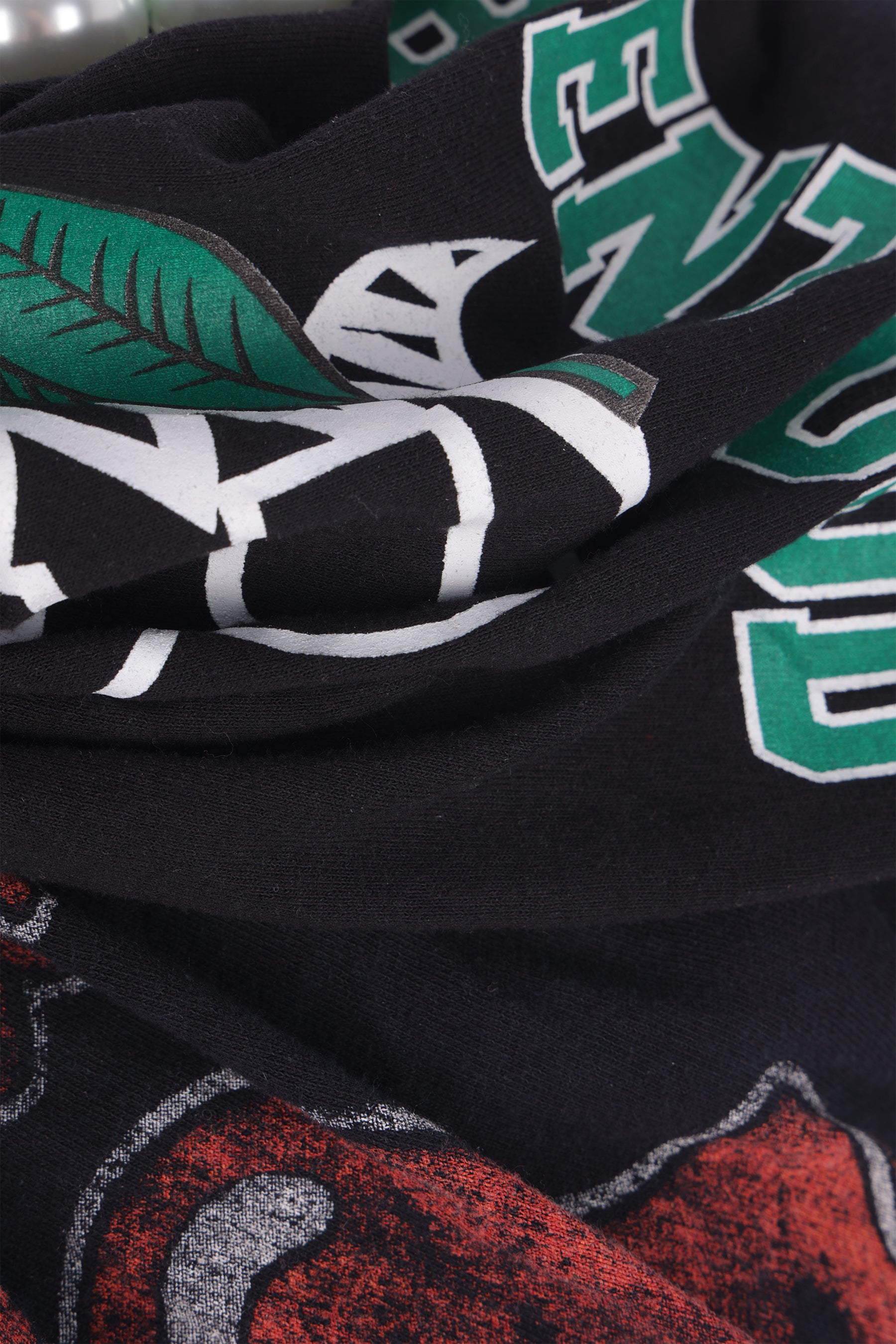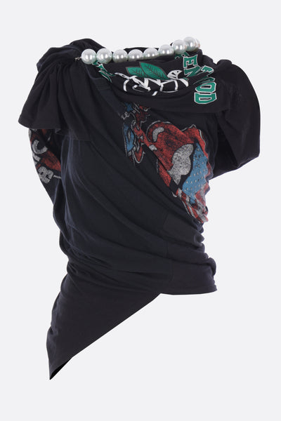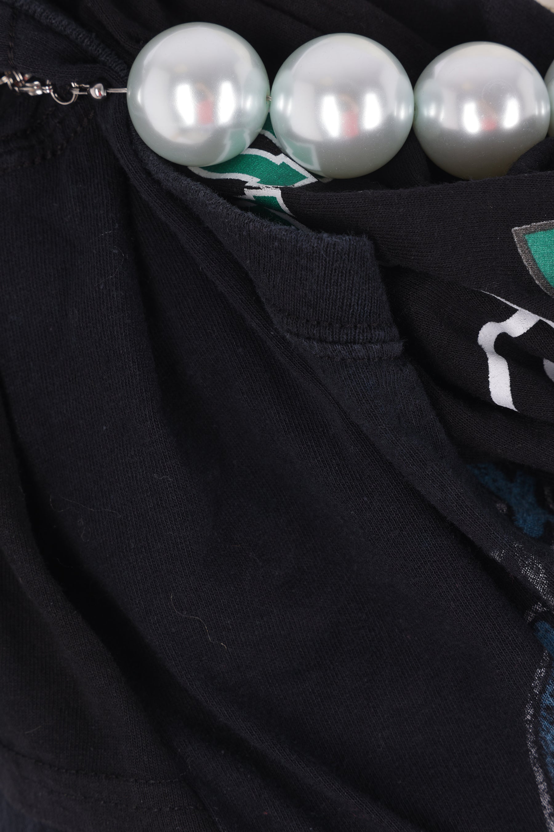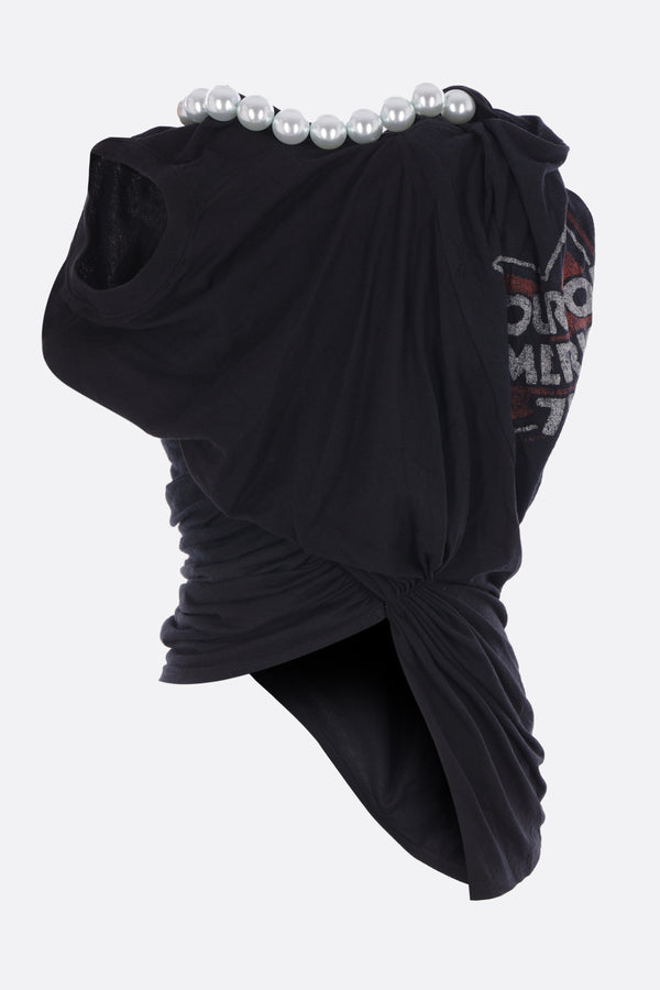 August Barron twisted t-shirt made from vintage black printed t-shirts and held at the neck by a pearl necklace. Featuring a side invisible zip closure and an elasticized inner top. Each piece is one-of-a-kind and may have slight variations in color, print, and condition, but the construction remains the same. Any signs of wear are considered an inherent part of the design.