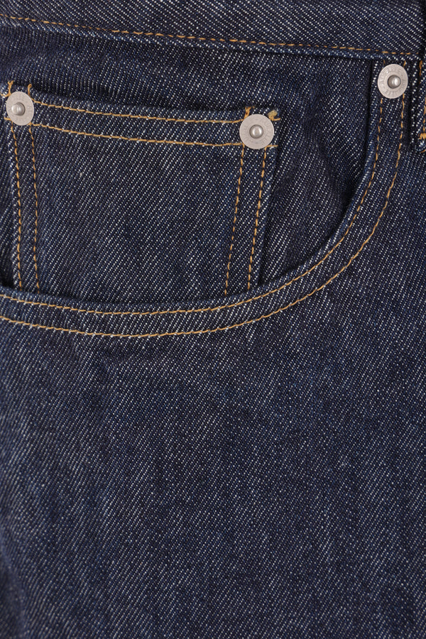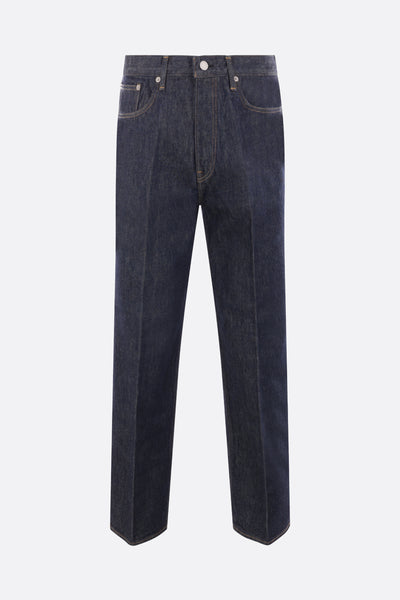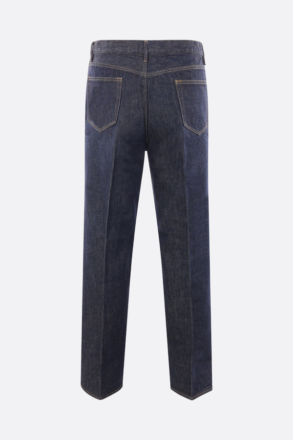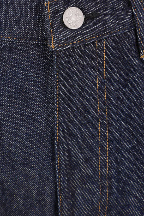 Auralee regular-fit jeans made of dark blue cotton denim with contrasting stitching. They feature front closure with metal button and zip, belt loops and five classic pockets.