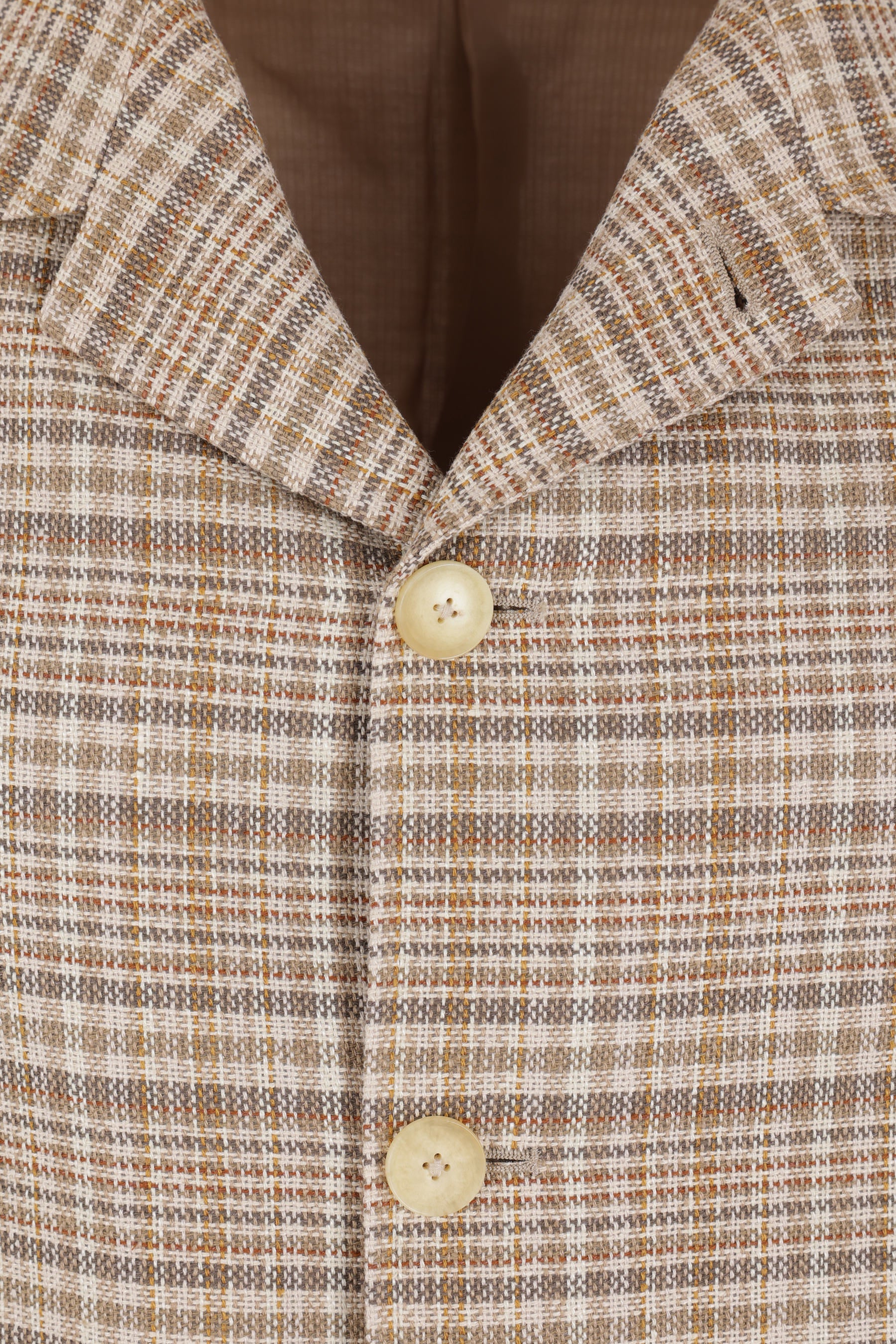 Auralee jacket crafted from silk and linen tweed with a beige and ivory check pattern. Featuring a notched collar, front button closure, flap pockets, long sleeves with wrist slits, a central back vent, and a lined interior.