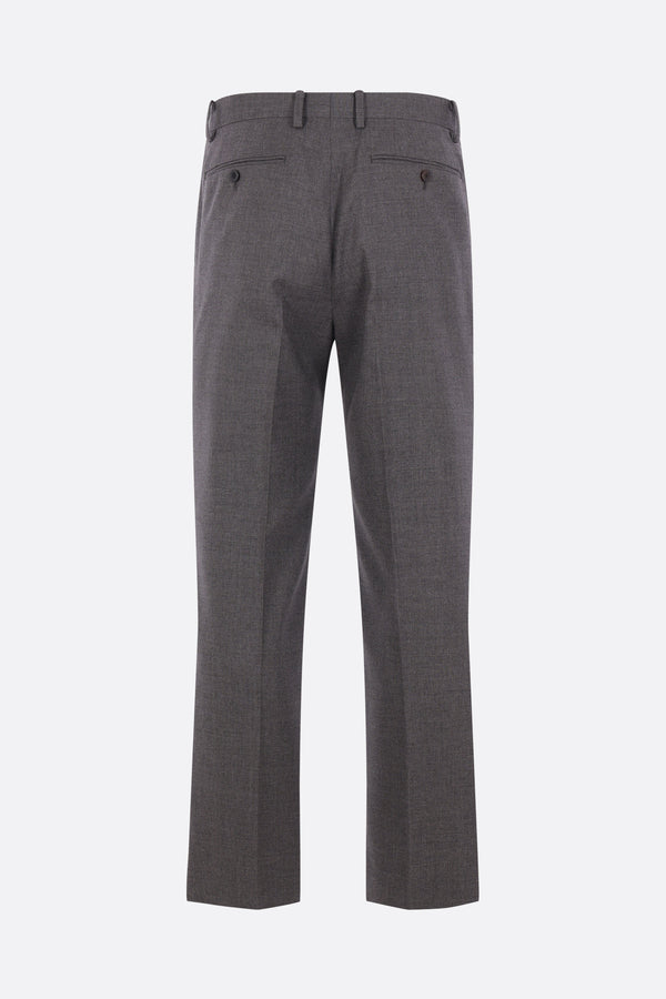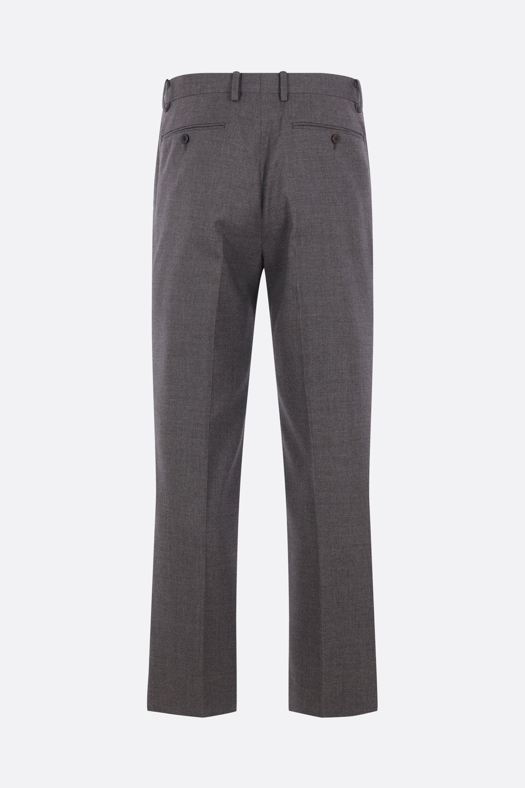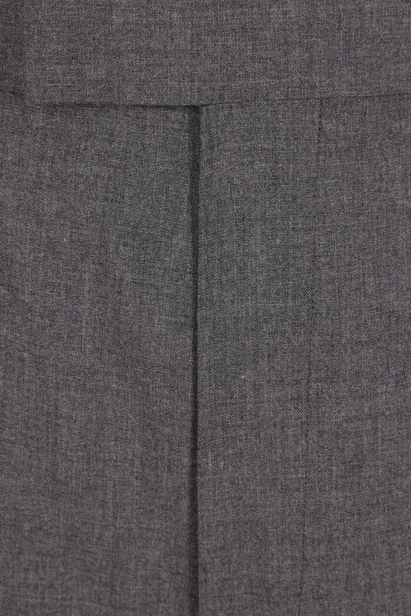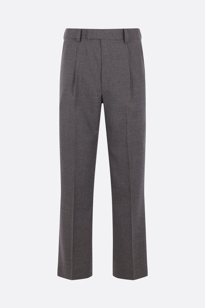 Auralee trousers crafted from grey cashmere. Featuring a front hook, button, and zip closure, belt loops, multiple pockets, front pleats, and a center crease. Partially lined interior.