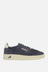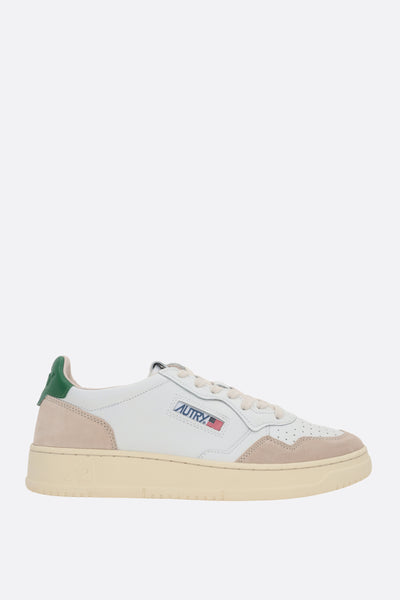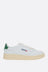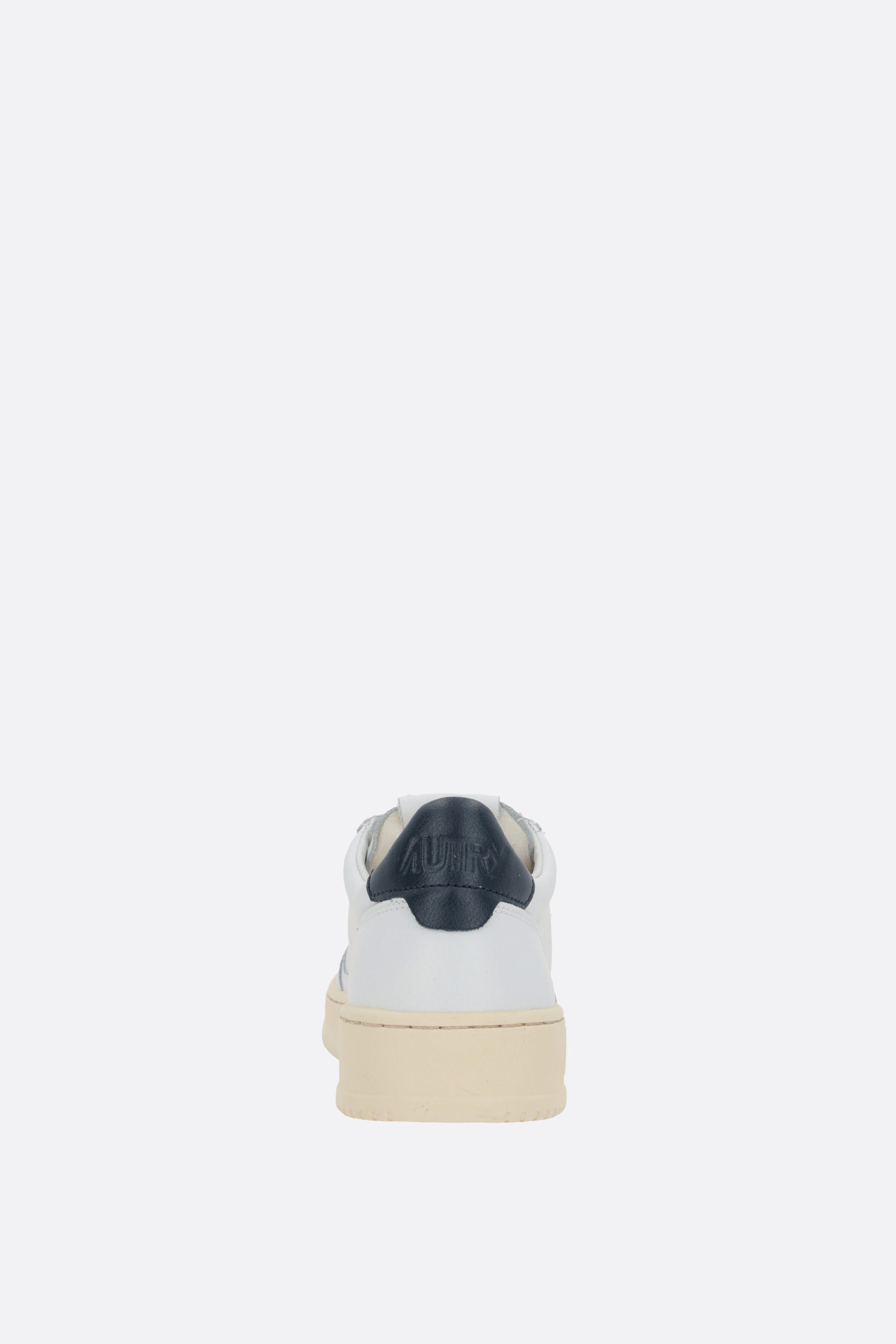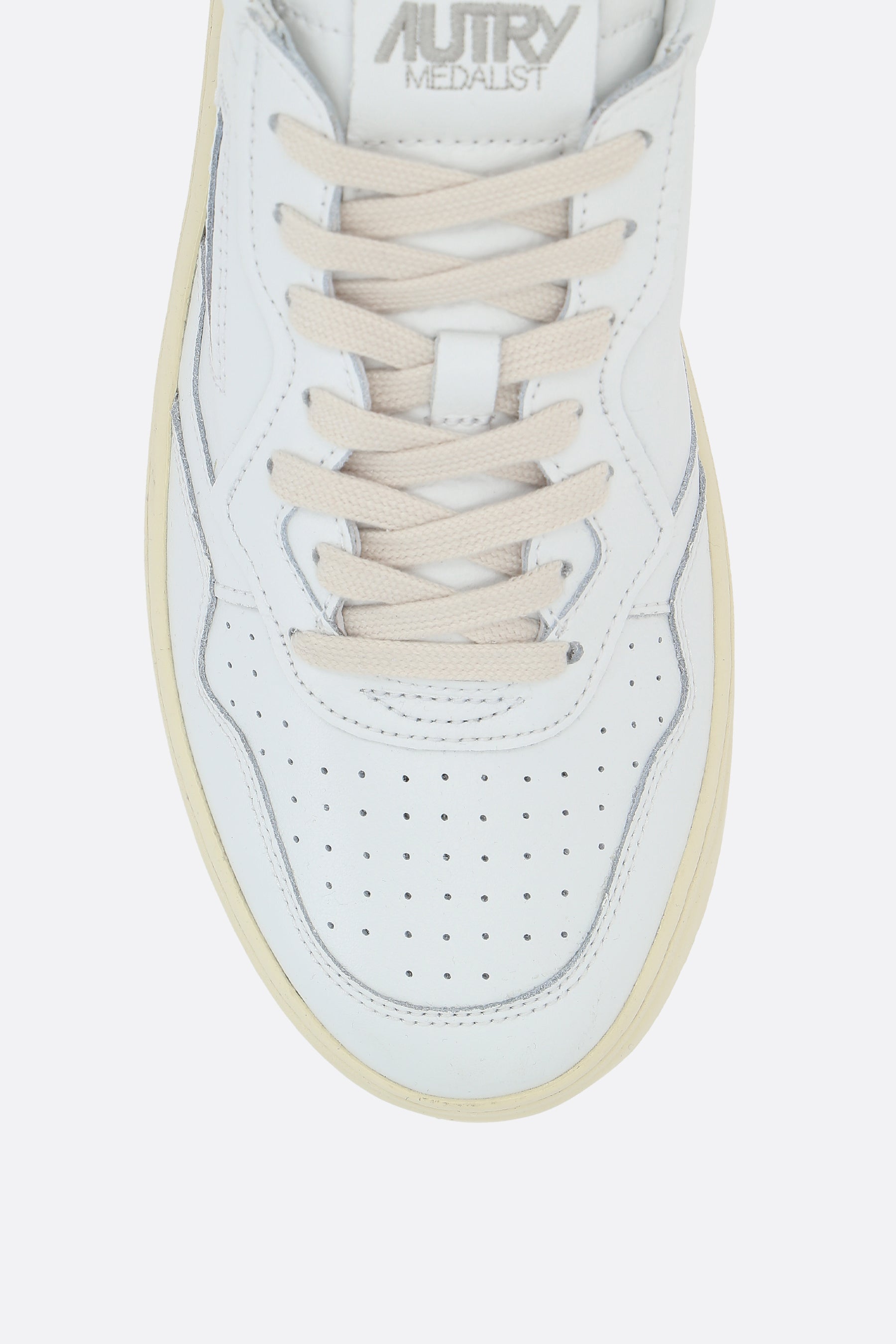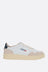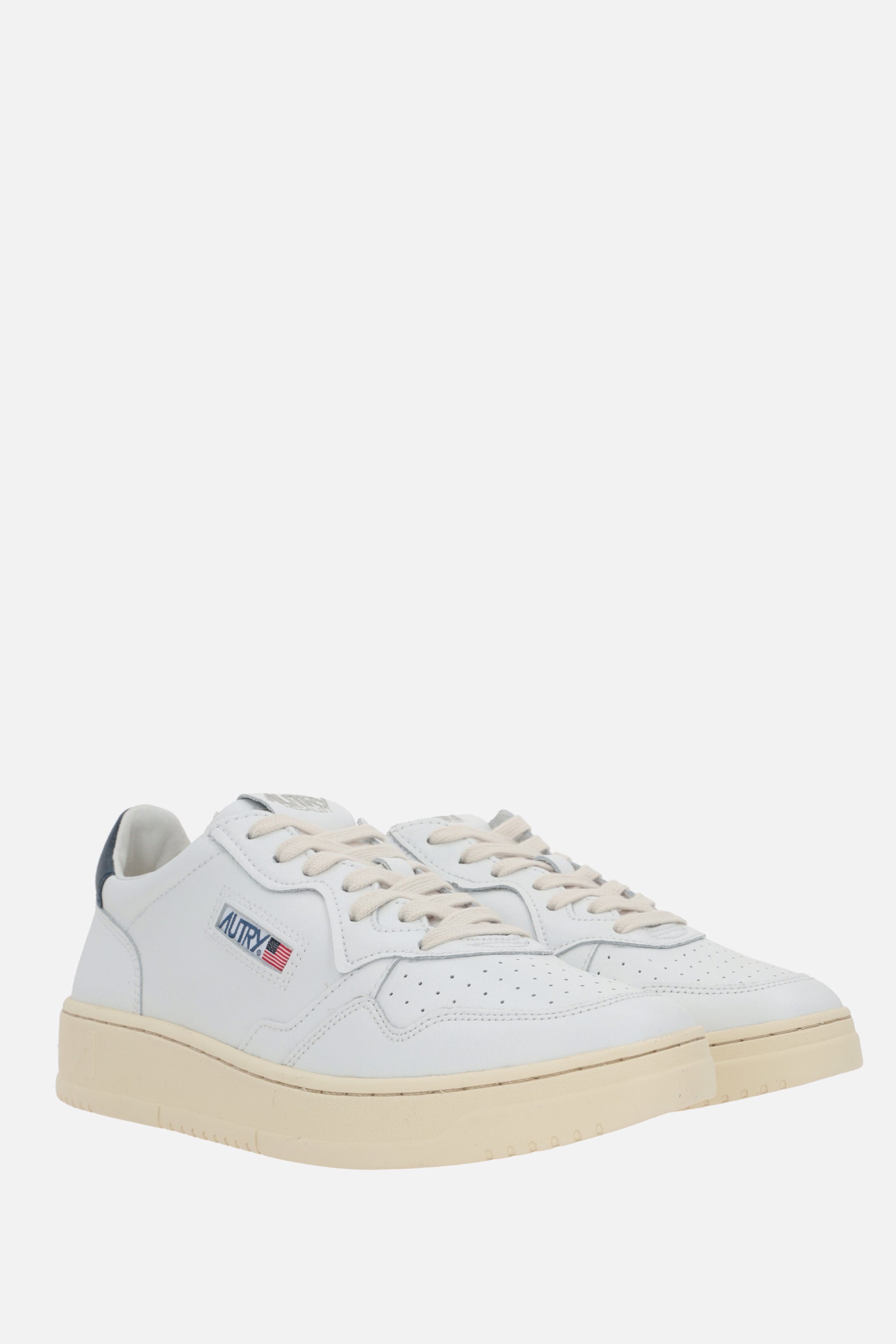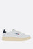 Autry low-top sneakers made of smooth white leather with a perforated toe detail. They feature a lace-up closure, round toe, leather and fabric lining, and rubber sole. The design is completed by the brand's signature logo label on the tongue, side logo patch, and dark blue leather heel tab with embossed logo.