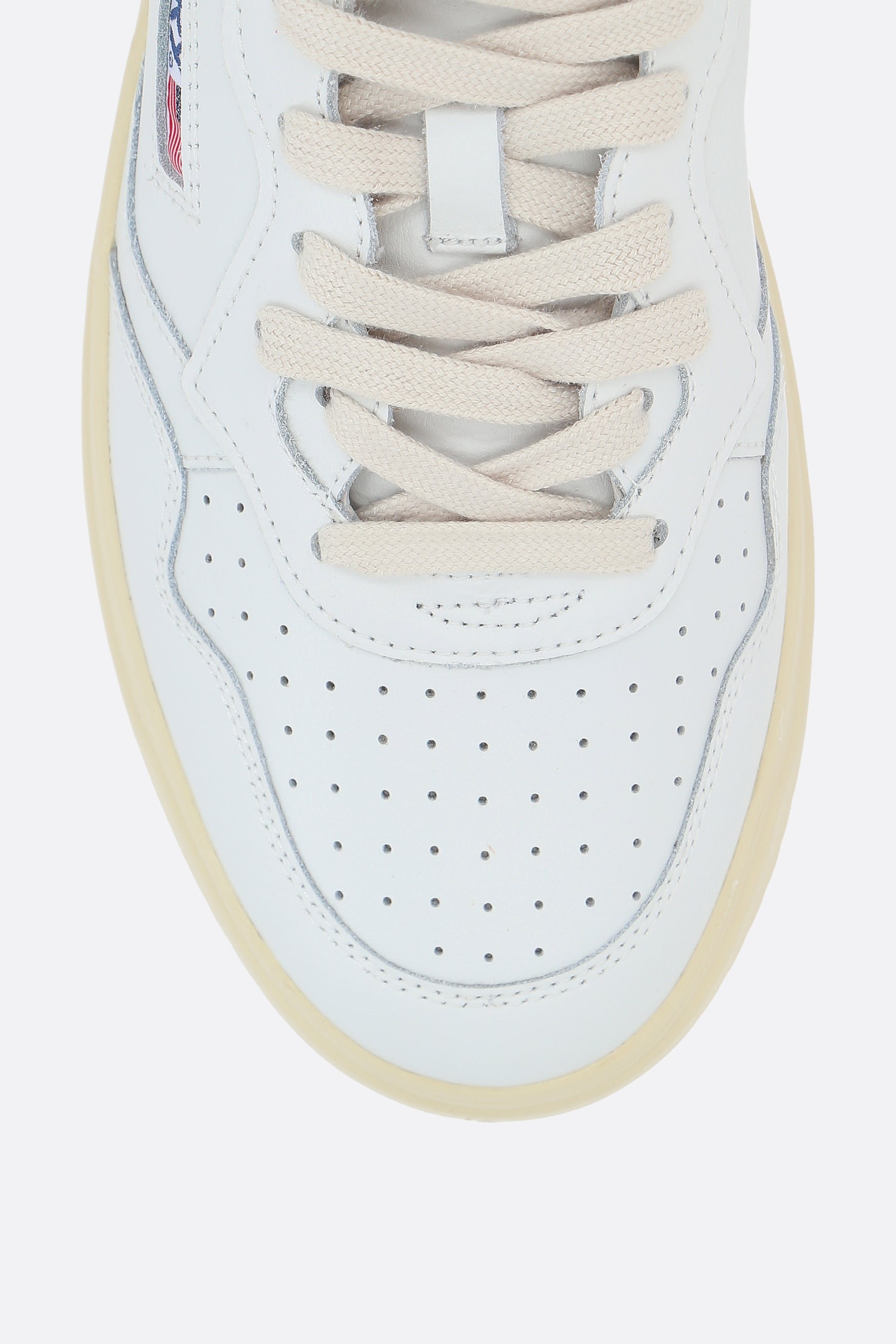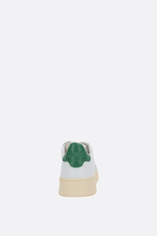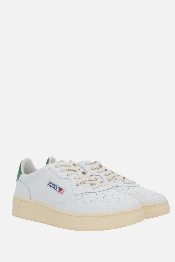 Autry low-top sneakers made of smooth white leather with a perforated toe detail. Featuring a lace-up closure, round toe, leather and fabric lining, and rubber sole. The design is completed by the brand's signature logo label on the tongue, side logo patch, and green leather heel tab with embossed logo.