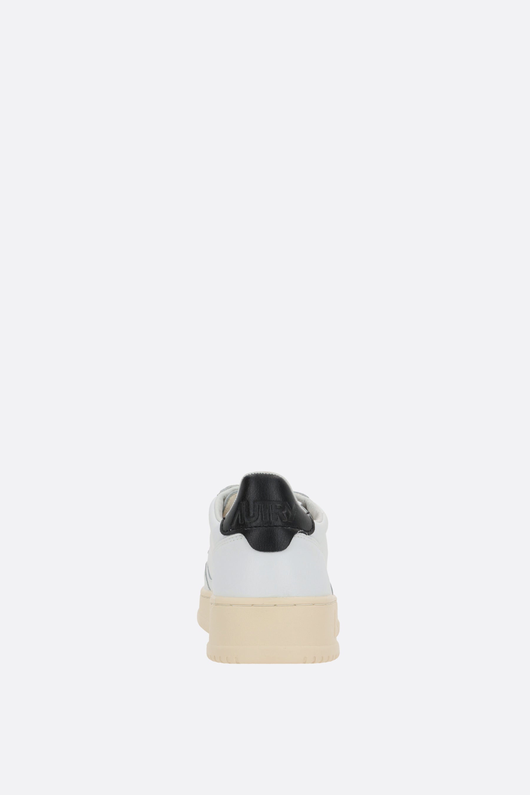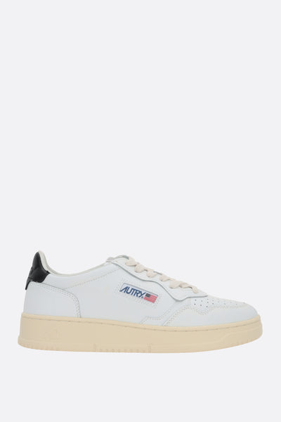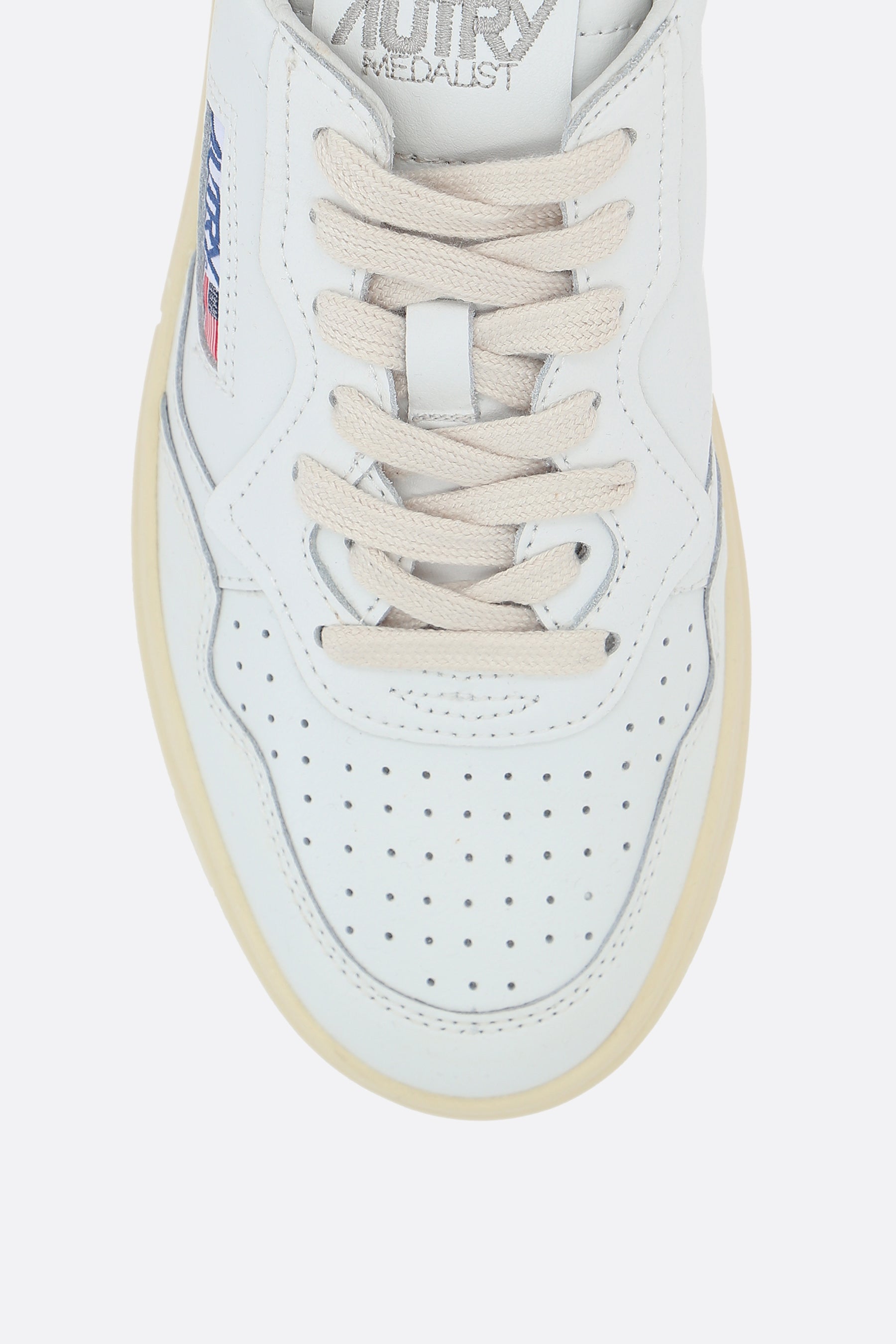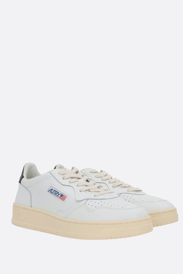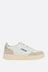 Autry low-top sneakers made of smooth white leather with a perforated toe detail. They feature a lace-up closure, round toe, leather and fabric lining, and rubber sole. The design is completed by the brand's signature logo label on the tongue, side logo patch, and black leather heel tab with embossed logo.