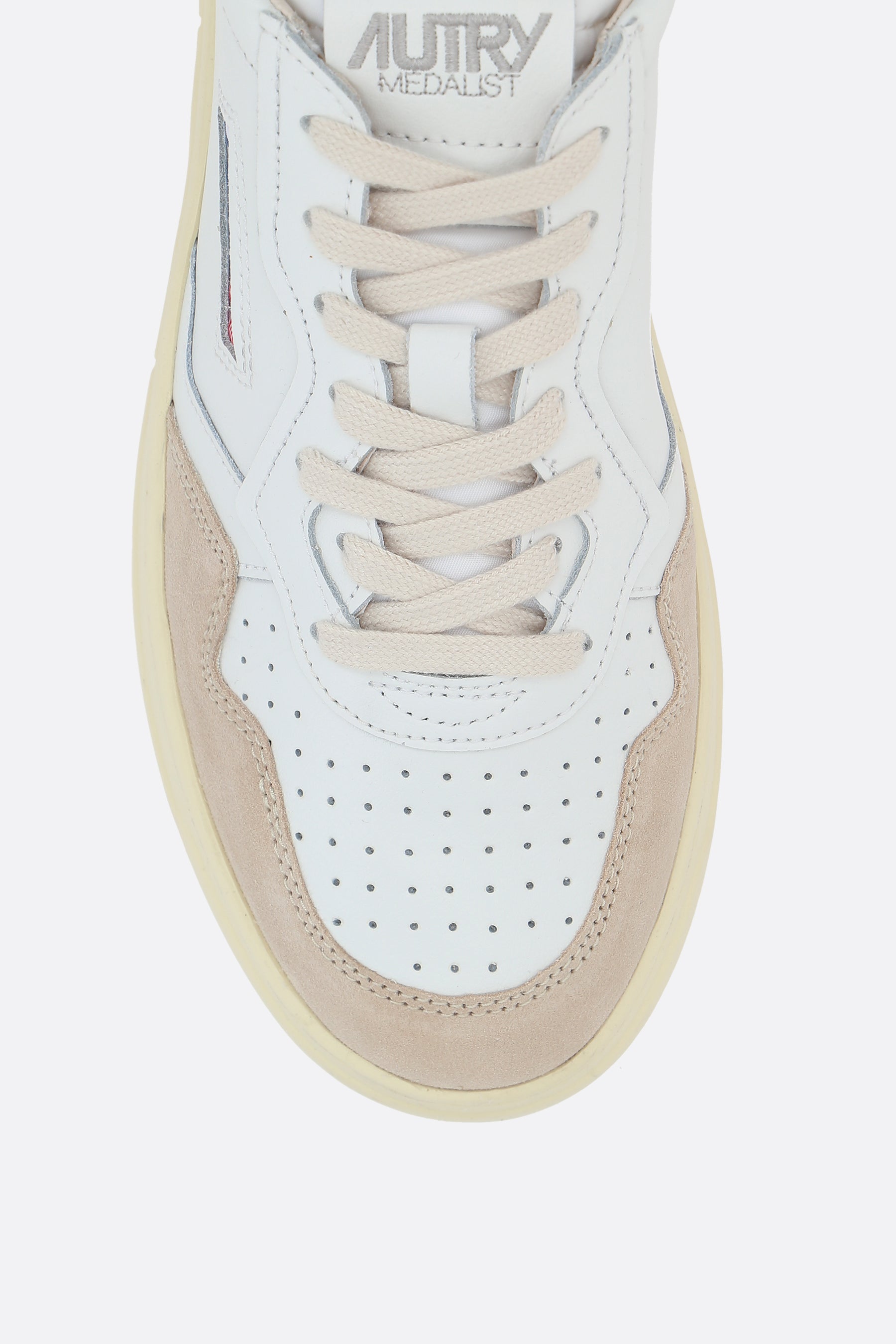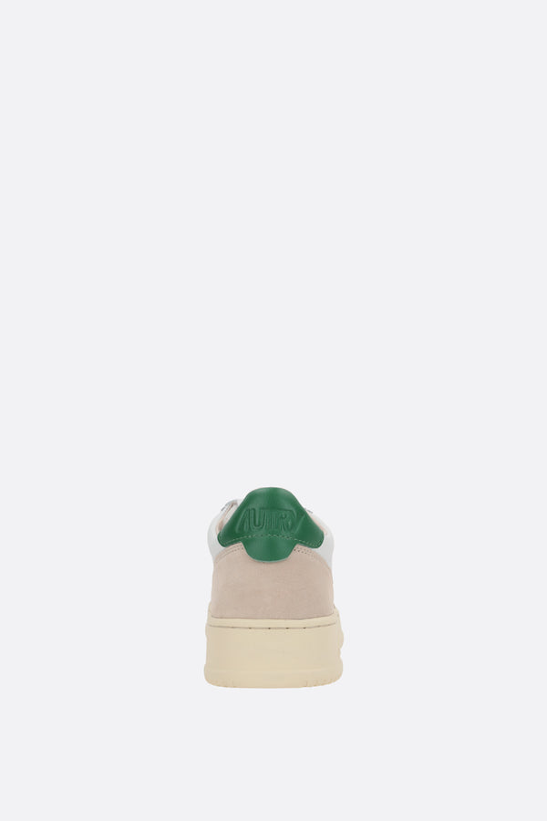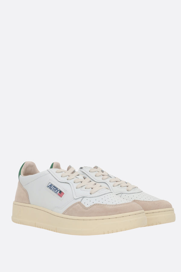 Autry low-top sneakers crafted from smooth white leather and light grey suede, featuring perforated detailing on the toe. They have a lace-up closure, rounded toe, leather and fabric linings, and a rubber sole. The design is completed with the signature logo label on the tongue, a side logo label, and a green leather heel tab with embossed logo.