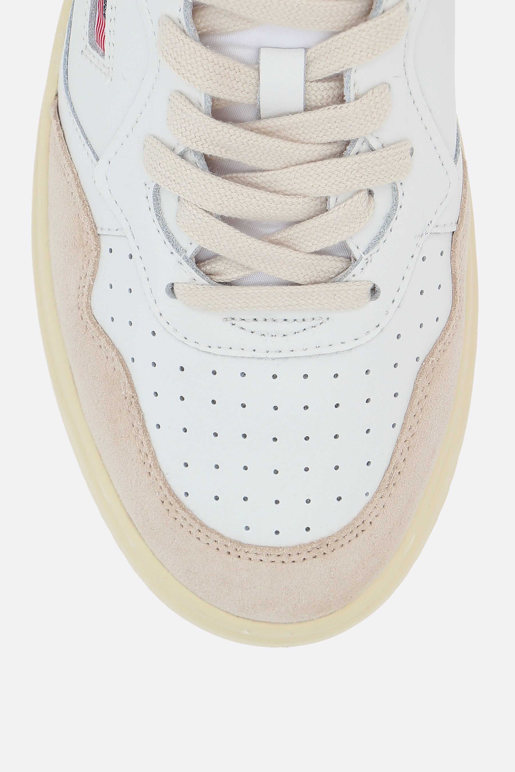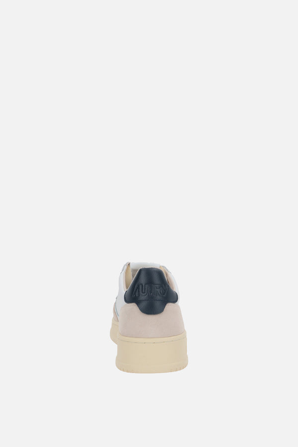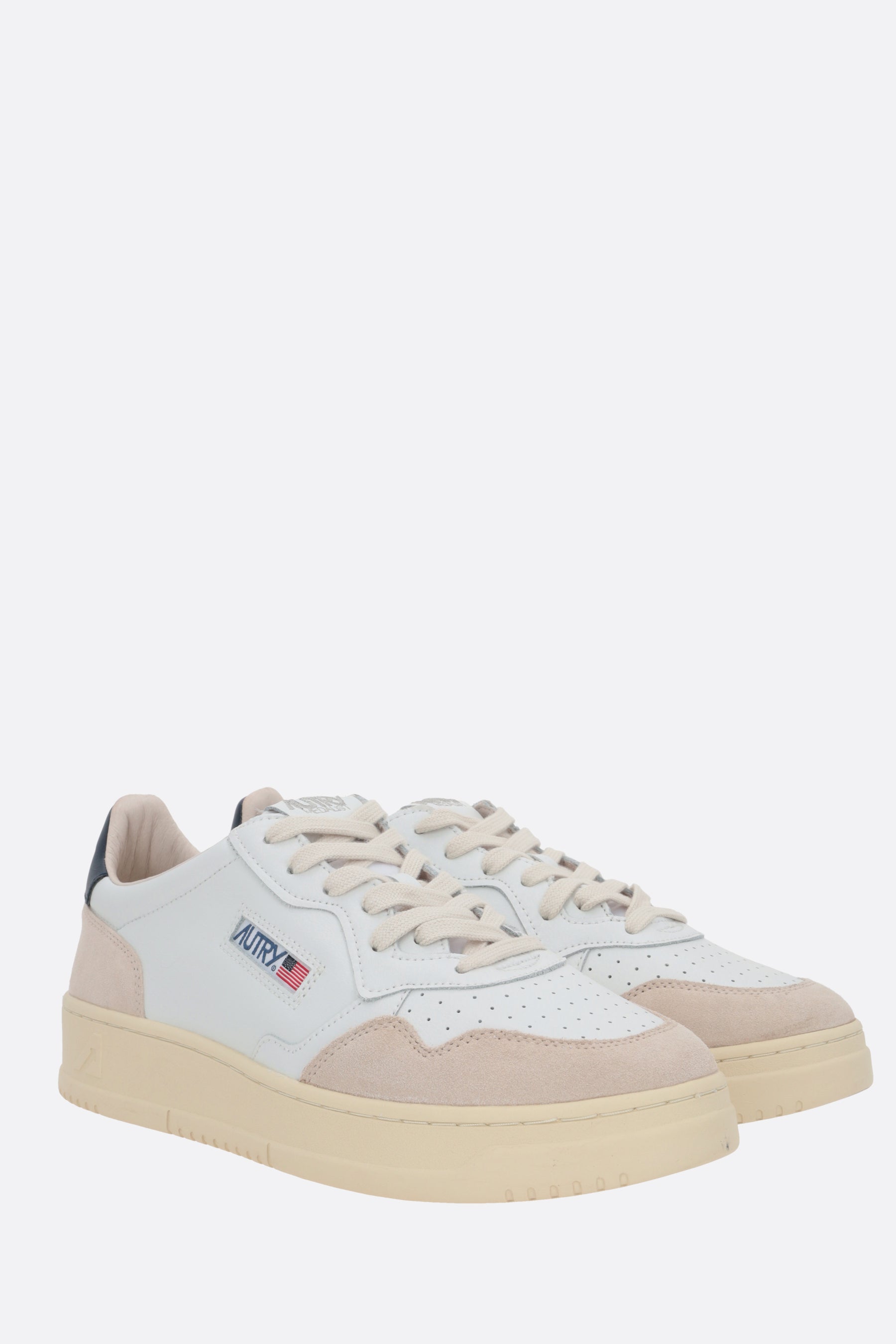 Autry low-top sneakers crafted from smooth white leather and light grey suede, featuring perforated detailing on the toe. They feature a lace-up closure, rounded toe, leather and fabric linings, and a rubber sole. The design is completed with the signature logo label on the tongue, a side logo label, and a blue leather heel tab with embossed logo.