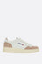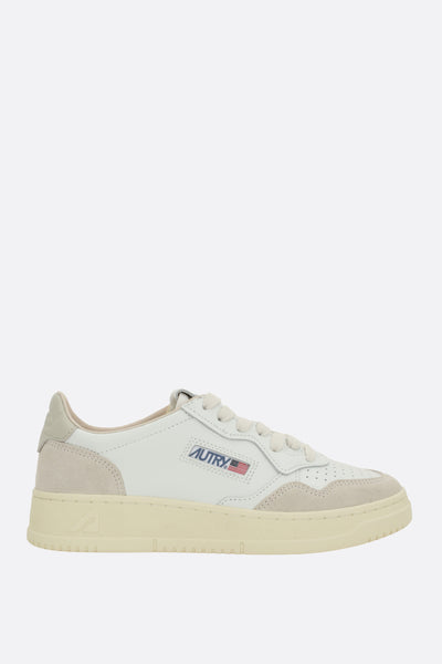 Autry low-top sneakers crafted from smooth white leather and light grey suede, featuring perforated detailing on the toe. They feature a lace-up closure, rounded toe, leather and fabric linings, and a rubber sole. The design is completed with the signature logo label on the tongue, a side logo label, and a tonal heel tab with embossed logo.