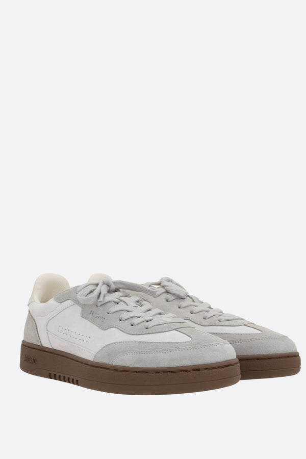 Axel Arigato low-top sneakers crafted from white and grey suede with perforated detailing. Featuring lace-up closure, round toe, fabric lining, and recycled rubber sole. The design is completed by a contrasting heel tab with embossed logo and a branded label on the tongue.
