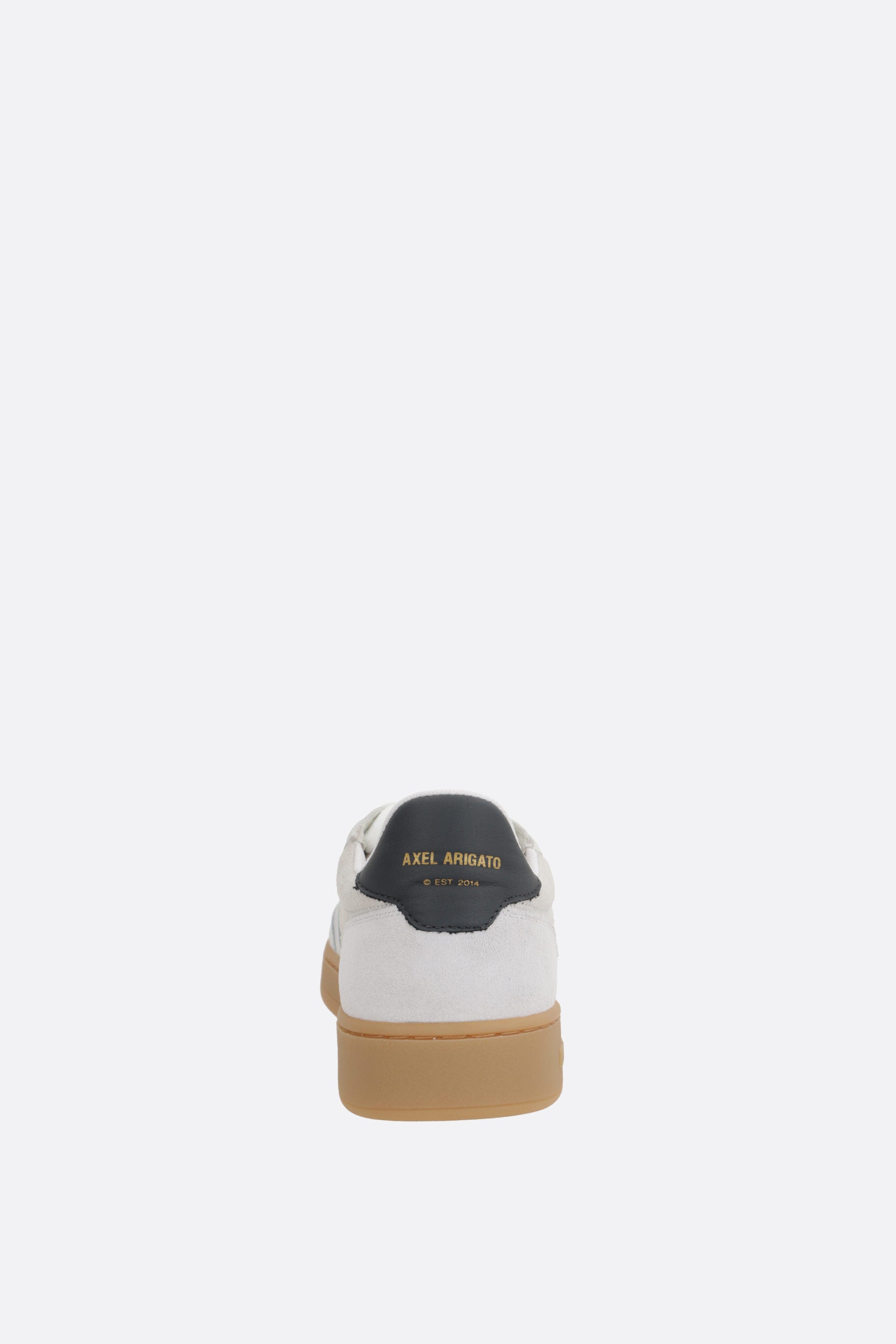 Axel Arigato low-top sneakes crafted from smooth white leather and light grey suede with perforated detailing. Featuring lace-up closure, round toe, fabric lining, and a recycled rubber sole. The design is completed with a contrasting heel tab with embossed logo and a branded nylon tongue label.