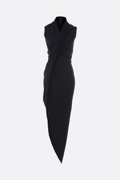 Balenciaga draped dress made from black jersey crêpe. Featuring a crossover V-neckline, asymmetrical hemline, and a large slit on the right leg.