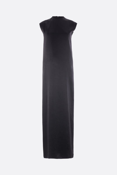 Balenciaga sleeveless dress made of black satin with raw-cut edges. Featuring a crew neckline, concealed back zip closure, central back slit, and unlined interior.