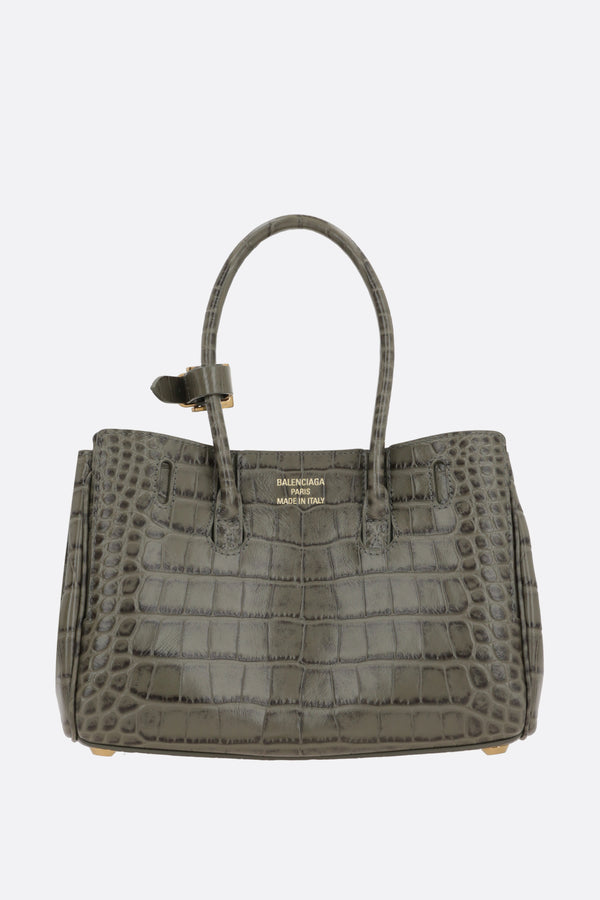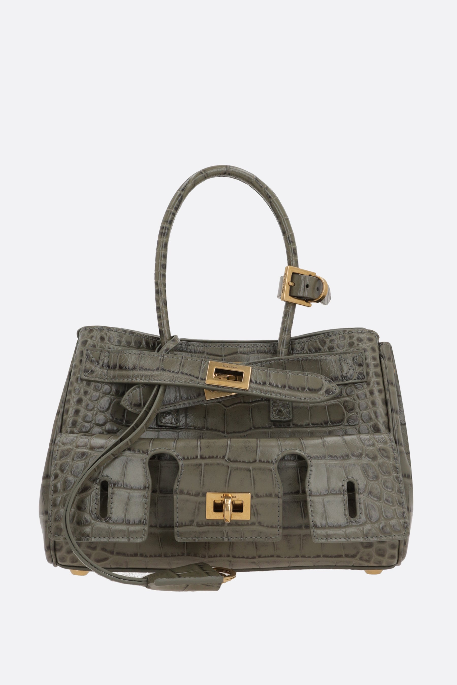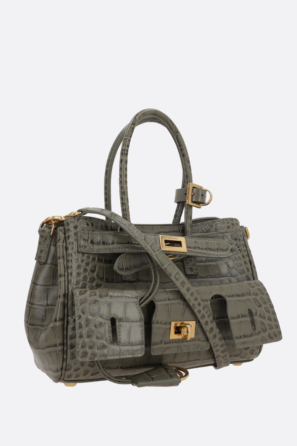 Balenciaga handbag made of military green crocodile-embossed leather with an embossed logo lettering on the back. Features antiqued gold-tone hardware, double handles, adjustable/removable shoulder strap, protective metal feet, side snap buttons to adjust the width, and a tone-on-tone leather-lined interior with a zip pocket. The design is completed by a large front pocket with decorative flaps, two key rings with leather case, and a front strap with turn-lock closure.
