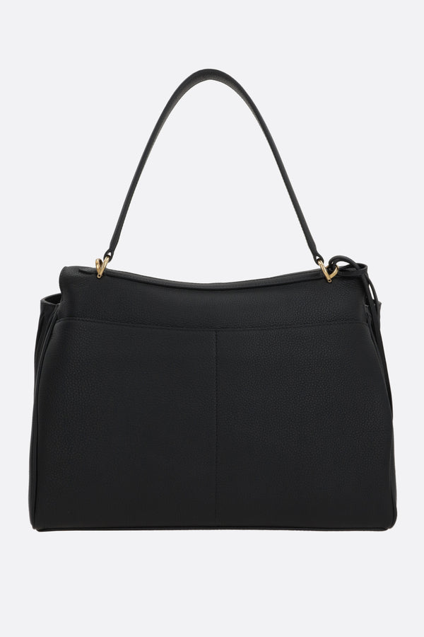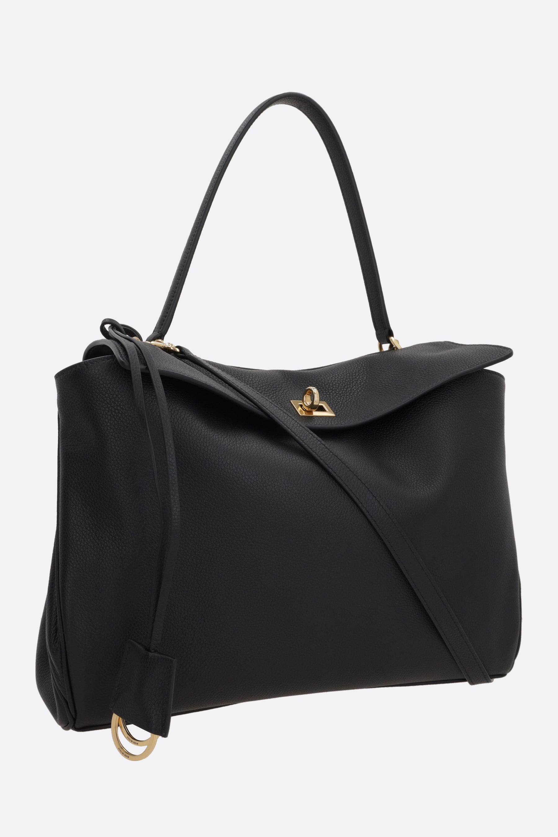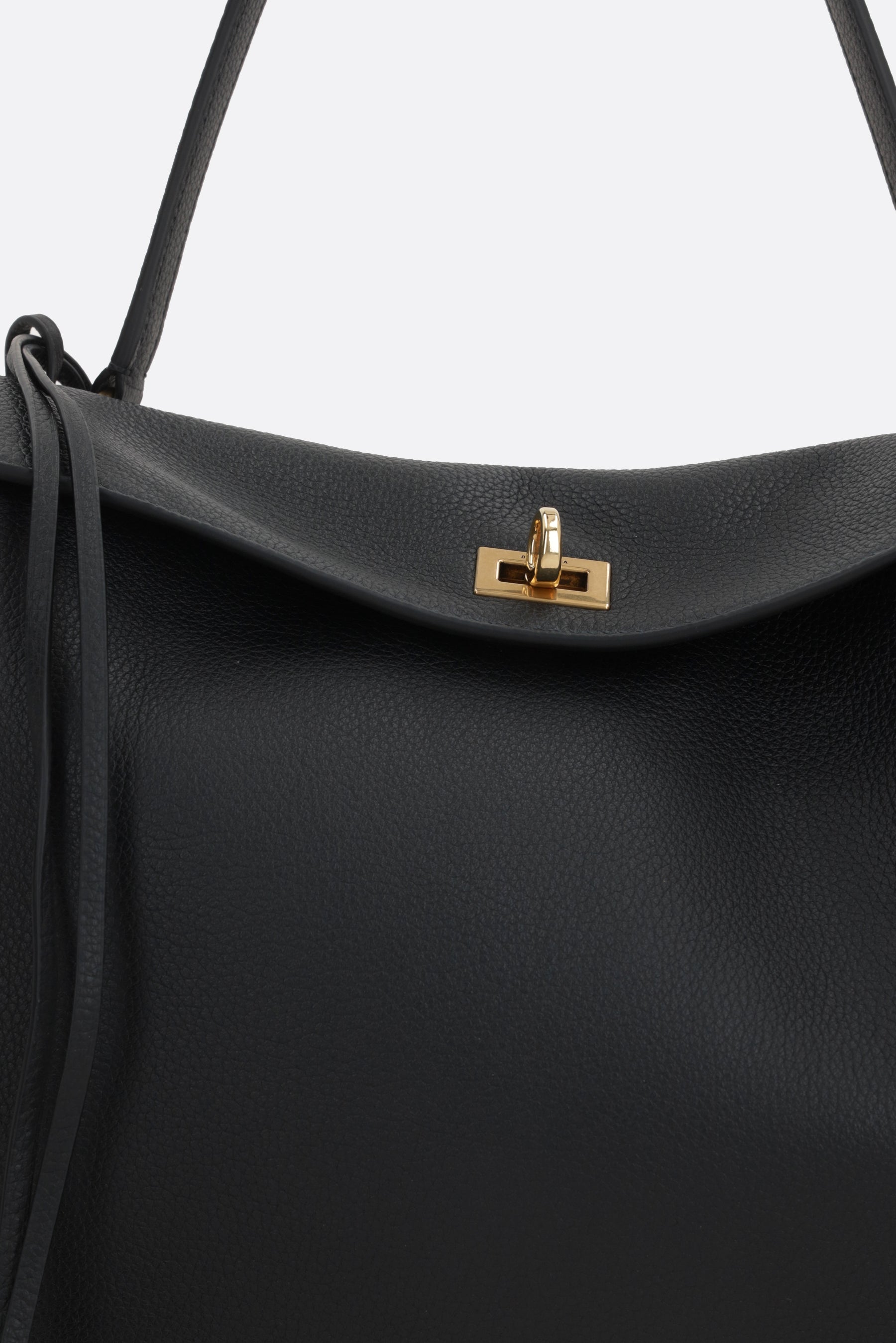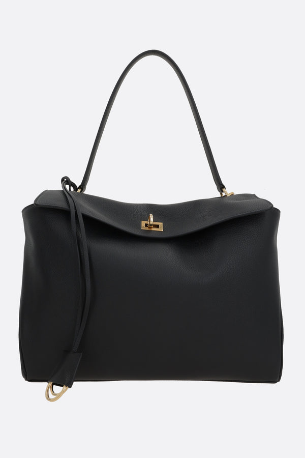 Balenciaga handbag crafted in black grained leather. It features gold-tone hardware, turn-lock closure, top handle and removable strap. Tone-on-tone nappa-lined interior with zip pocket. The design is completed by protective metal feet, two slip pockets and a removable key holder with two split rings.