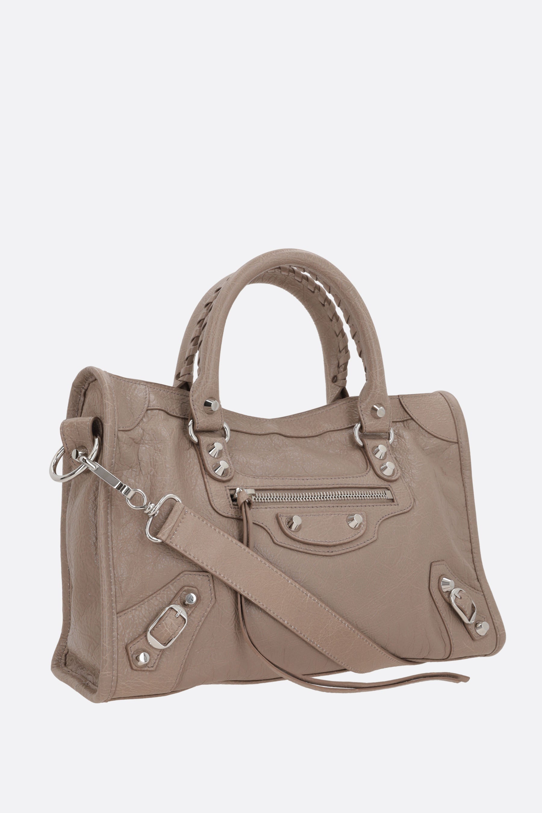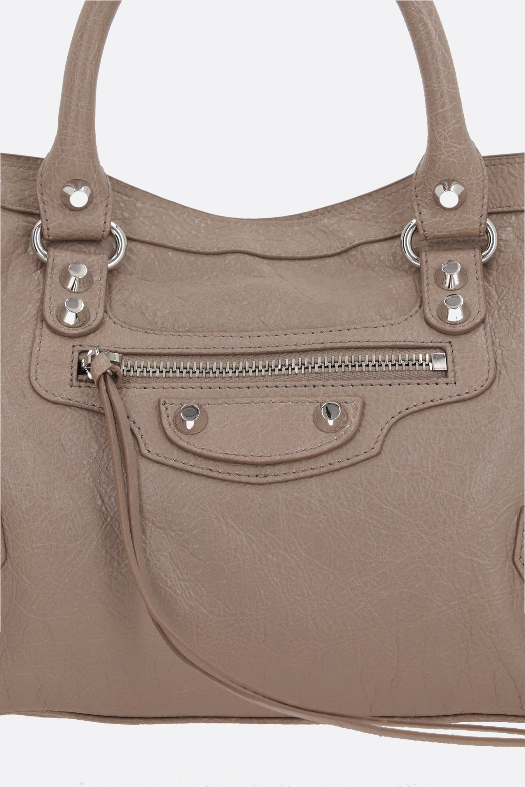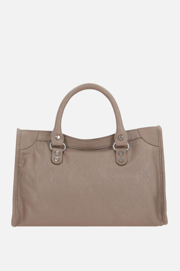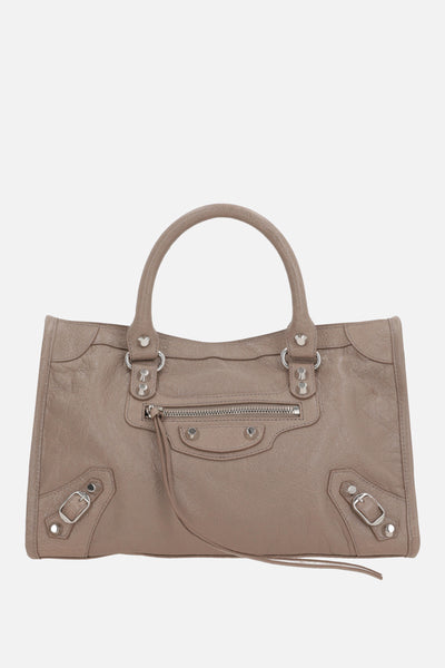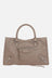 Balenciaga tote bag crafted in taupe-colored Arena Storico leather enriched by studs and buckles in silver-tone metal. Featuring zip closure, double handle and removable / adjustable shoulder strap. Black canvas lined-interior with zip pocket. The design is completed by the front zip pocket.