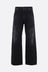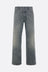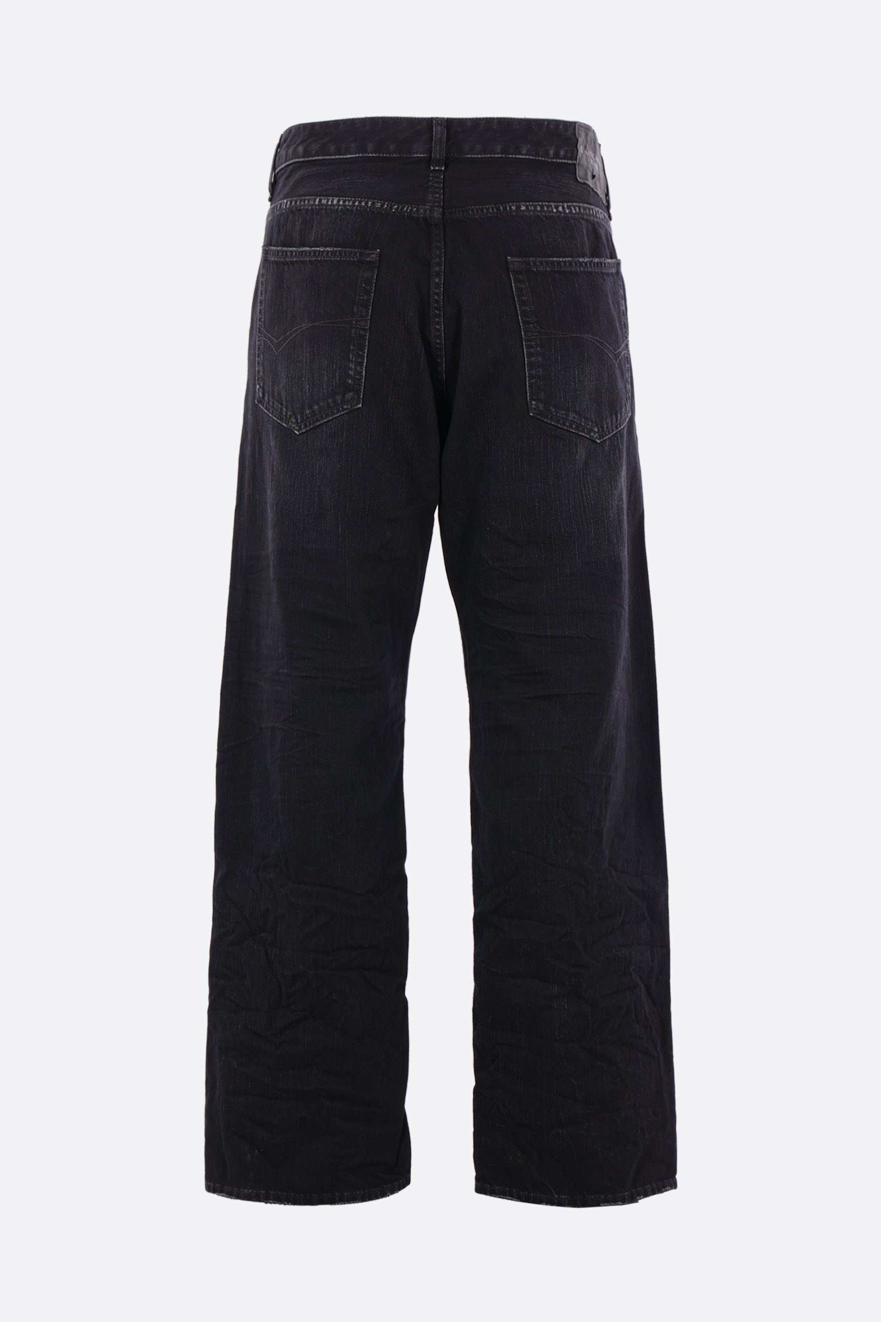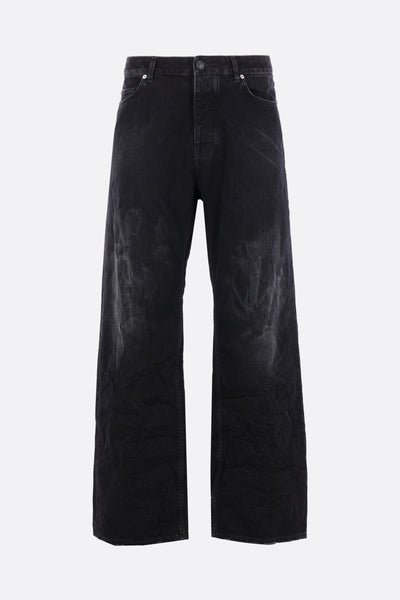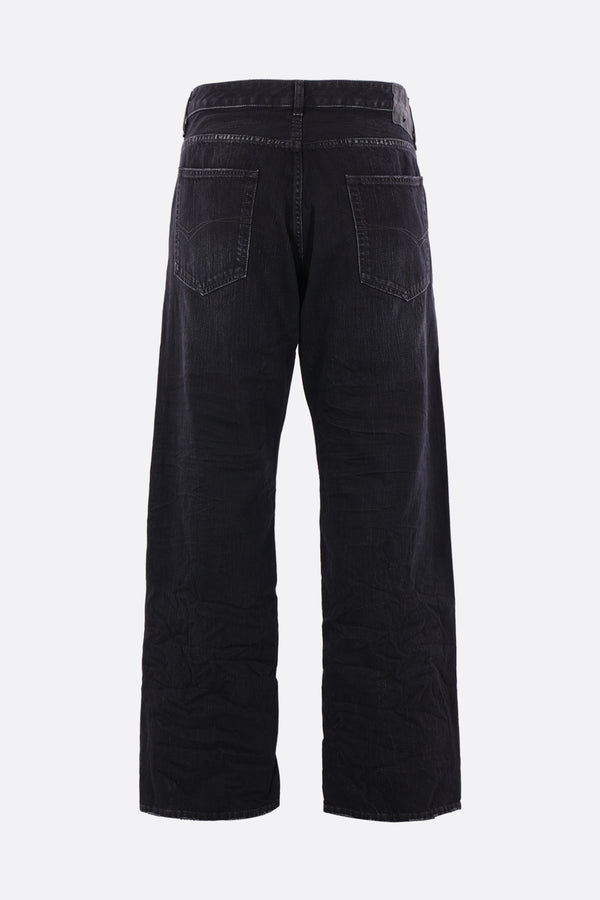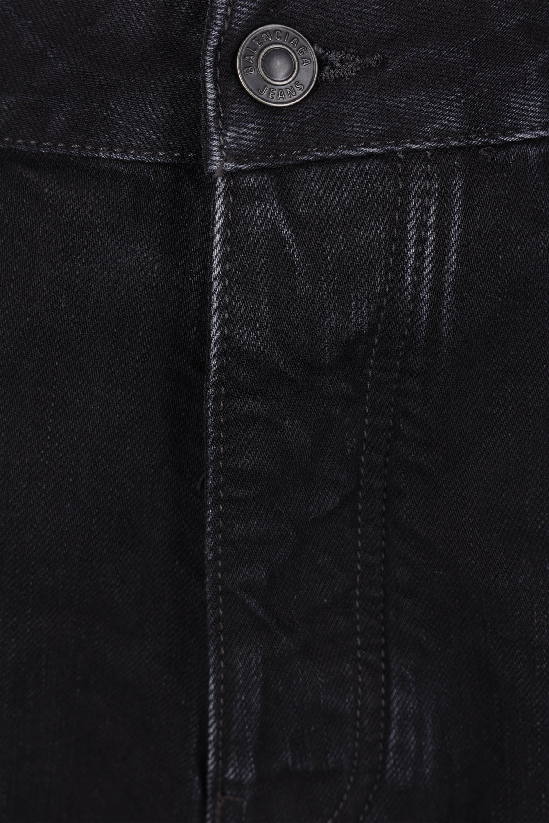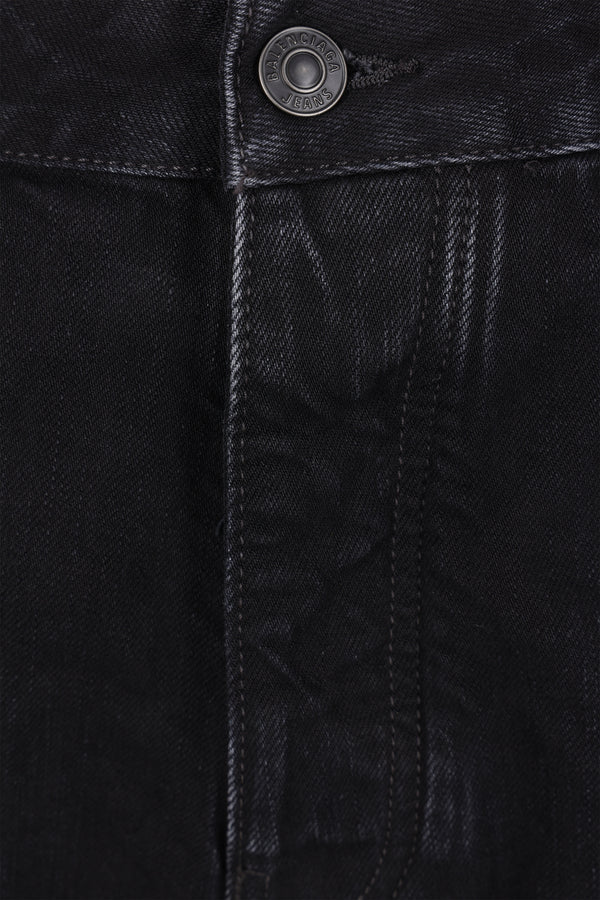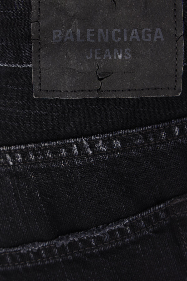 Balenciaga relaxed-fit jeans crafted from black cotton denim with washed and worn effect. Featuring front metal button closure, belt loops, five classic pockets, and rear logo patch.