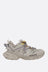Balenciaga low-top sneakers crafted from taupe grey faux leather, rubber, and mesh. Features dual lace-up closure, rounded toe, rear cord lace fastening, side-printed logo, embroidered size on the toe, fabric-lined interior, and oversized rubber sole.