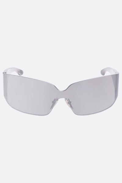 Balenciaga sunglasses made of mirrored silver injected nylon, featuring the Balenciaga logo engraved on the left temple and adjustable nose pads with the BB logo.