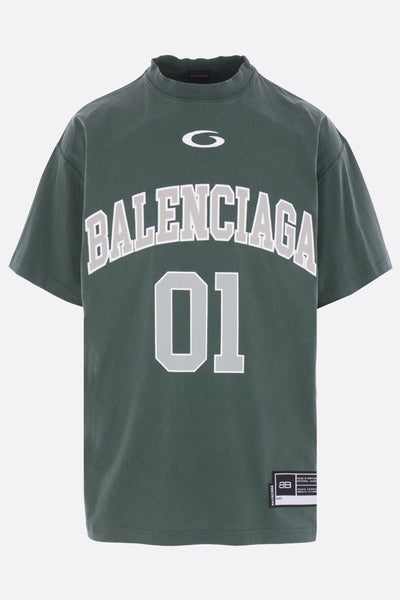 Balenciaga oversized t-shirt crafted from yellow cotton jersey, featuring embroidered basketball motif on the front and back. Designed with a crew neckline, short sleeves, and straight hem.