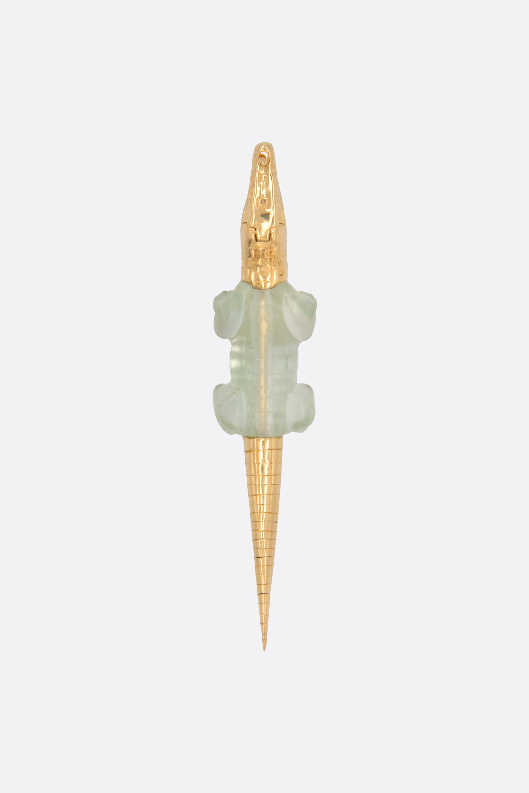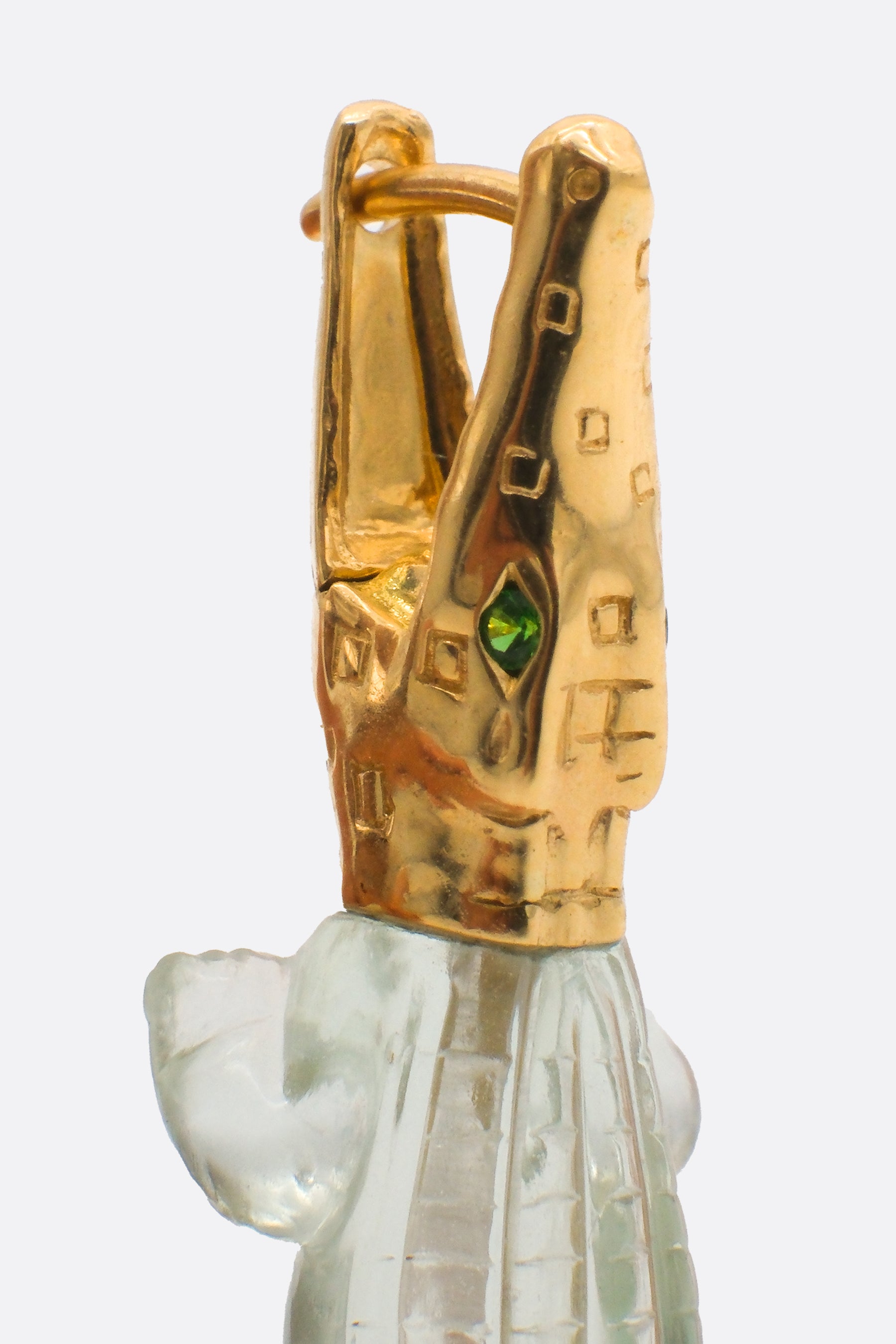 Bibi Van Der Velden's single earring crafted in 18k yellow gold with alligator head-shaped detail embellished by tsavorite eyes and green amethyst body. Featuring a latch back closure for pierced ears.