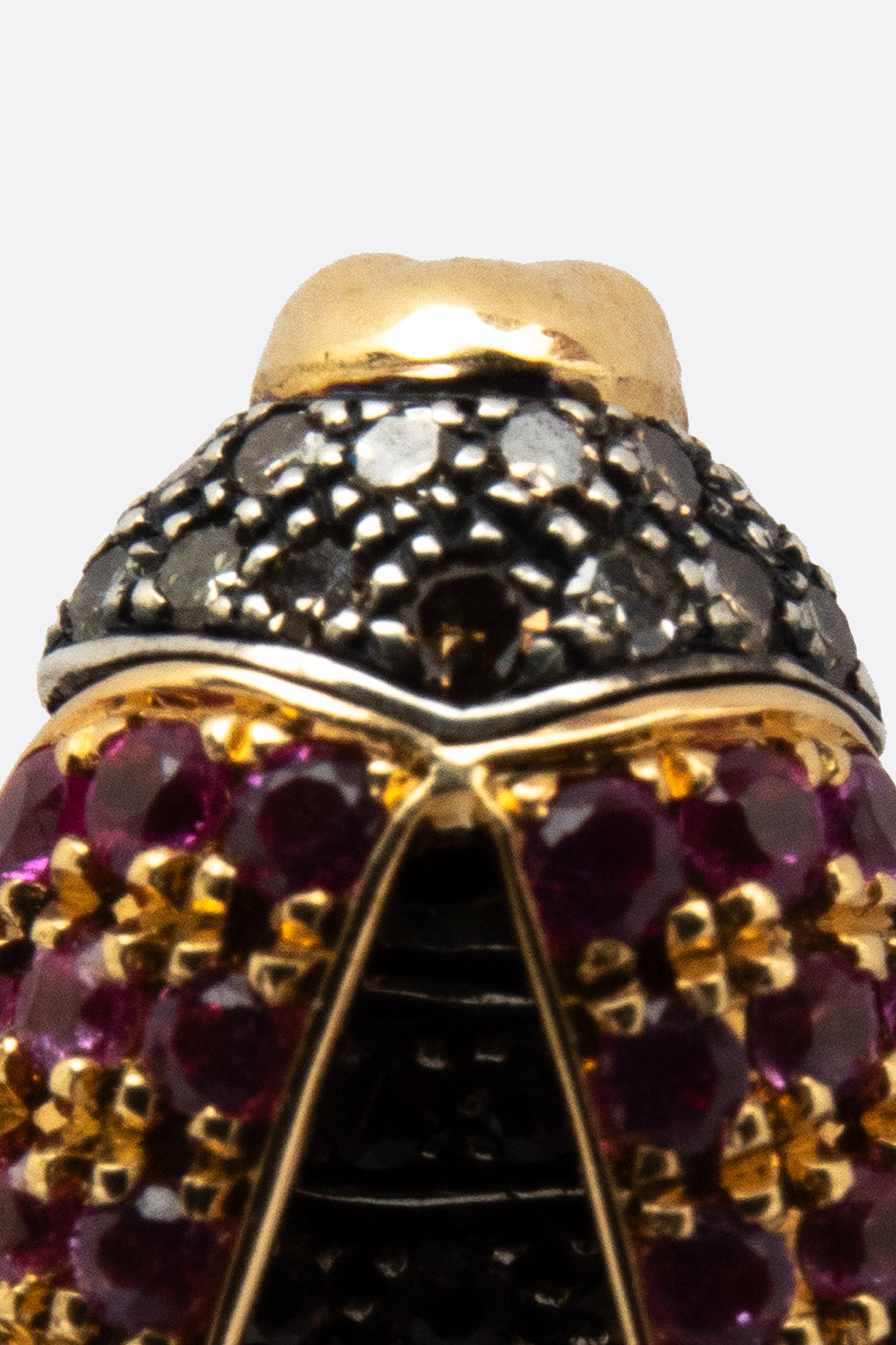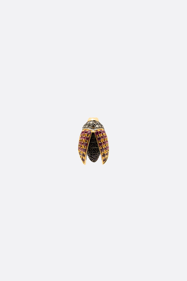 Bibi Van Der Velden single earring crafted from 18k yellow gold and sterling silver, embellished with brown diamonds, pink sapphires, and amethyst. Featuring a butterfly back closure for pierced ears.