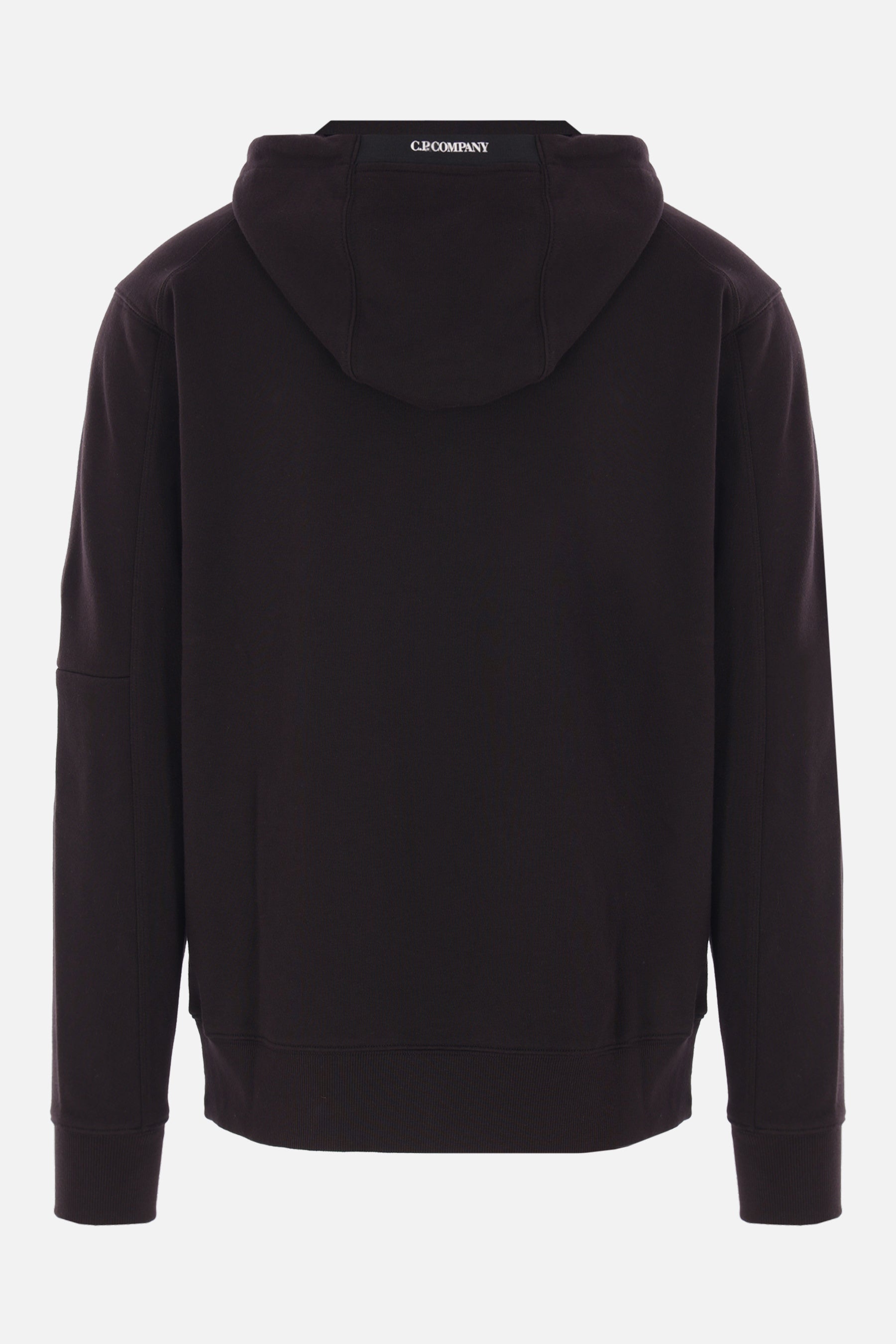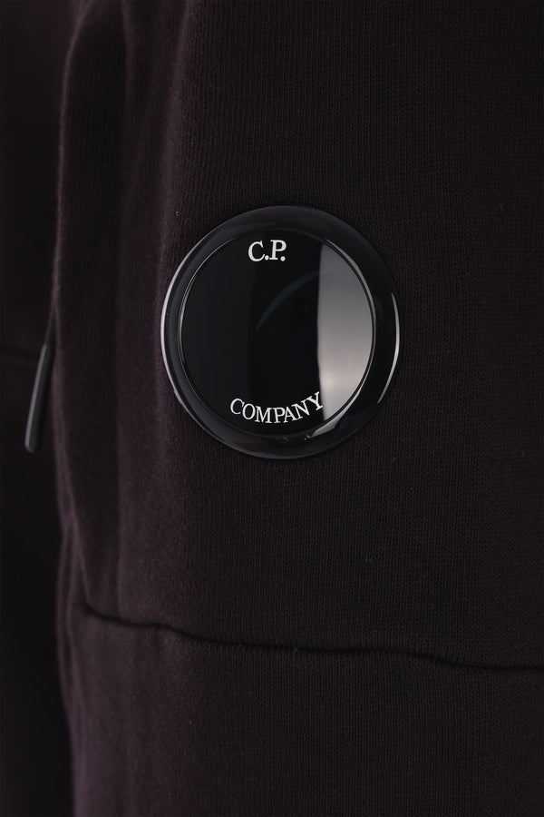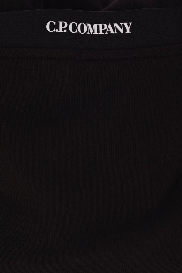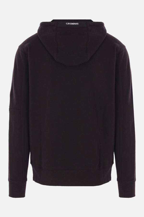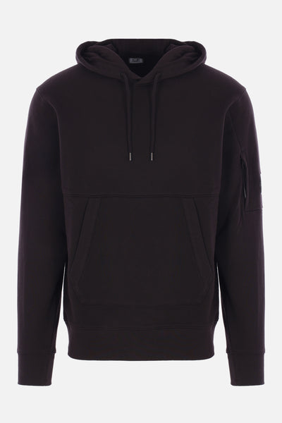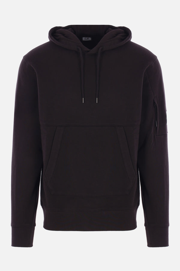 C.P. Company hoodie crafted in black cotton jersey with a sleeve pocket enhanced by the signature C.P. Company Lens detail. Featuring a kangaroo pocket, long sleeves, ribbed trims, and a straight hem.