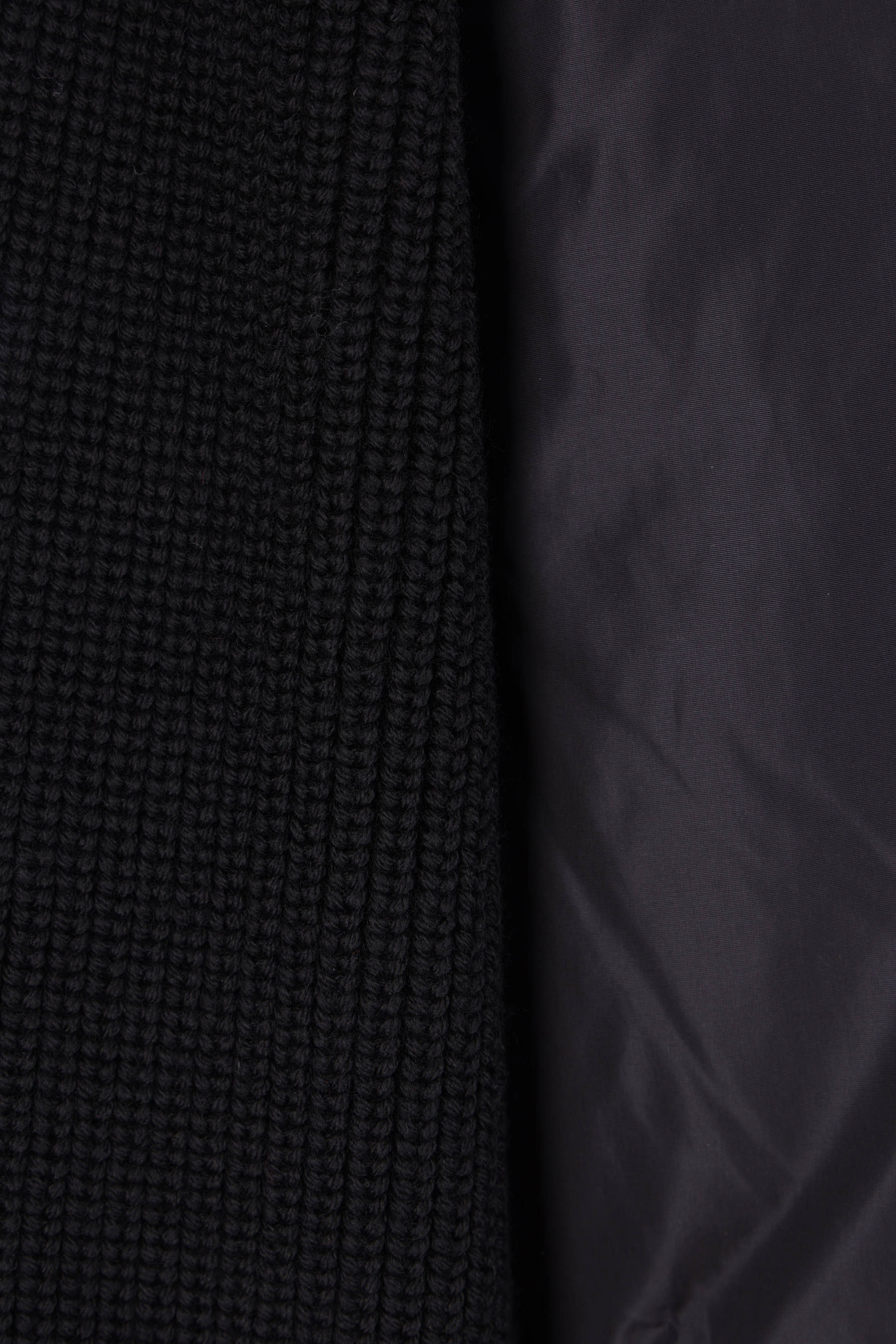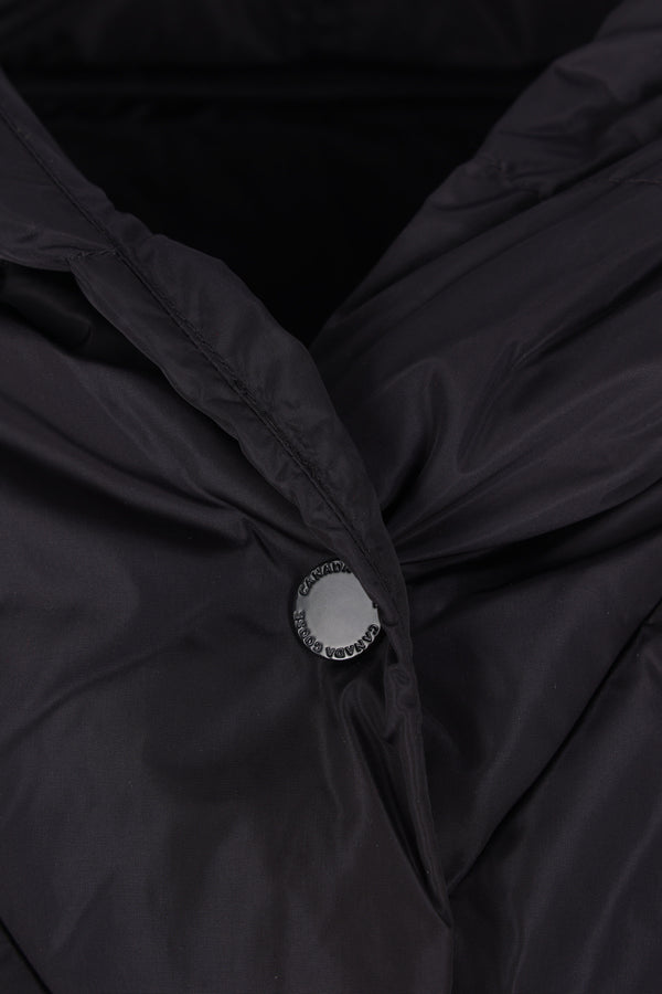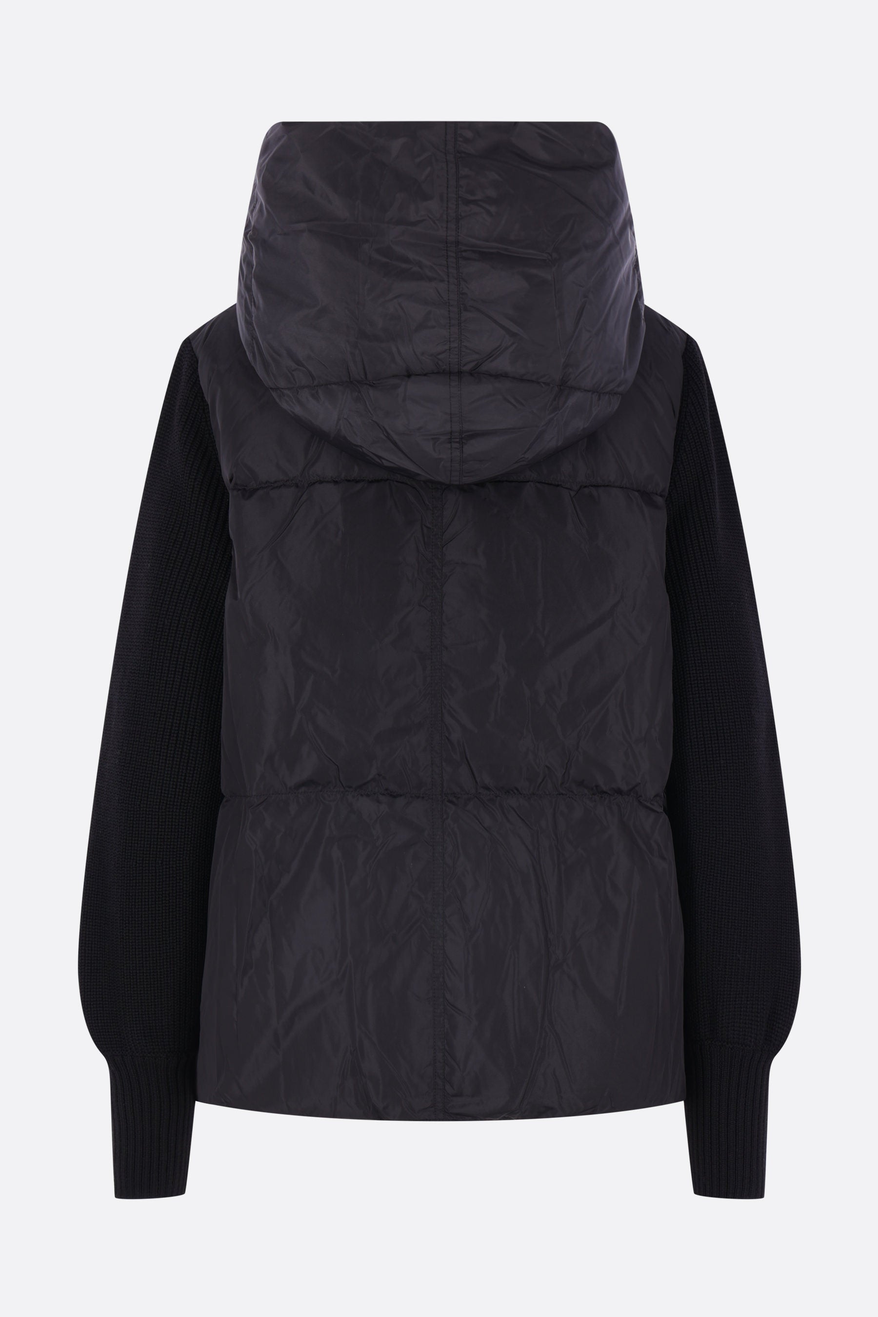 Canada Goose down jacket in black nylon with tone-on-tone wool knit sleeves. Featuring a classic hood, front snap button closure, invisible side pockets, and straight hem. Finished with a metal logo plaque at the back.