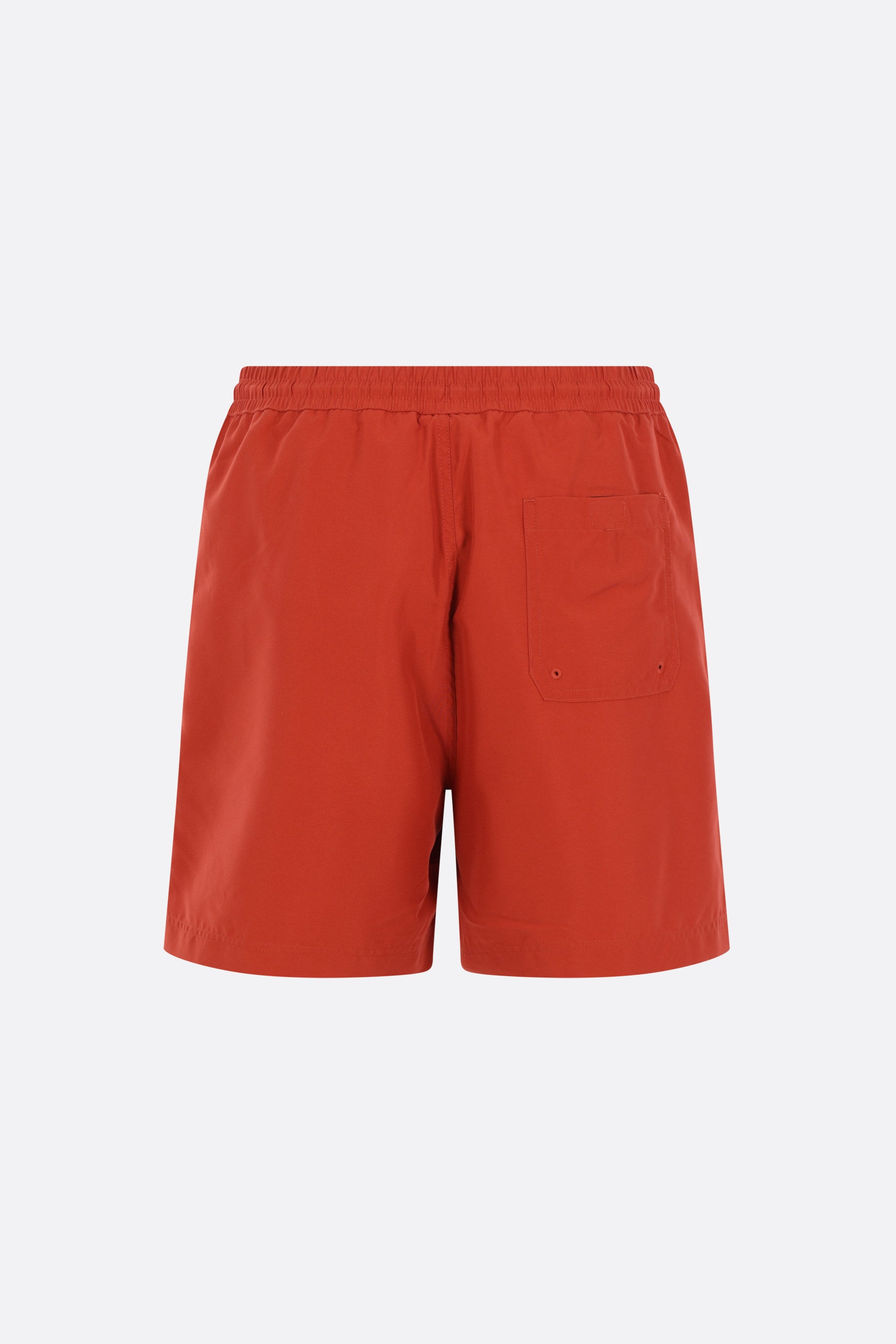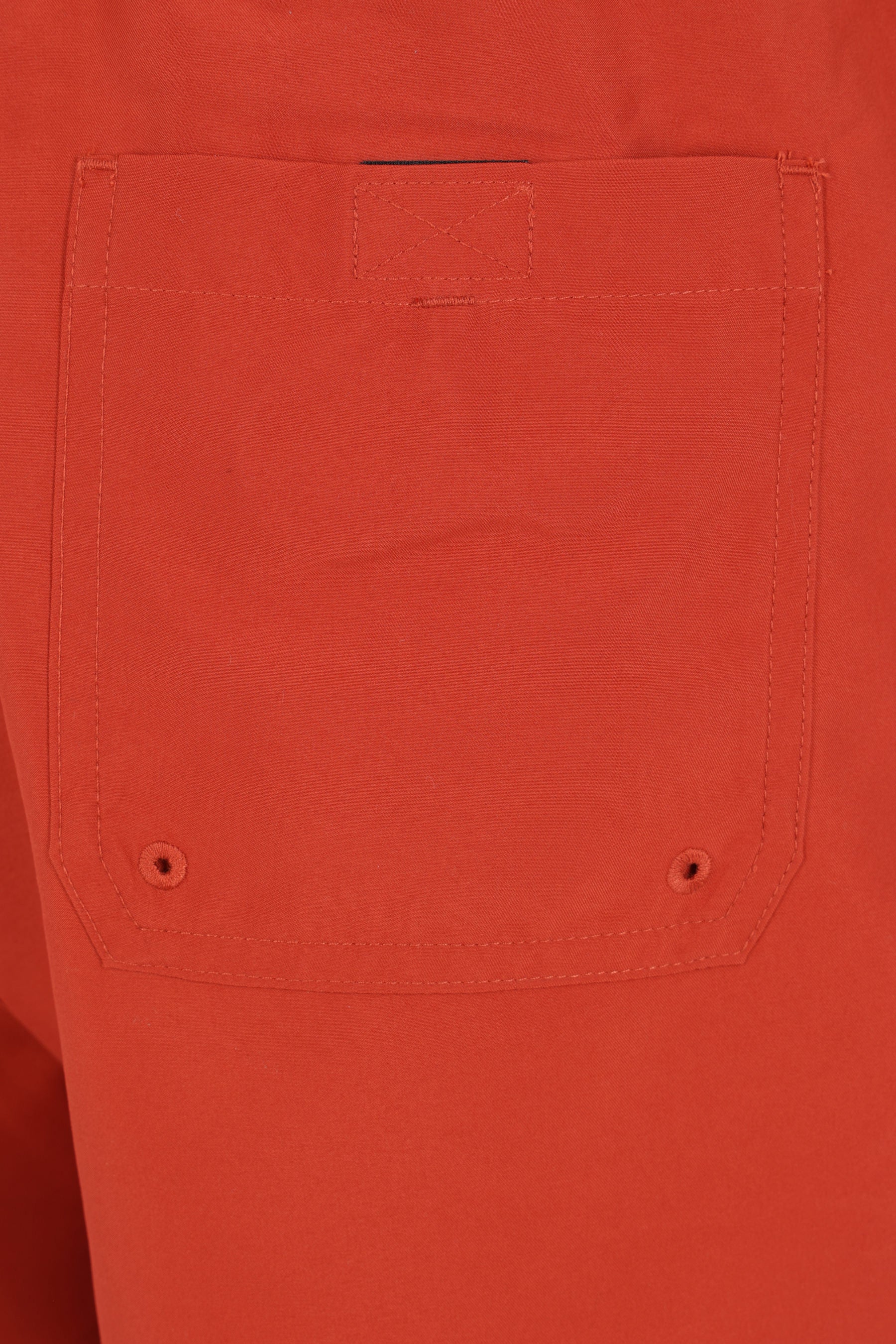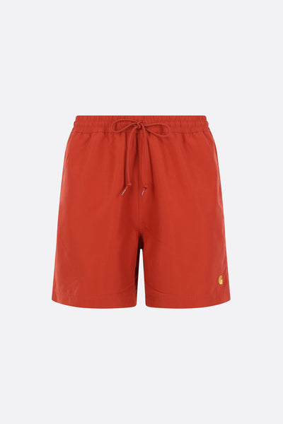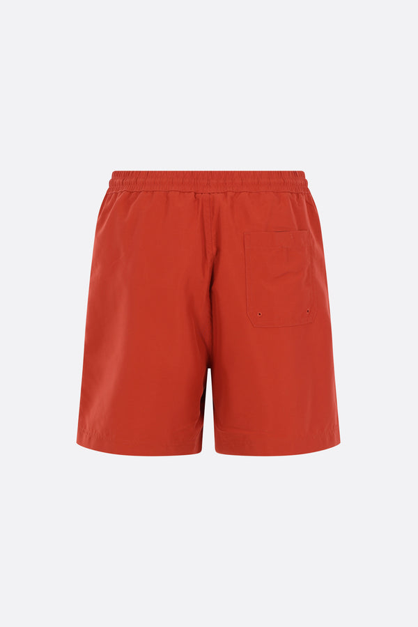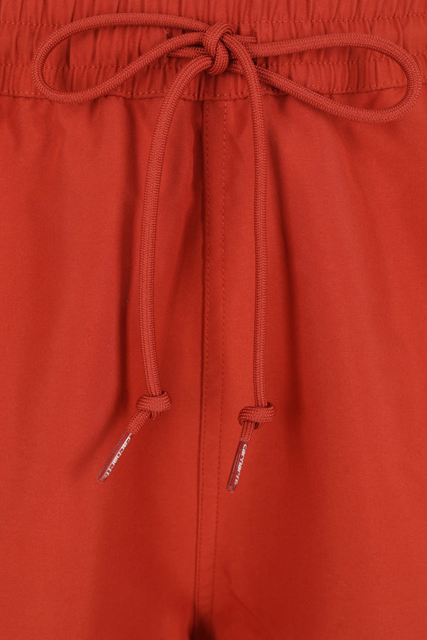 Carhartt WIP swim shorts crafted from brick-red nylon with a front embroidered logo. Featuring an elasticated waistband with drawstring, multiple pockets, and an internal mesh brief.