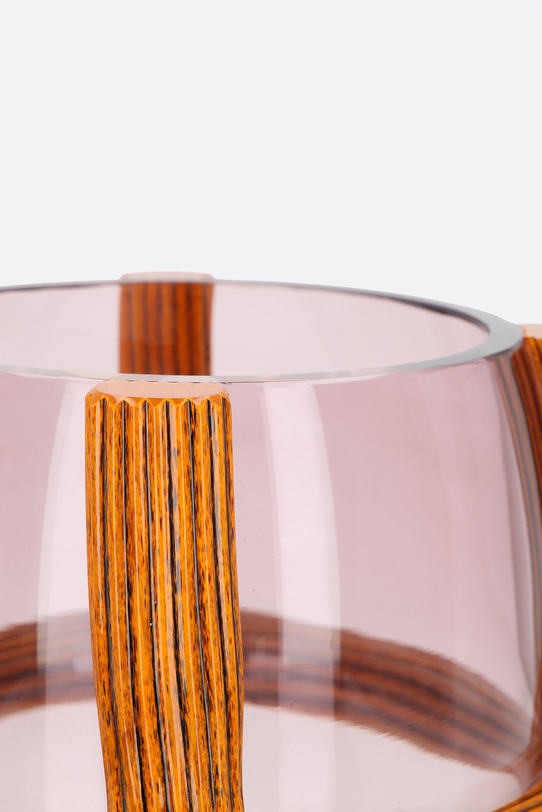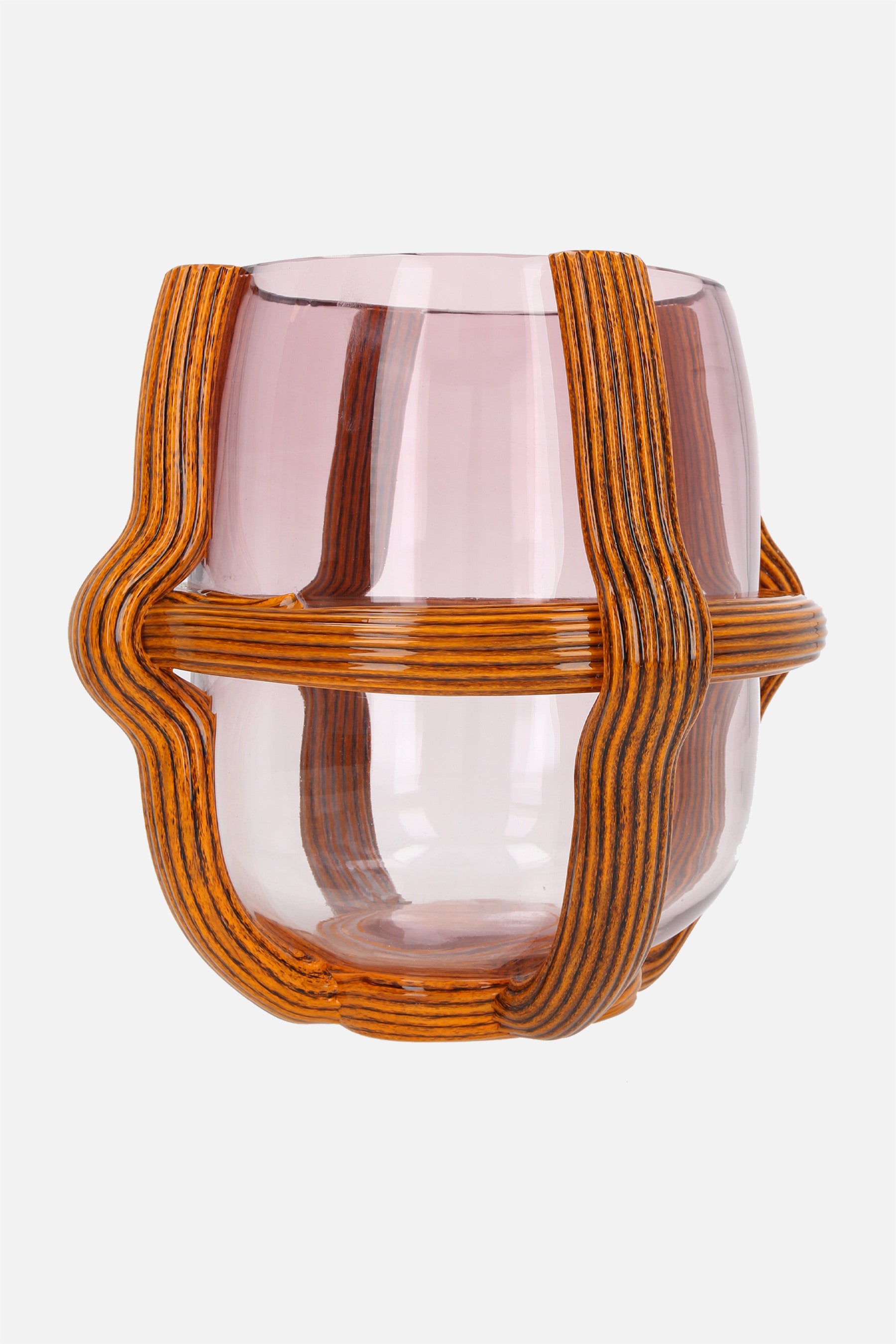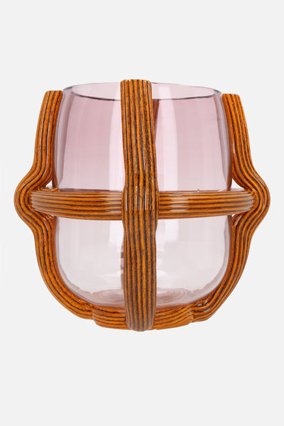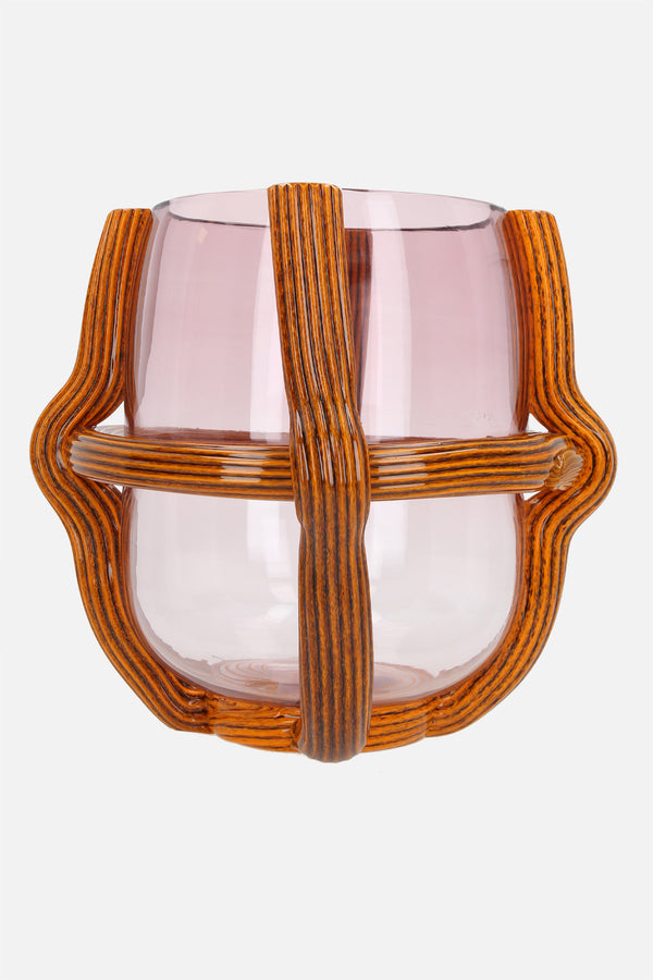 Cassina's vase designed in collaboration with Patricia Urquiola and crafted in pink Murano blown glass embellished by the net-like 'morise' cords, decorated with the typical striped motif of the lagoon.