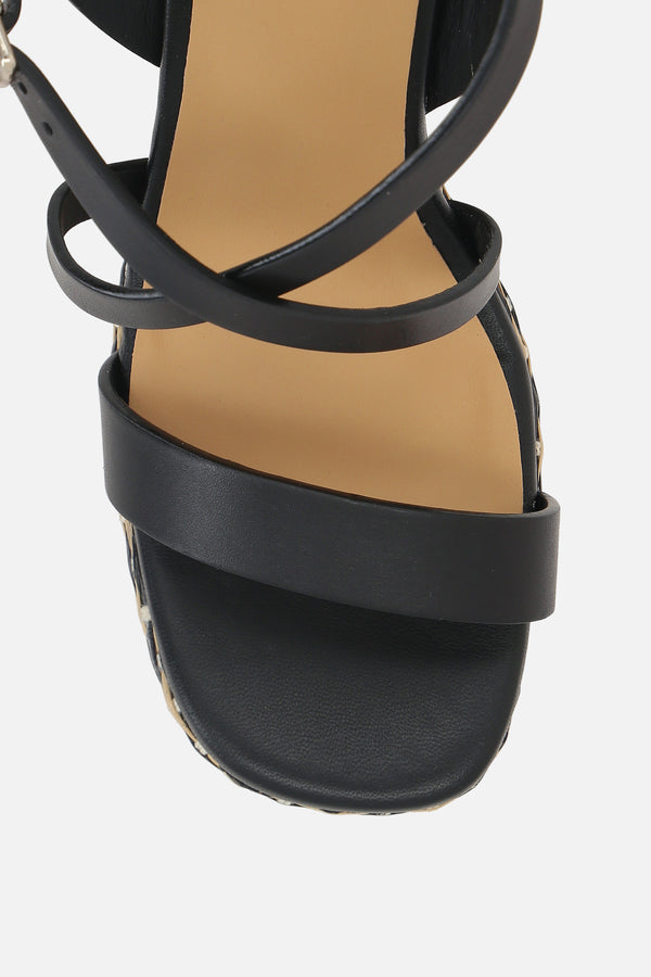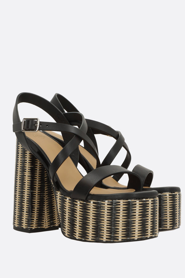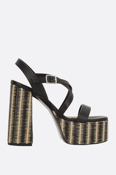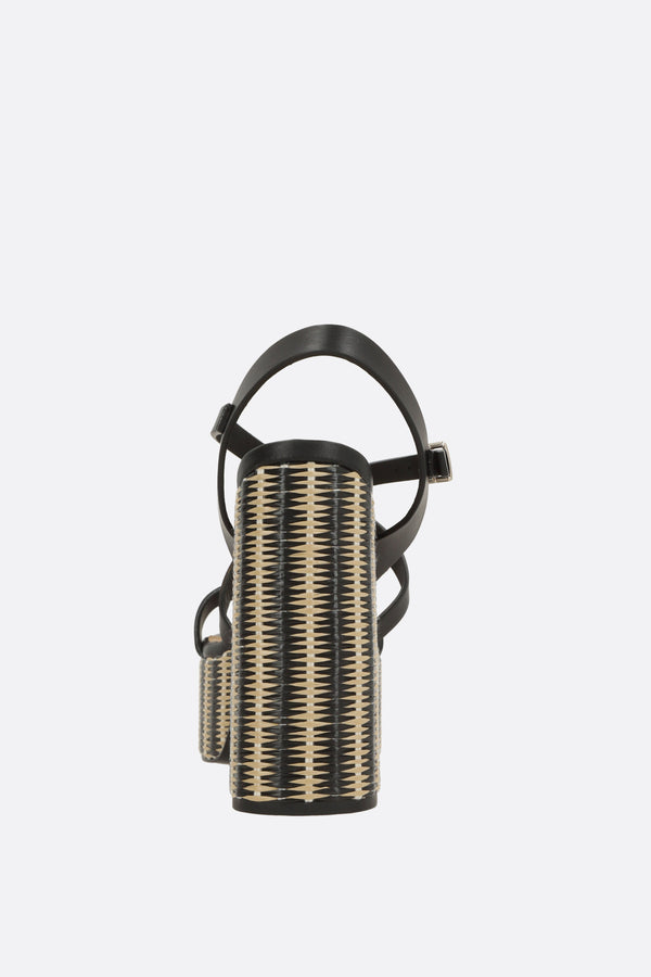 Castañer platform sandal made of smooth black leather. Features an adjustable ankle strap with a metal buckle, slightly squared toe, leather linings, and a leather sole. The design is completed by a chunky heel covered in two-tone braided raffia.