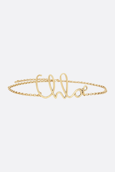 Chloé chain belt crafted in gold-finish brass with lettering logo detail on front. It features adjustable hook closure.