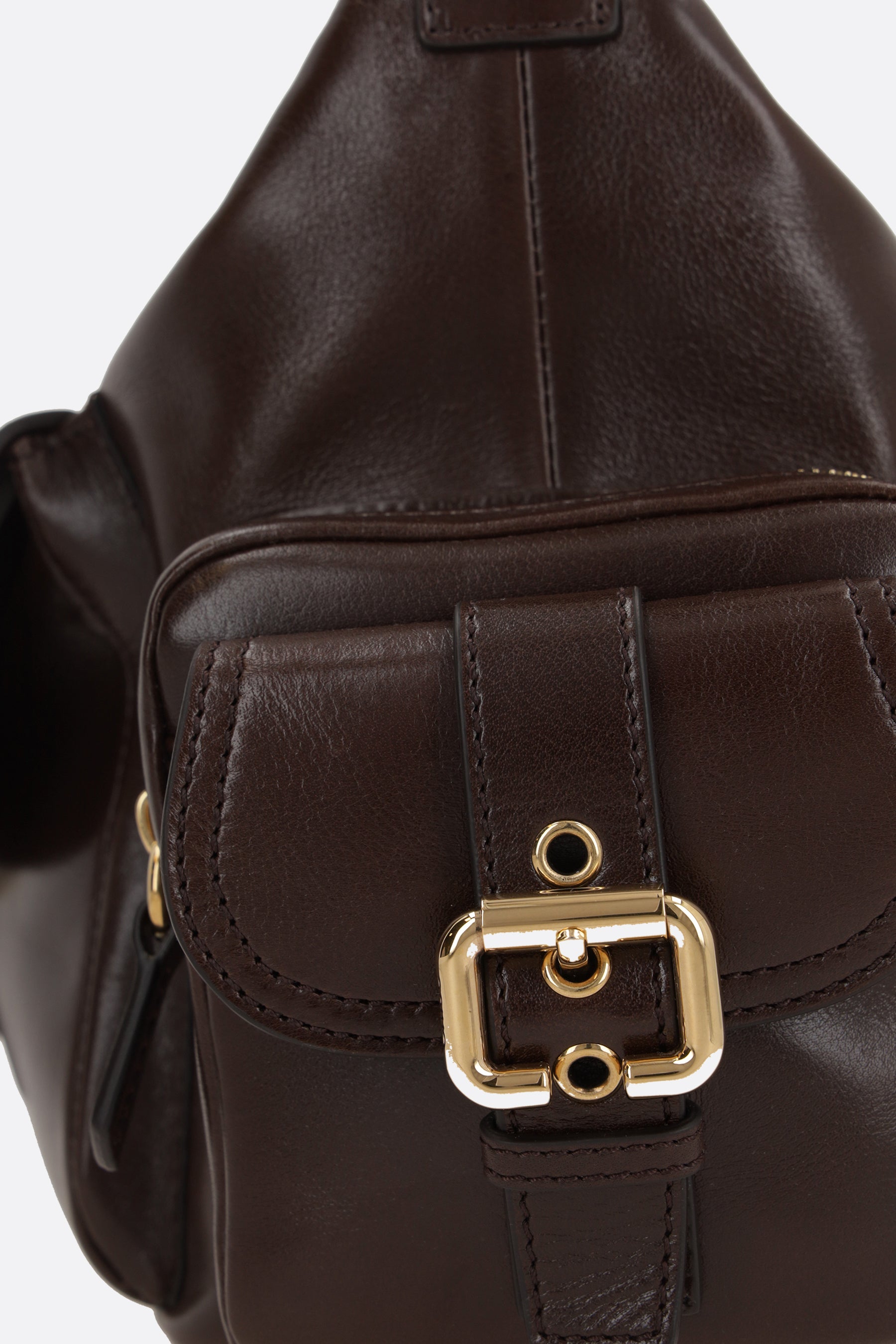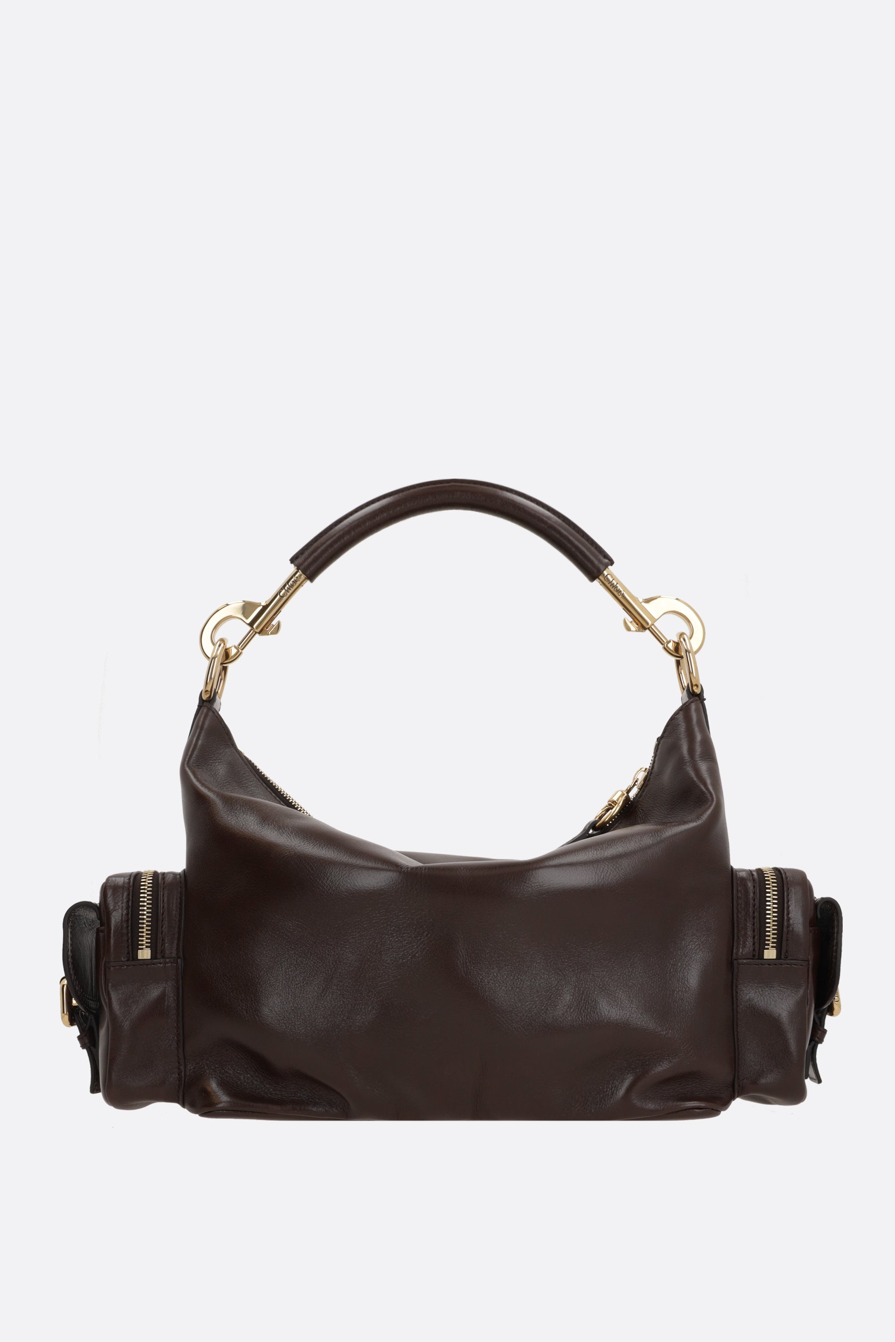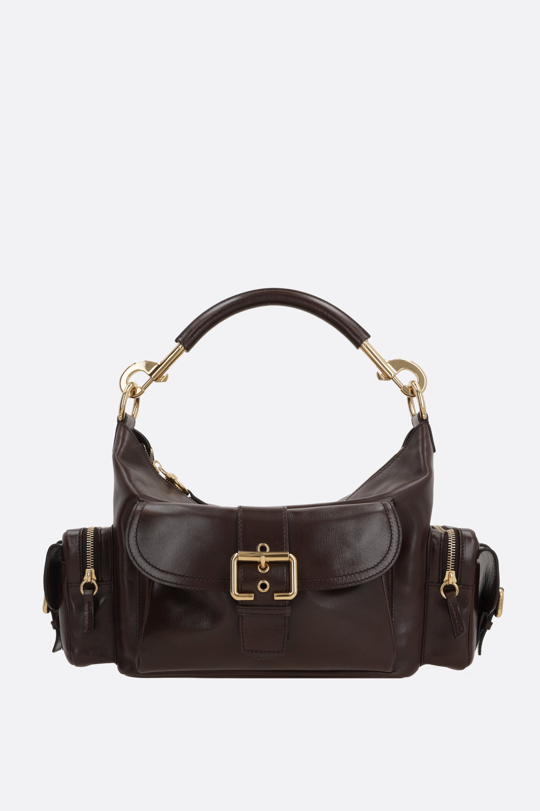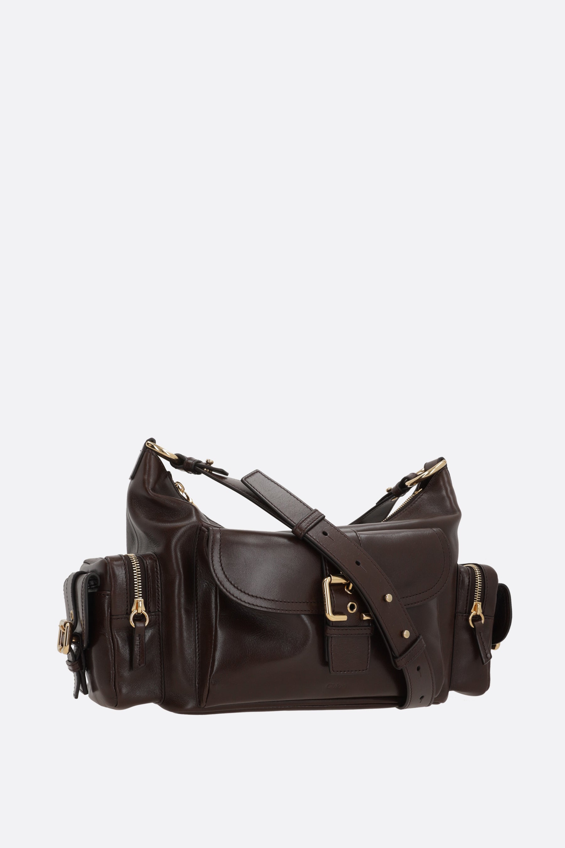 Chloé shoulder bag made of glossy leather. Features gold-tone hardware, zip closure, removable handle and adjustable/removable shoulder strap. The interior is lined with natural canvas and includes a flat pocket. The design is completed with three external pockets.