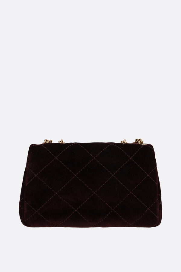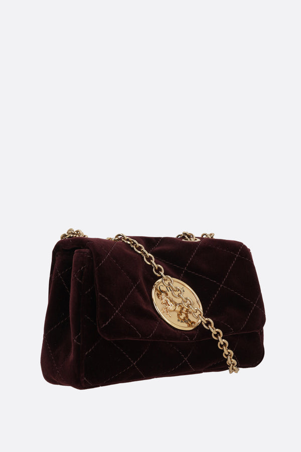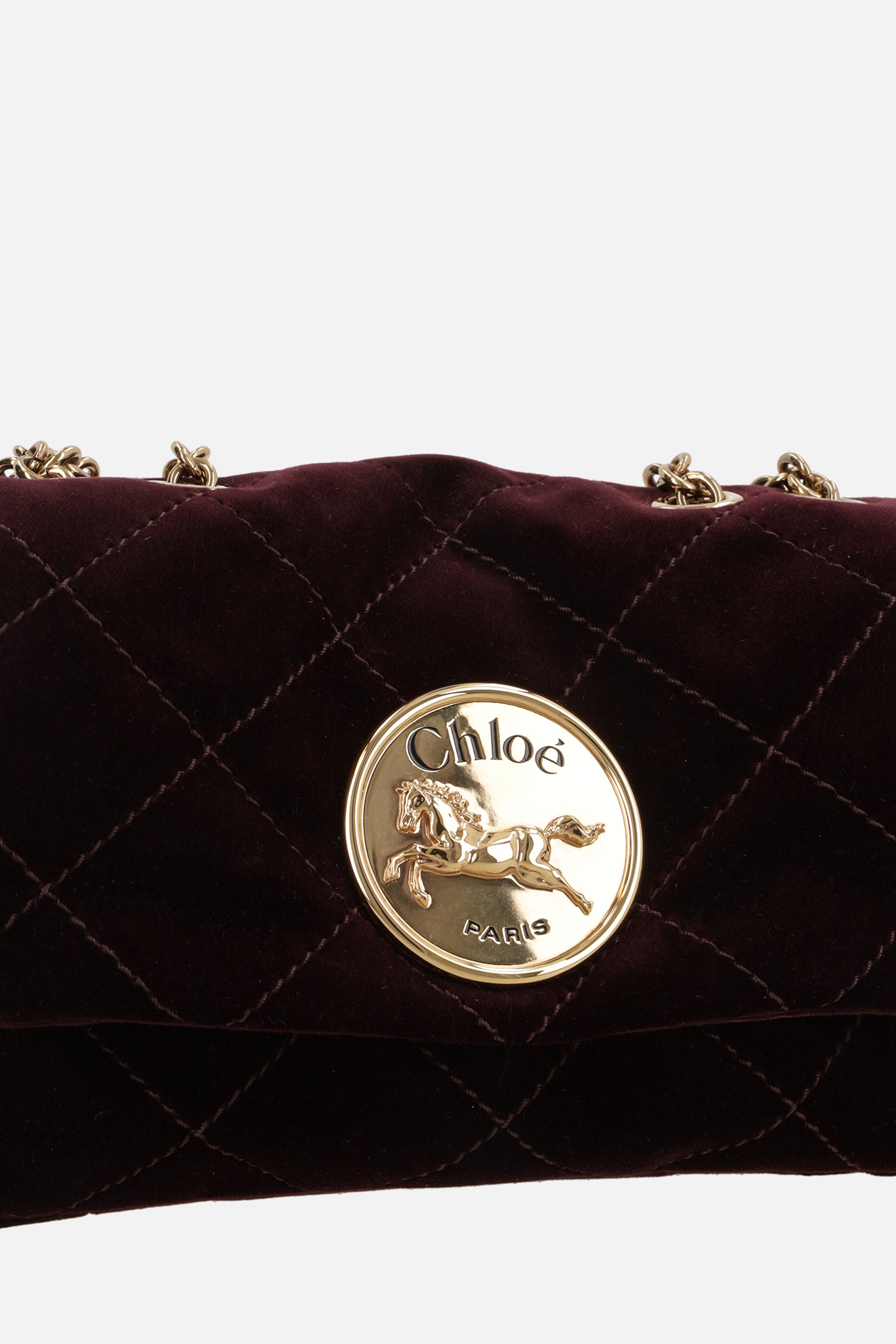 Chloé shoulder bag crafted in burgundy quilted velvet. Featuring gold-tone hardware, a magnetic button closure on the flap, and an adjustable chain shoulder strap with two lengths. The interior, lined in tone-on-tone leather, includes a flat pocket. The design is completed with the signature Horse Medal metal detail.