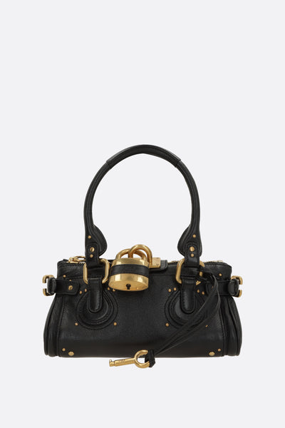 Chloé handbag crafted from black grained leather with metal studs. Featuring gold-tone hardware, zip closure, double handles, side buckles, and an oversized decorative padlock with keys. The black canvas-lined interior includes a zip pocket. The design is completed with flat pockets on both sides.
