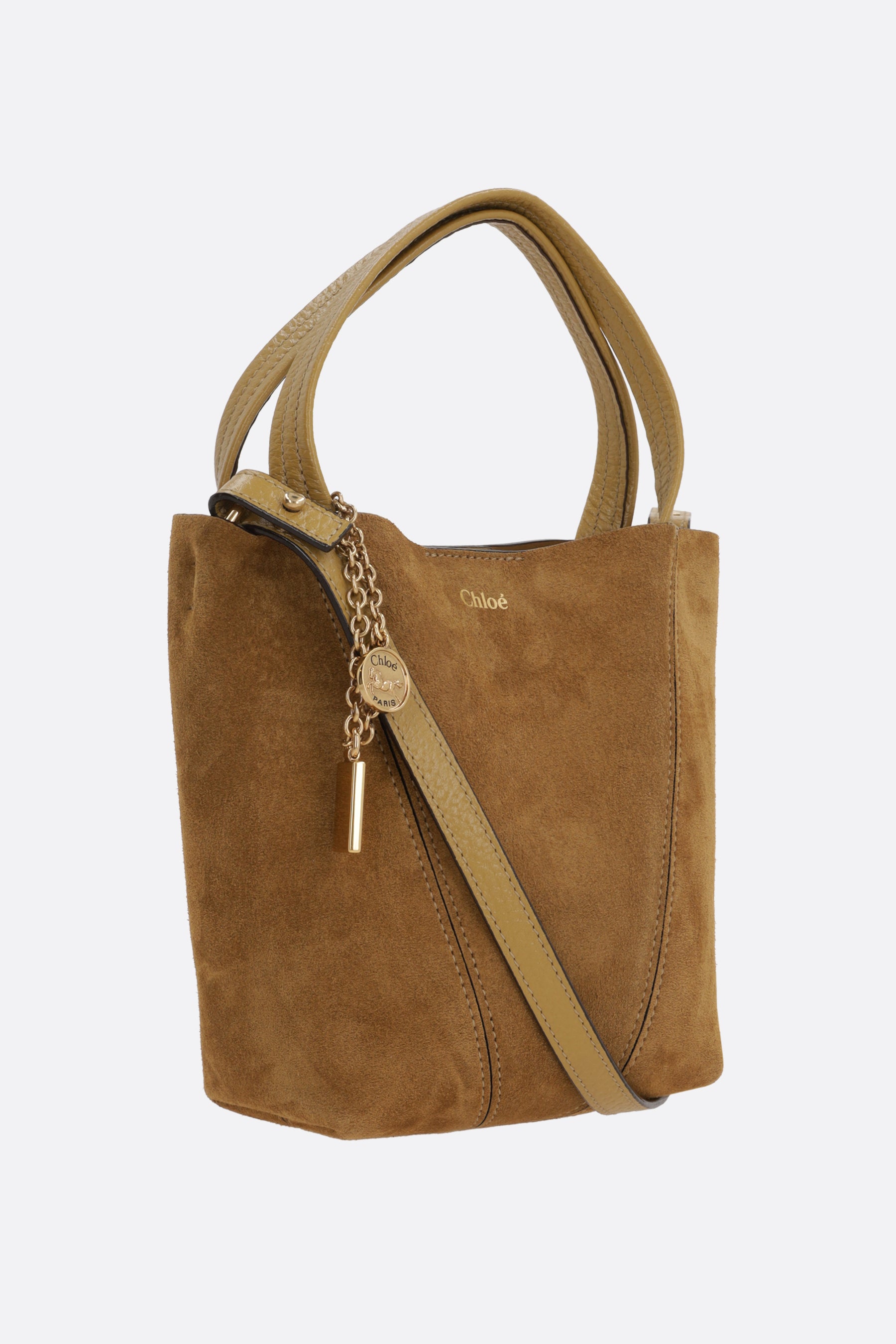 Chloé tote bag crafted from light brown suede. Featuring gold-tone hardware, interior magnetic button closure, double top handles, adjustable/removable strap, and a decorative chain with Chloé and Horse pendants. The interior is lined in tone-on-tone leather. Can be worn over the shoulder or carried by hand with the handles tucked inside the ring.