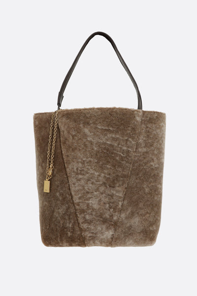 Chloé tote bag made of taupe grey shearling with dark brown hammered leather details. It features gold-tone hardware, double handles, and a decorative chain with Chloé and Horse pendants. The tone-on-tone suede-lined interior allows the bag to be worn on the shoulder or carried by hand with the handles inserted through the ring.