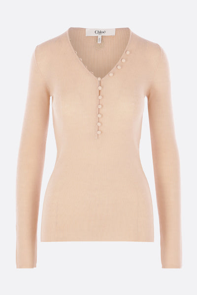 Chloé pullover made of powder pink wool knit. Features a V-neckline with tone-on-tone buttons, long sleeves, and a straight hem.