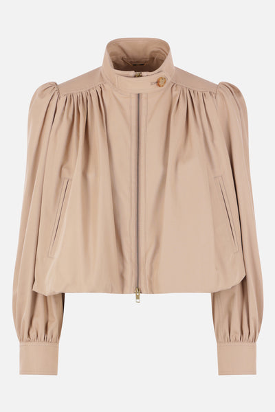 Chloé cropped jacket in beige cotton canvas. Featuring a high collar with buttoned tab, double-zip front closure, double-welt pockets, gathering on the shoulders and back, long puffed sleeves with buttoned cuffs, and balloon hem. Lined interior.