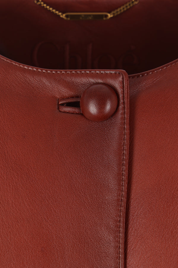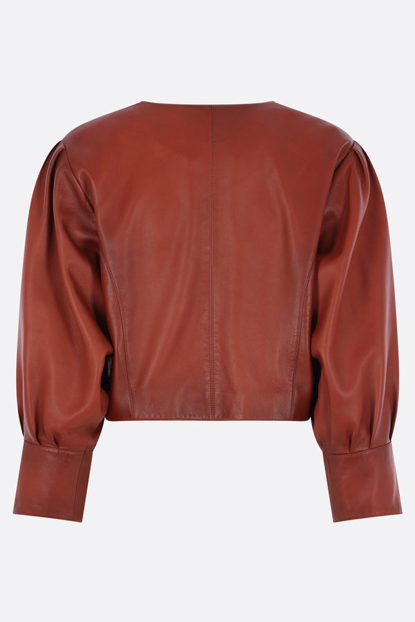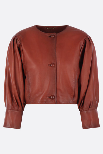 Chloé cropped jacket in burnt brown plongé nappa. Featuring a round neckline, front closure with fabric-covered buttons, padded shoulders, long puffed sleeves with buttoned cuffs, invisible side pockets, and a straight hem. Lined interior.
