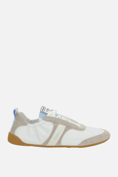 Chloé low-top sneakers crafted from white nylon and grey suede, with smooth leather side panels embossed with the iconic logo. Featuring lace-up closure, round toe, leather/fabric lining, and a flexible recycled rubber sole. The design is completed with a logo label on the tongue and a grosgrain logo pull tab on the heel.