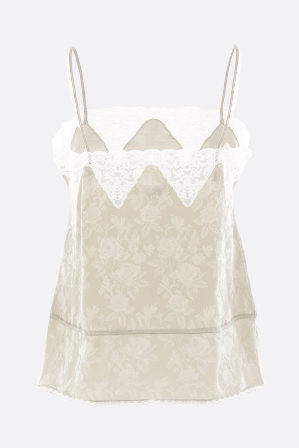 Chloé top crafted from clear green floral-patterned silk jacquard with tone-on-tone lace inserts. Features a straight neckline, thin shoulder straps, scalloped edges, straight hem with drawstring, and side slits.