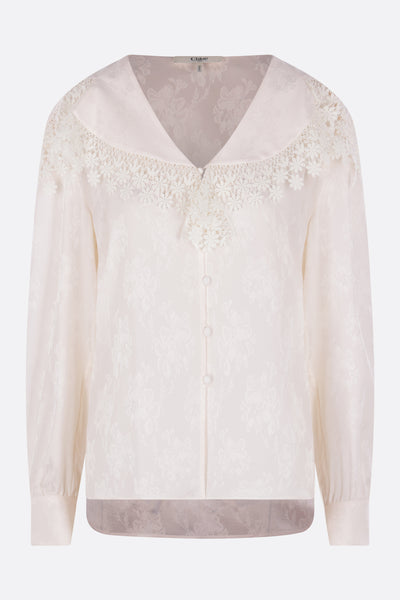Chloé blouse crafted from ivory silk jacquard with a floral pattern. Featuring an oversized collar with tone-on-tone lace trim, front button fastening with covered buttons, long sleeves with buttoned cuffs, and a straight hem.