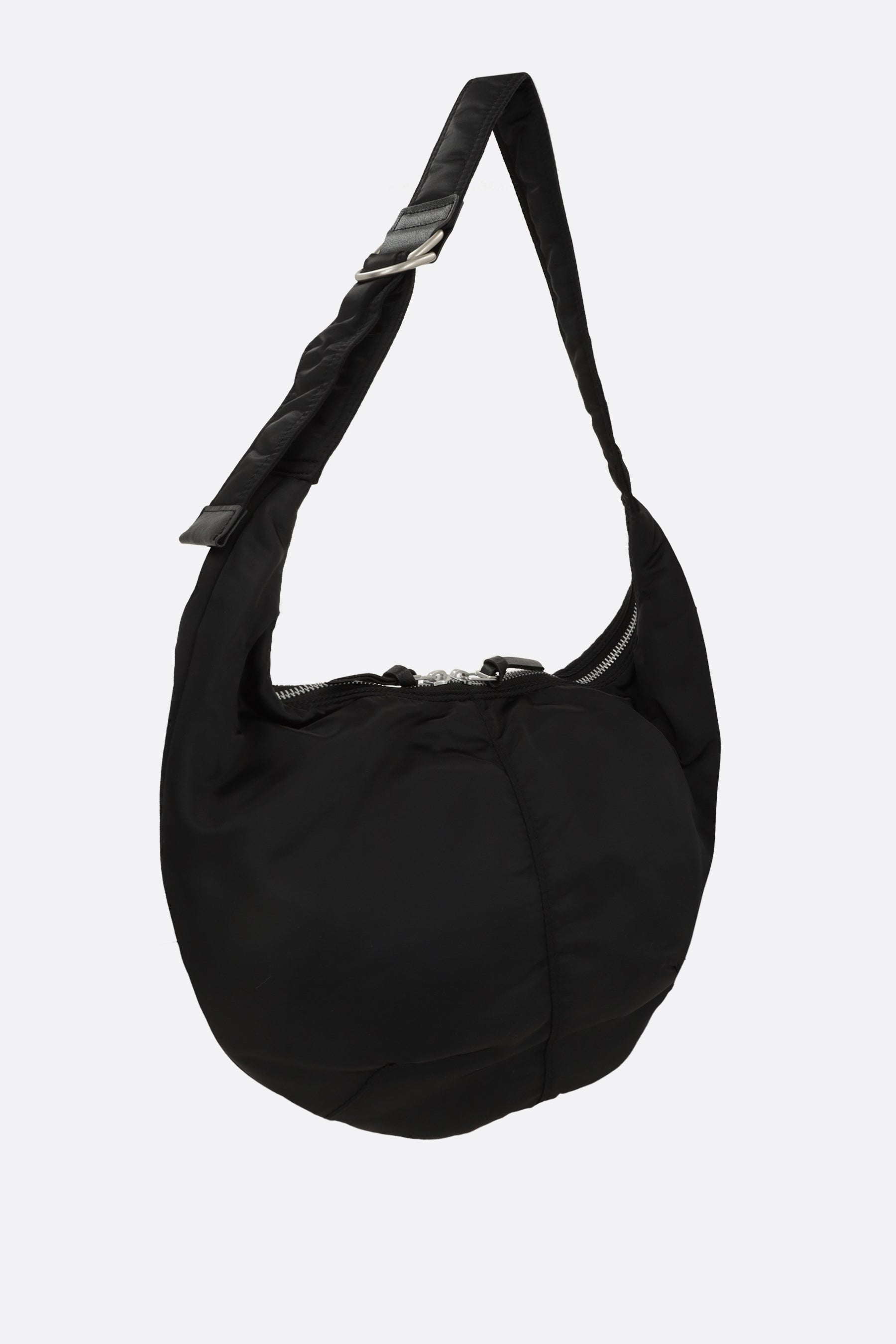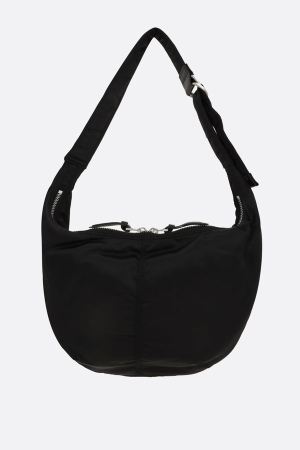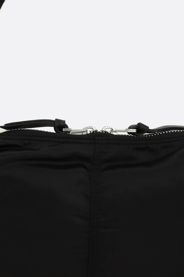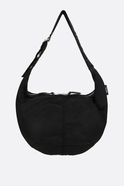 Shoulder bag by Comme des Garçons HOMME made from black technical fabric. Featuring silver-tone hardware, a double-slider zip closure, and an adjustable shoulder strap. The interior, lined with camouflage fabric, includes a flat pocket. The design is completed by a side-stitched logo tag.