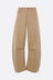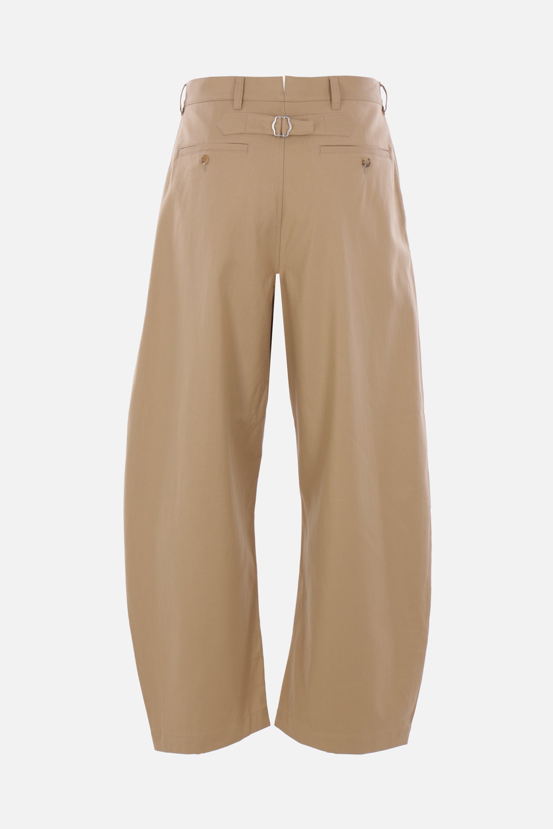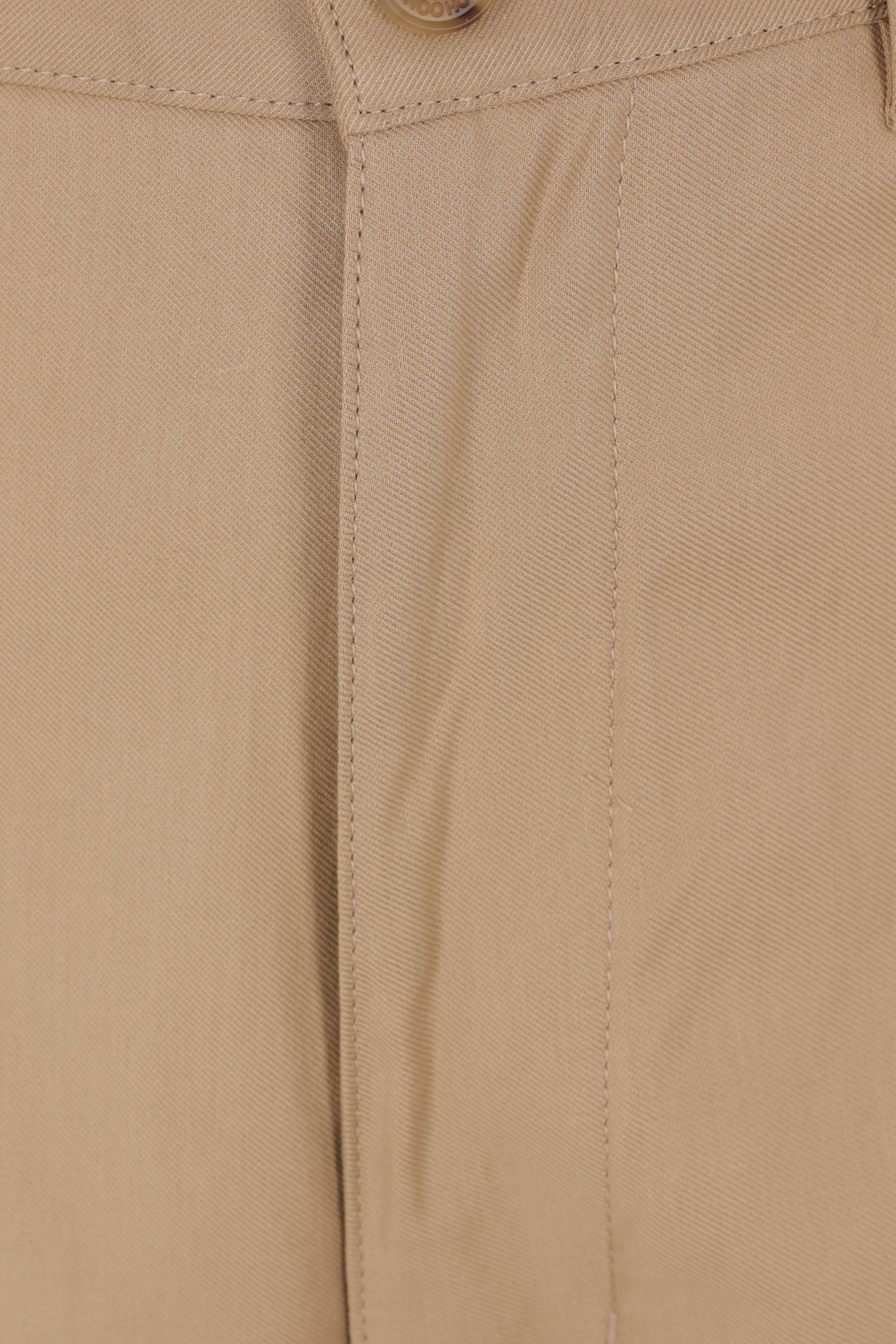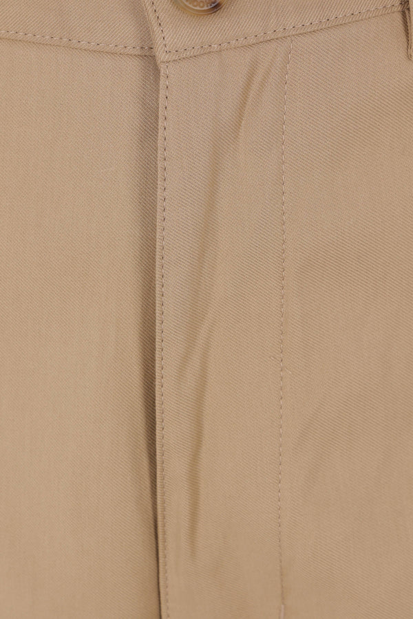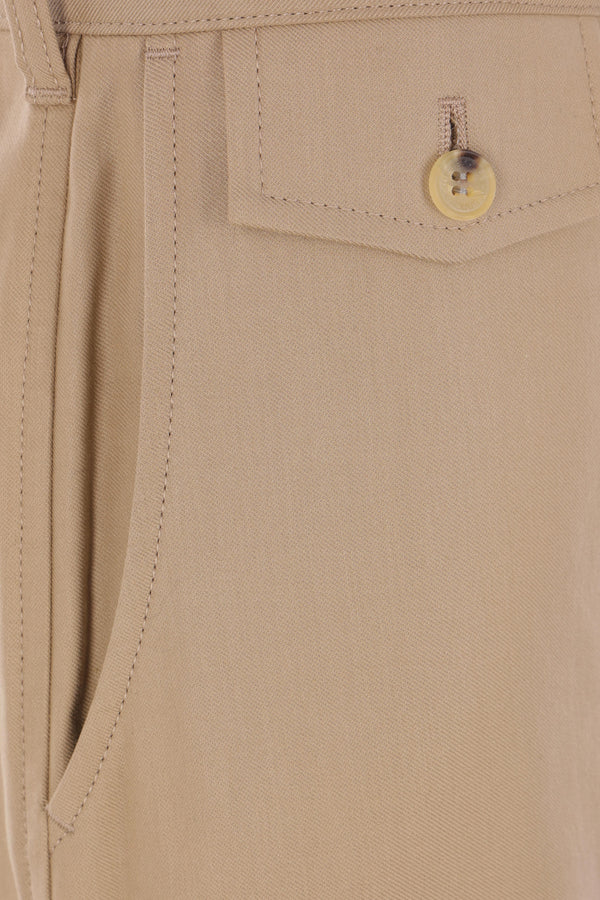 Comme des Garçons Homme trousers made from beige cotton gabardine. Features front button and zip closure, belt loops, multiple pockets, knee pleated detail, and back martingale.