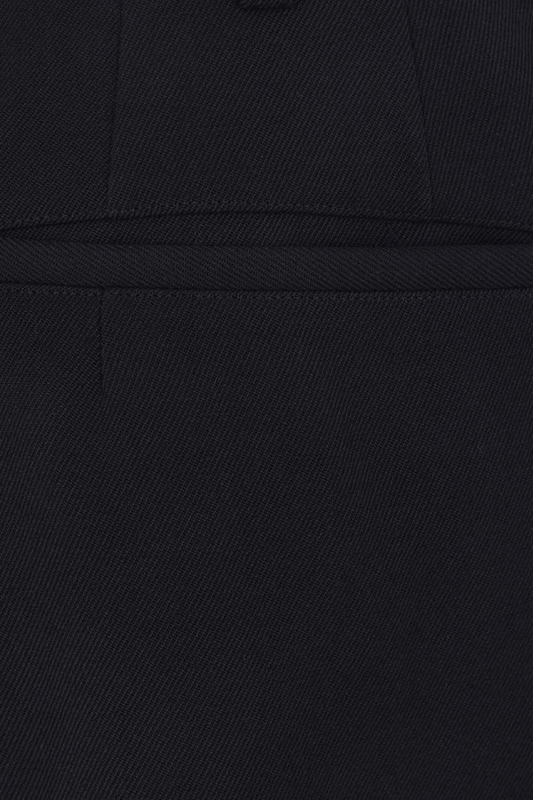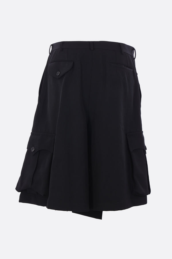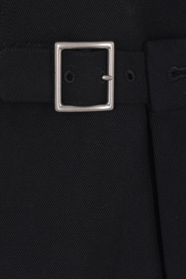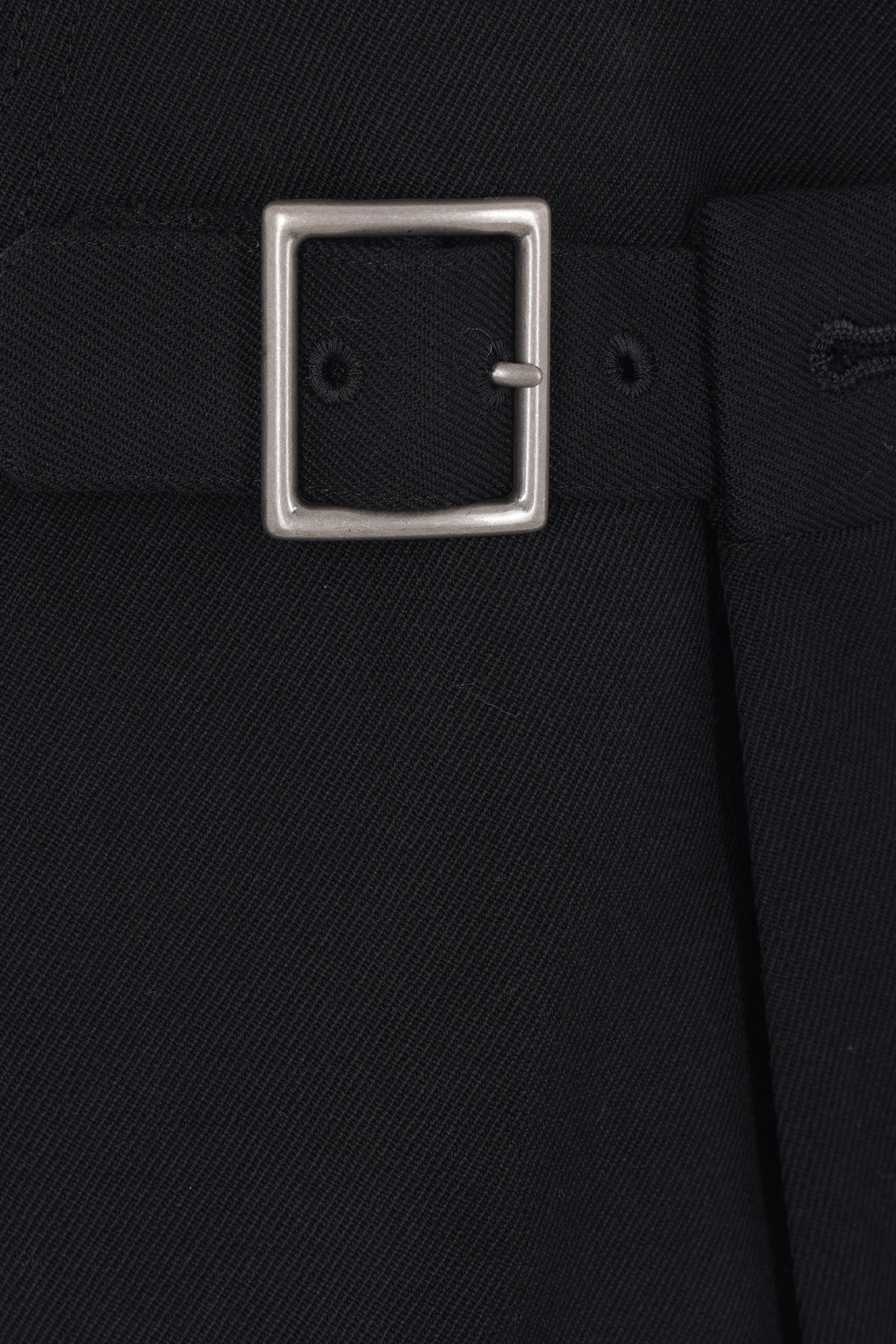 Comme des Garçons Homme Plus wrap skort crafted from black wool gabardine. Featuring button/zip closure, belt loops, multiple pockets, asymmetrical front panel with adjustable side strap, and unlined interior.