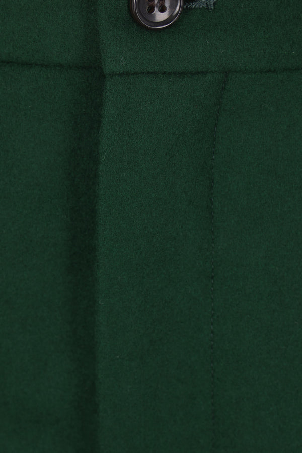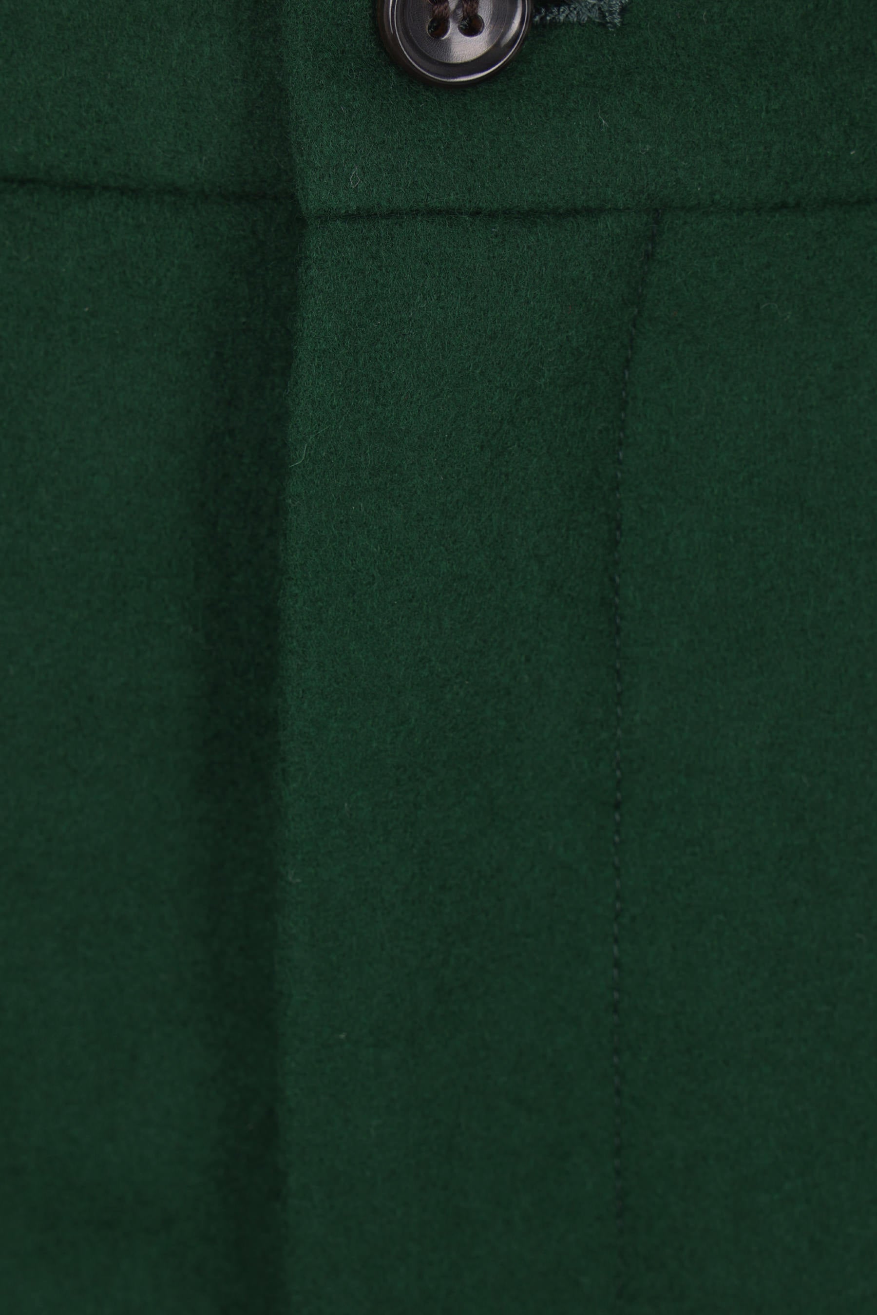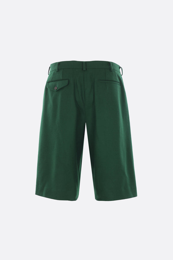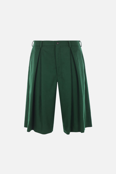 Comme des Garçons Homme Plus shorts made from green wool. Features button and zip closure, belt loops, front pleats, multiple pockets, and partially lined interior.