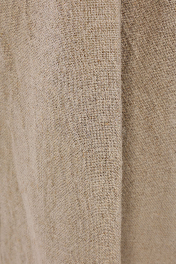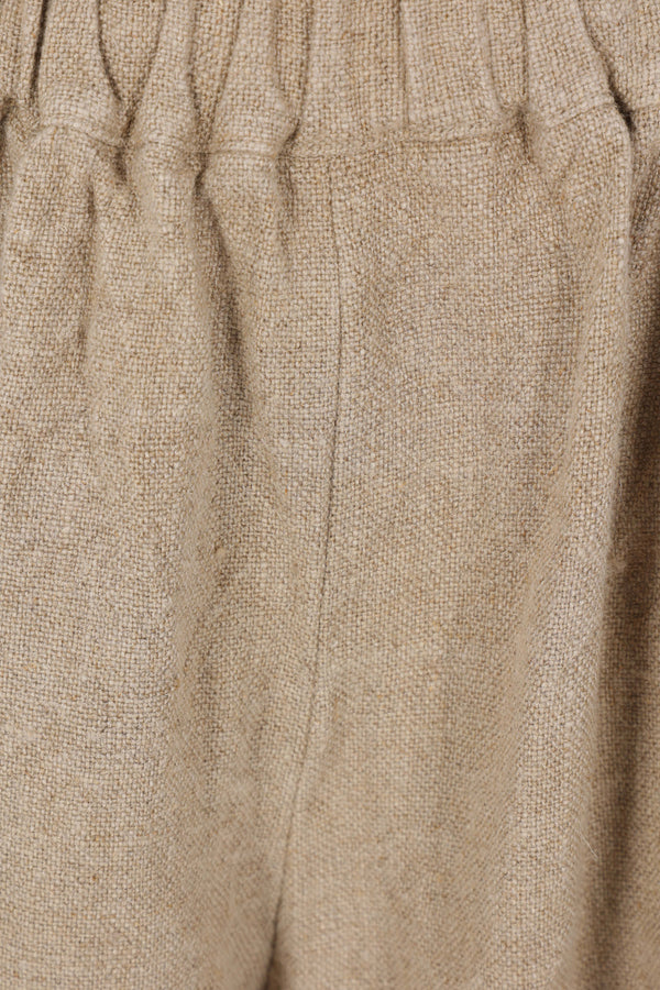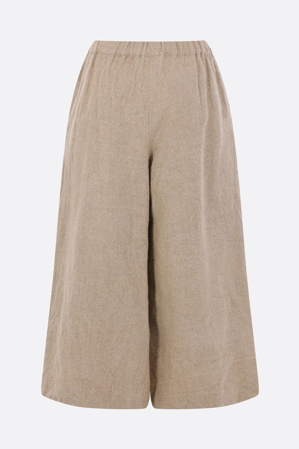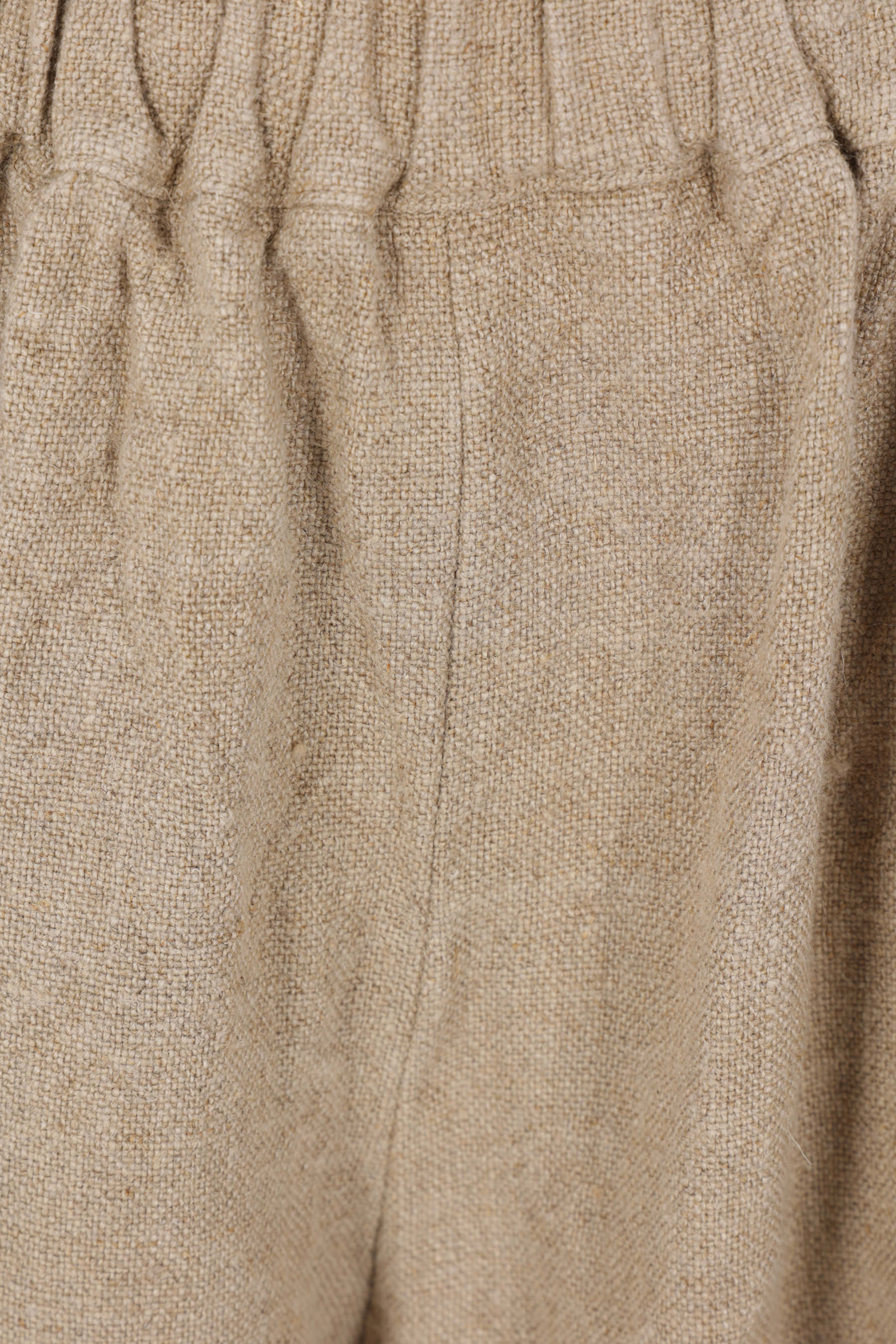 Comme des Garçons cropped trousers crafted from ecru linen canvas. Featuring an elasticated waistband with drawstring, concealed side pockets, and an unlined interior.