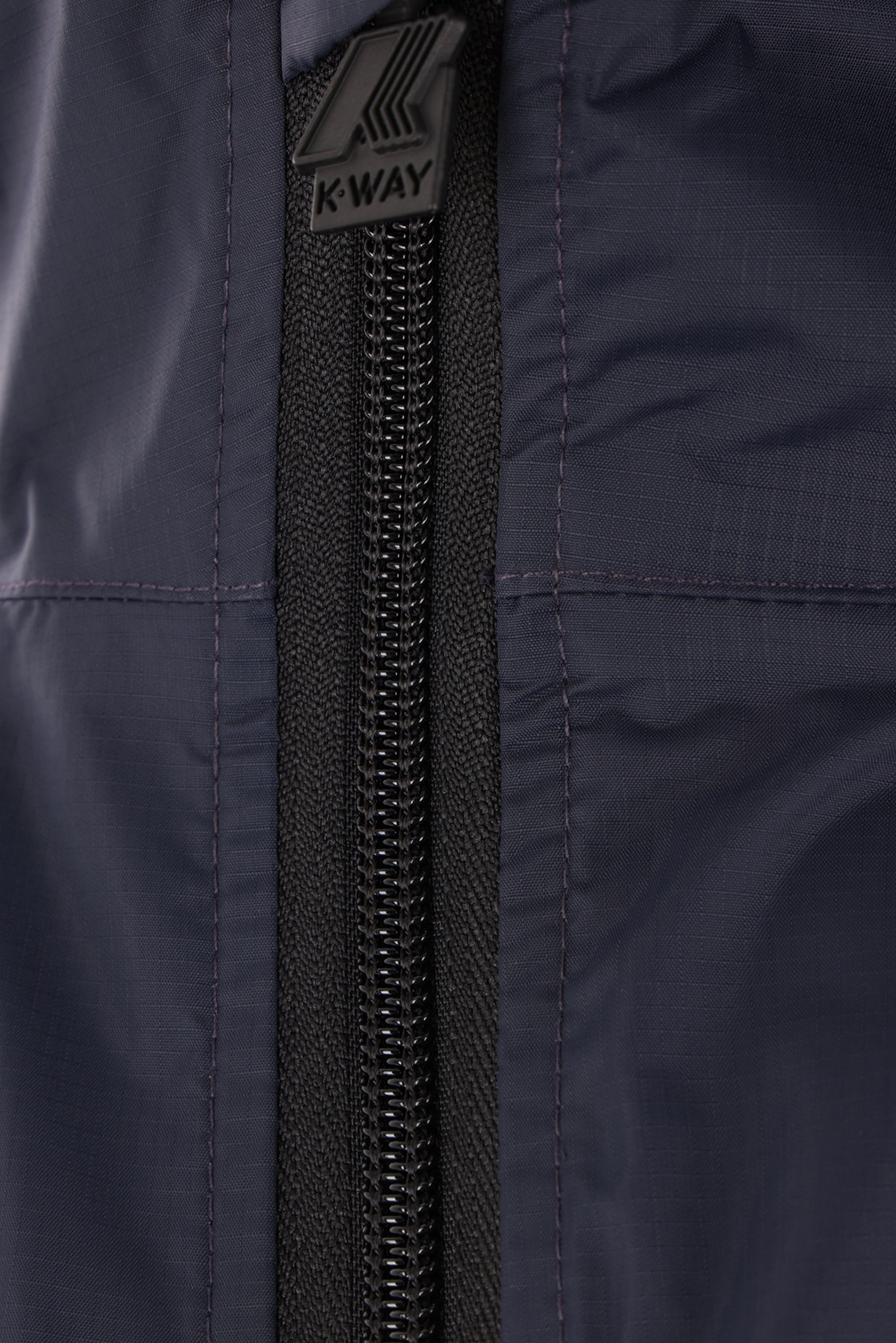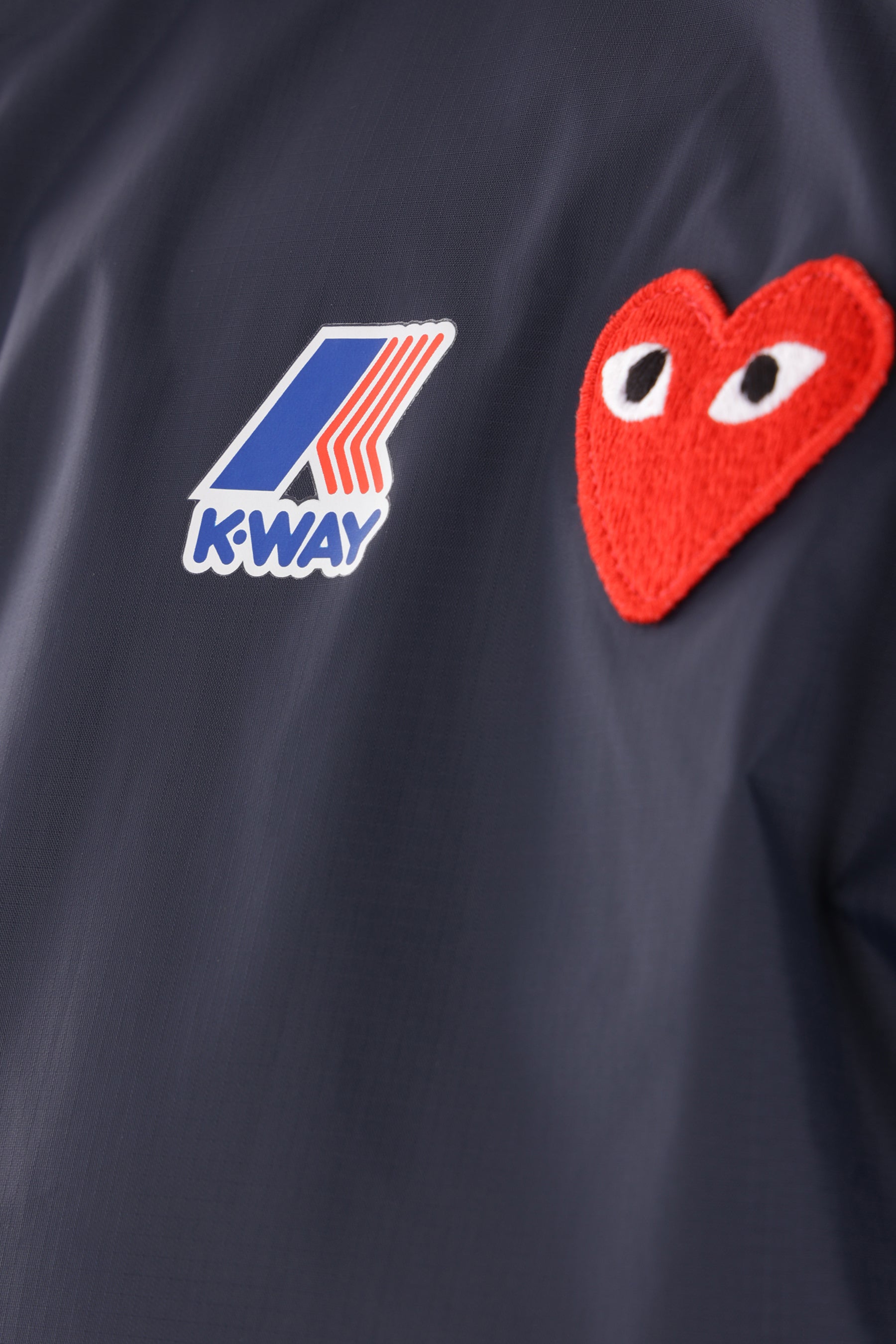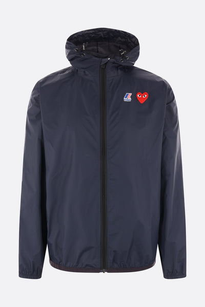 Comme des Garçons Play windbreaker designed in collaboration with K-Way and crafted from blue nylon. Featuring a drawstring hood, front zip closure, zippered side pockets, long sleeves, and elasticated trims. Unlined interior. The design is completed with K-Way branding and the signature Heart patch on the chest and back.