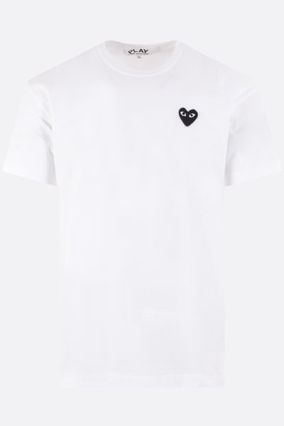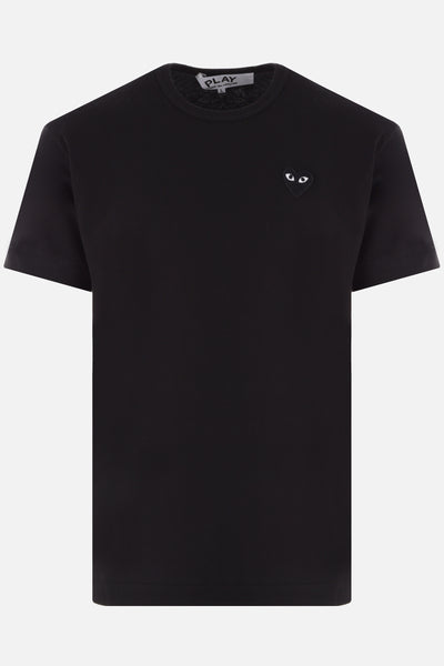 Comme des Garçons Play t-shirt crafted from black cotton jersey, featuring the signature embroidered Heart patch on the chest. Designed with a crew neckline, short sleeves, and a straight hem.