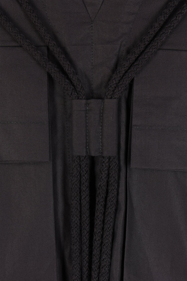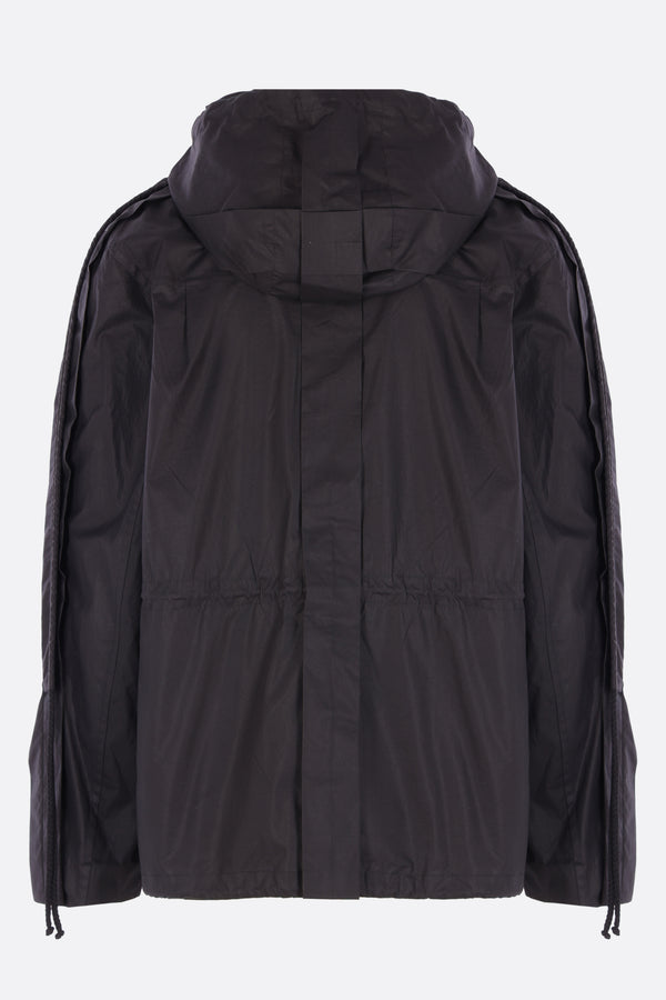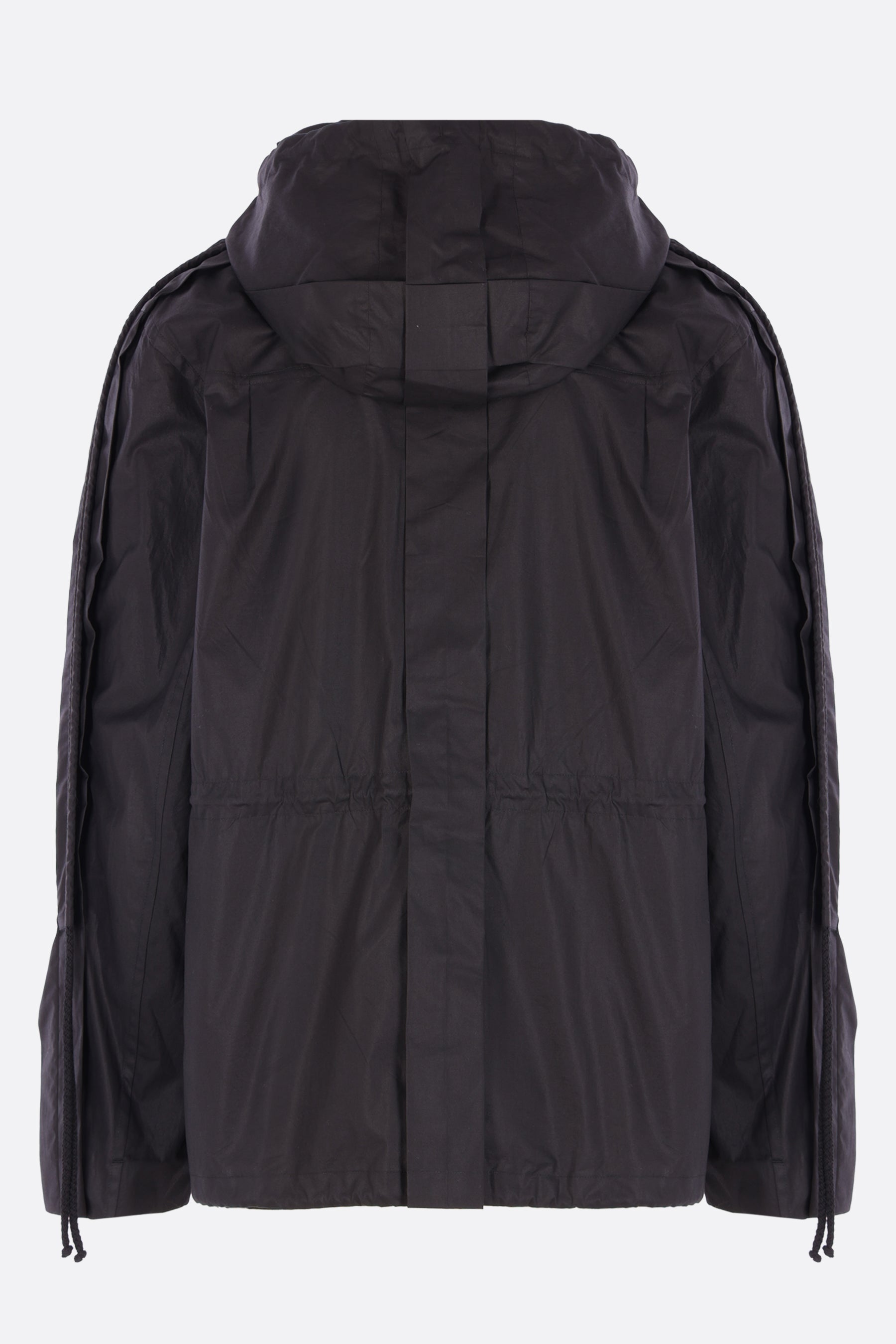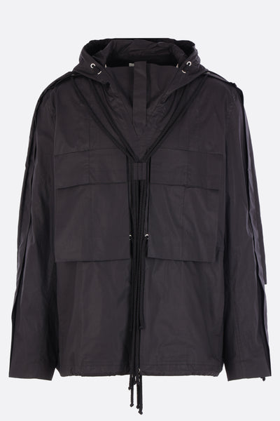 Craig Green anorak crafted from black cotton. Featuring a high collar with hood, multiple pockets, long sleeves, straight hem, all-over rope drawstrings, and unlined interior.